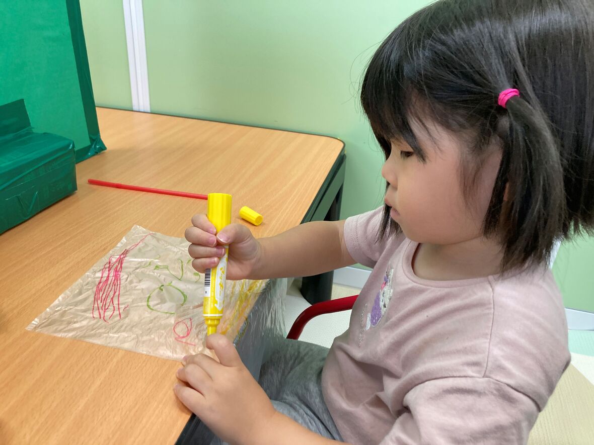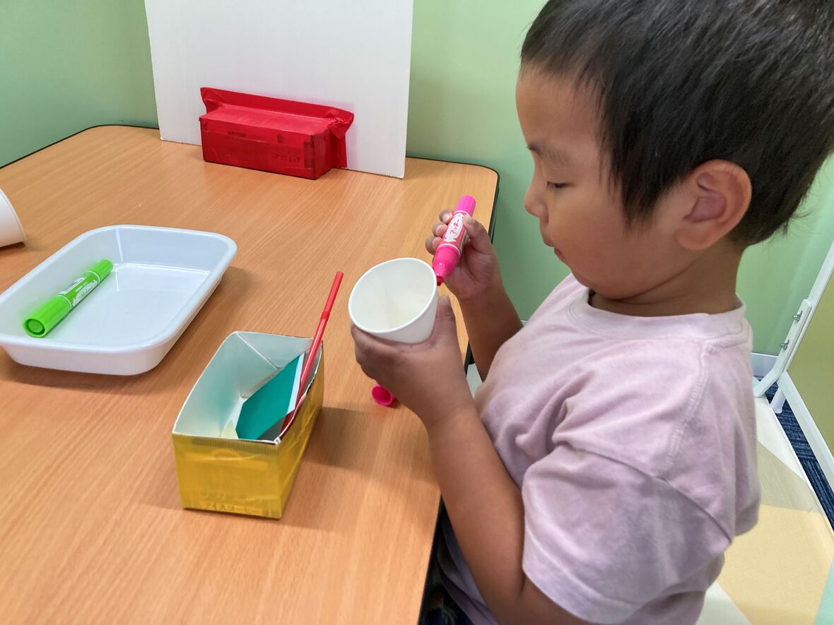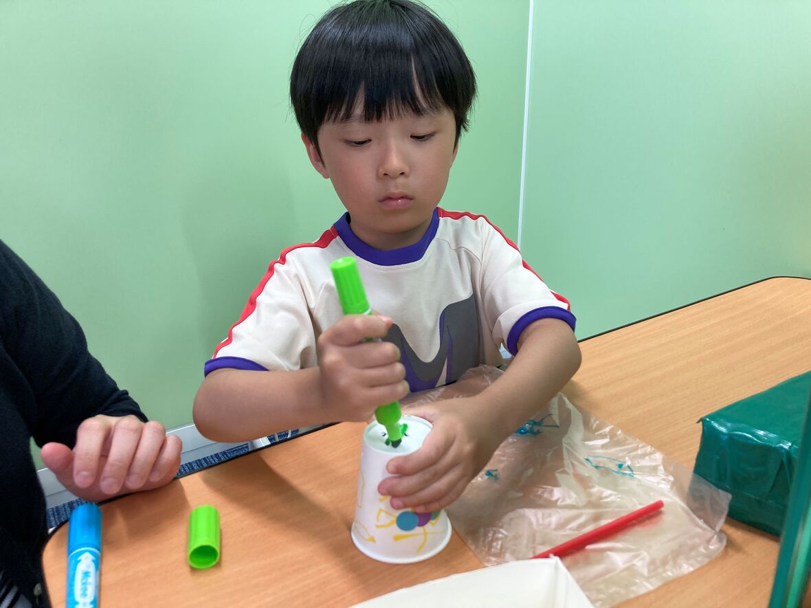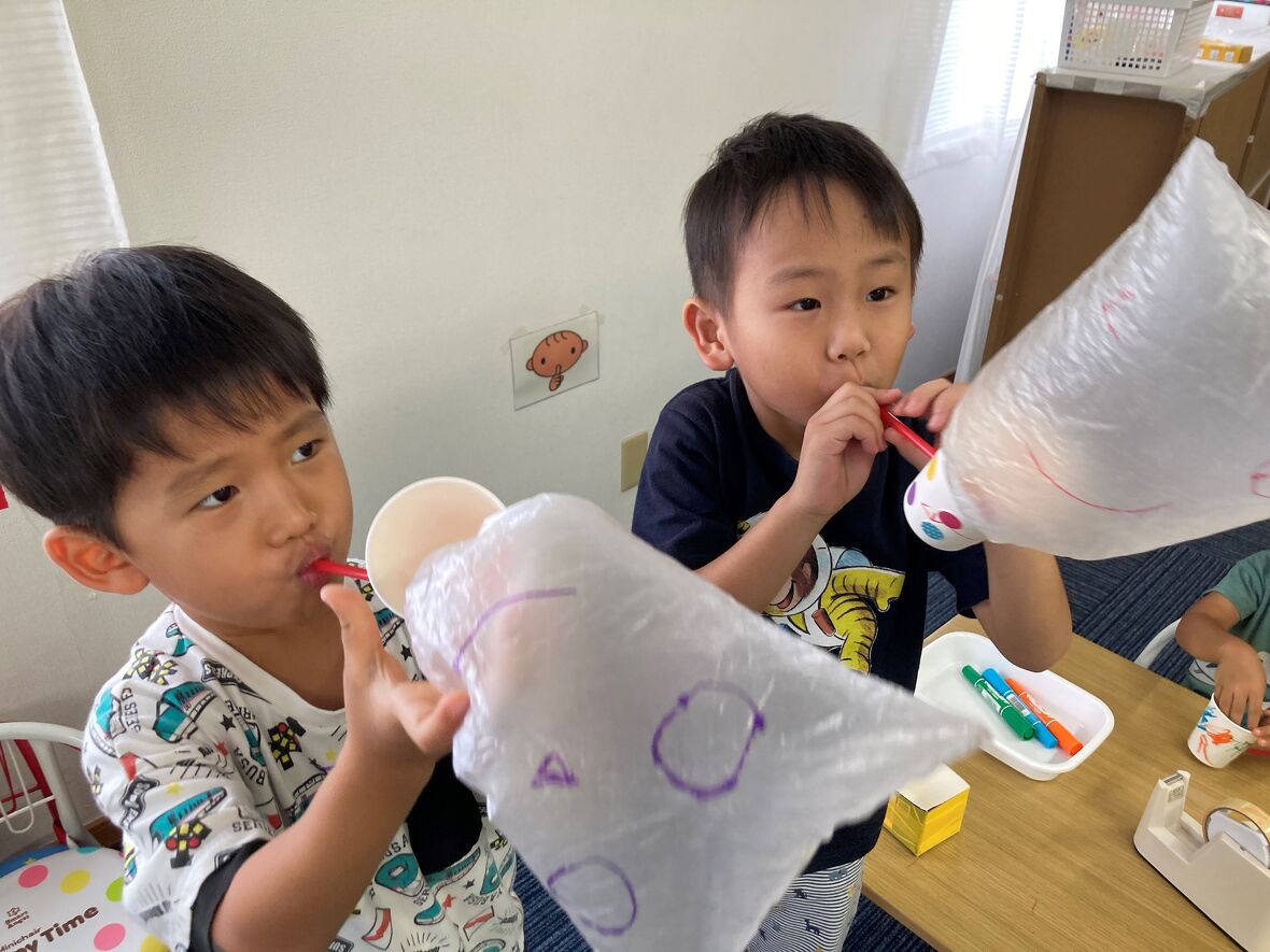 2024年08月19日(月) スタッフブログ フーフーおばけ! 今日は製作で「フーフーおばけ」を作りました!まず、ビニール袋におばけの顔をペンで自由に描き、紙コップにもペンとシールを貼って飾り付けをします。次に紙コップに穴を開けストローを刺し、おばけの絵を描いたビニール袋をセロハンテープで空気が漏れないように貼り付けると「フーフーおばけ」の完成です! おばけの顔を描いてます。怖いぞ~ 紙コップにも模様を描きますね。 真剣です! 完成!息を吹き込むと、おばけが出てくるよ~!