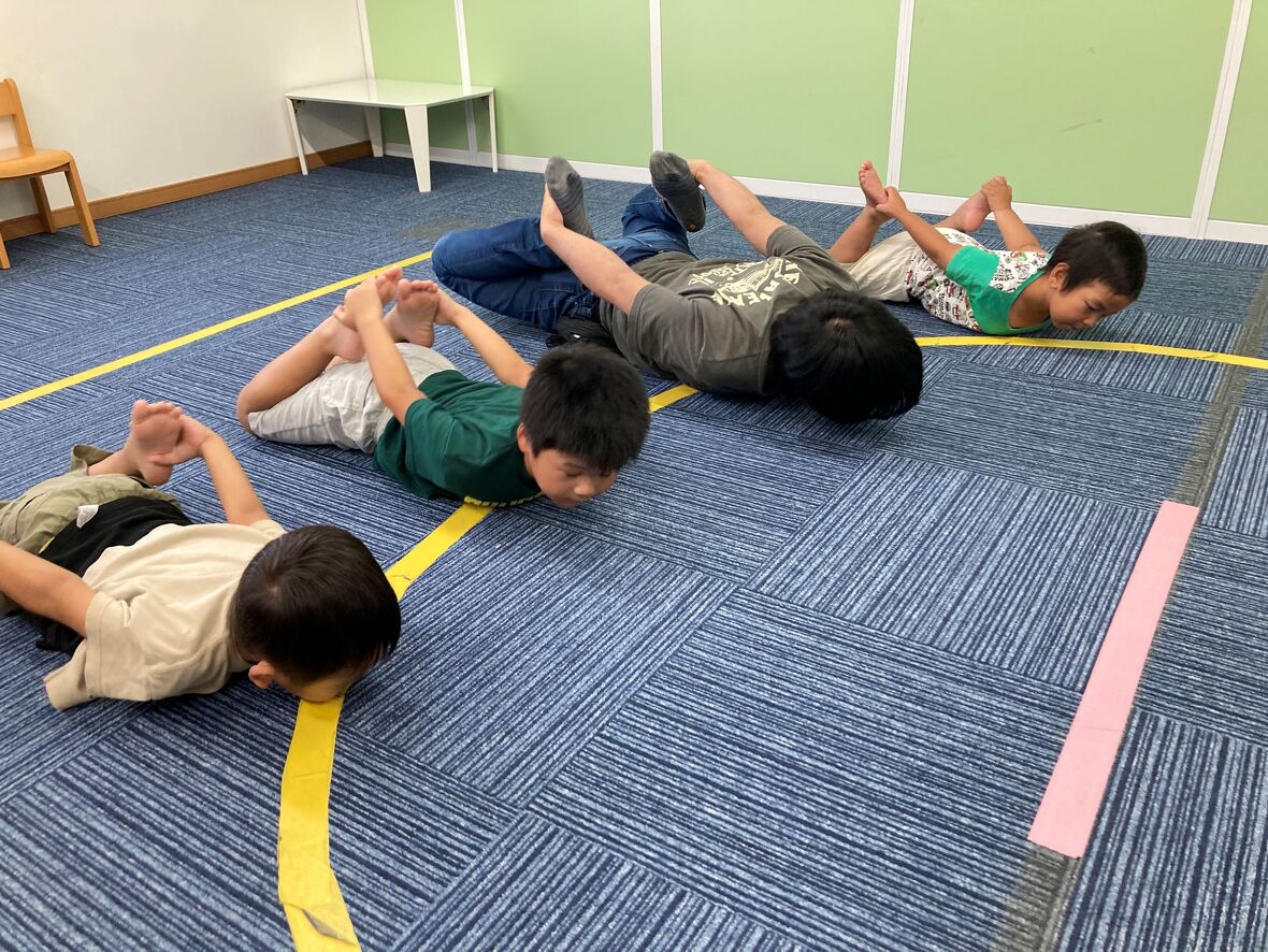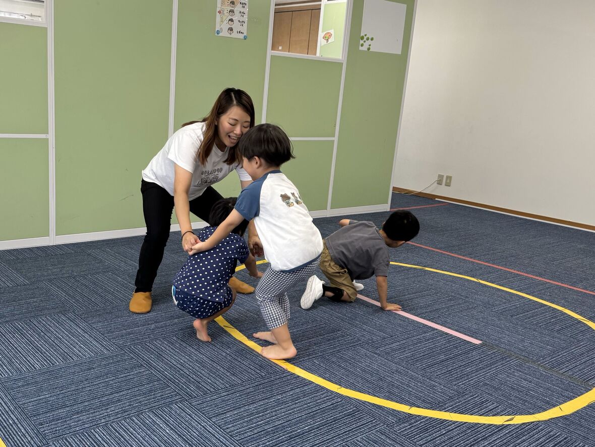 2024年08月26日(月) スタッフブログ リトミック♩ 今日の活動はリトミックです♩先生がピアノで弾くいろいろな音楽に合わせて、体をしっかりと動かしていきます!歩いたり、走ったり、動物に変身してみんなで楽しみました♩ まずは柔軟体操! カエルポーズで大きくジャンプするよ~ 「ロンドン橋落ちた」の歌に合わせて、、、 橋が落ちちゃった~
