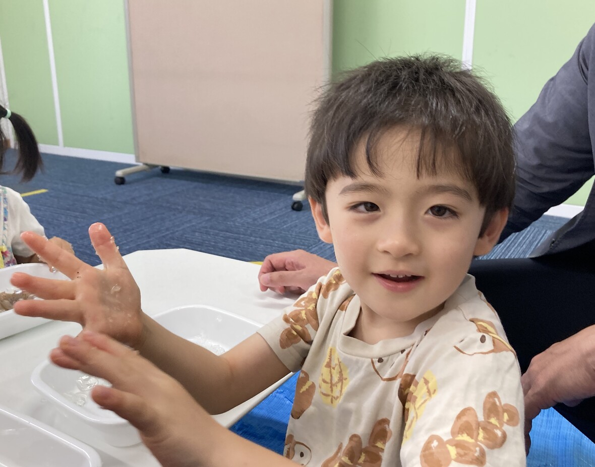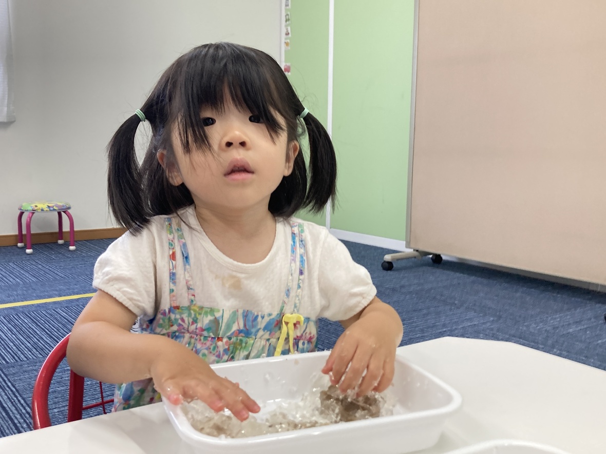 2024年09月05日(木) スタッフブログ 寒天ゼリーで「感触遊び」 今日は寒天ゼリーを使った「感触遊び」。「冷た~い」「プルンプルンしてる」「手の中でグジュ!」など・・・指や掌で感じる様々な感触は、子どもたちの感覚機能を高めるうえで、とても重要です。。 不思議な感触! 「へっちゃら」で~す おそるおそる指先で・・・。