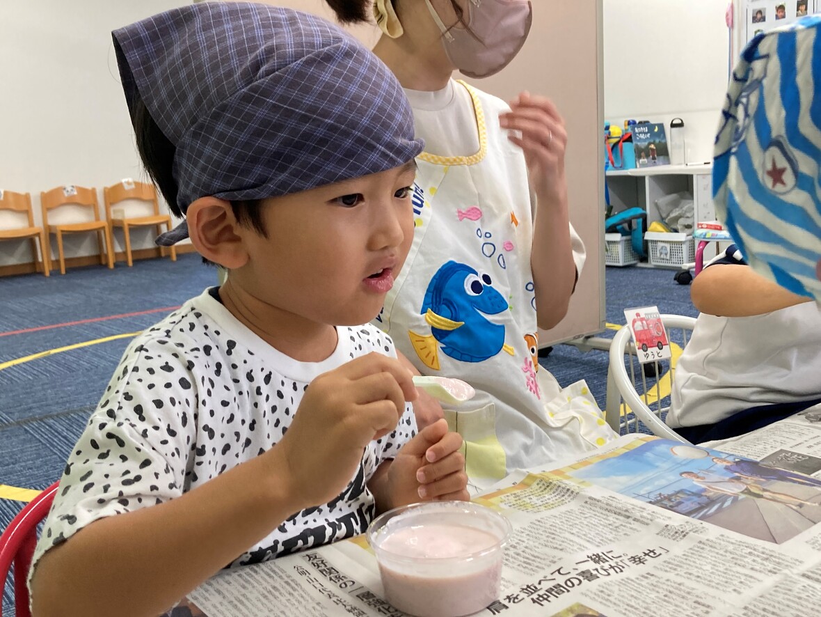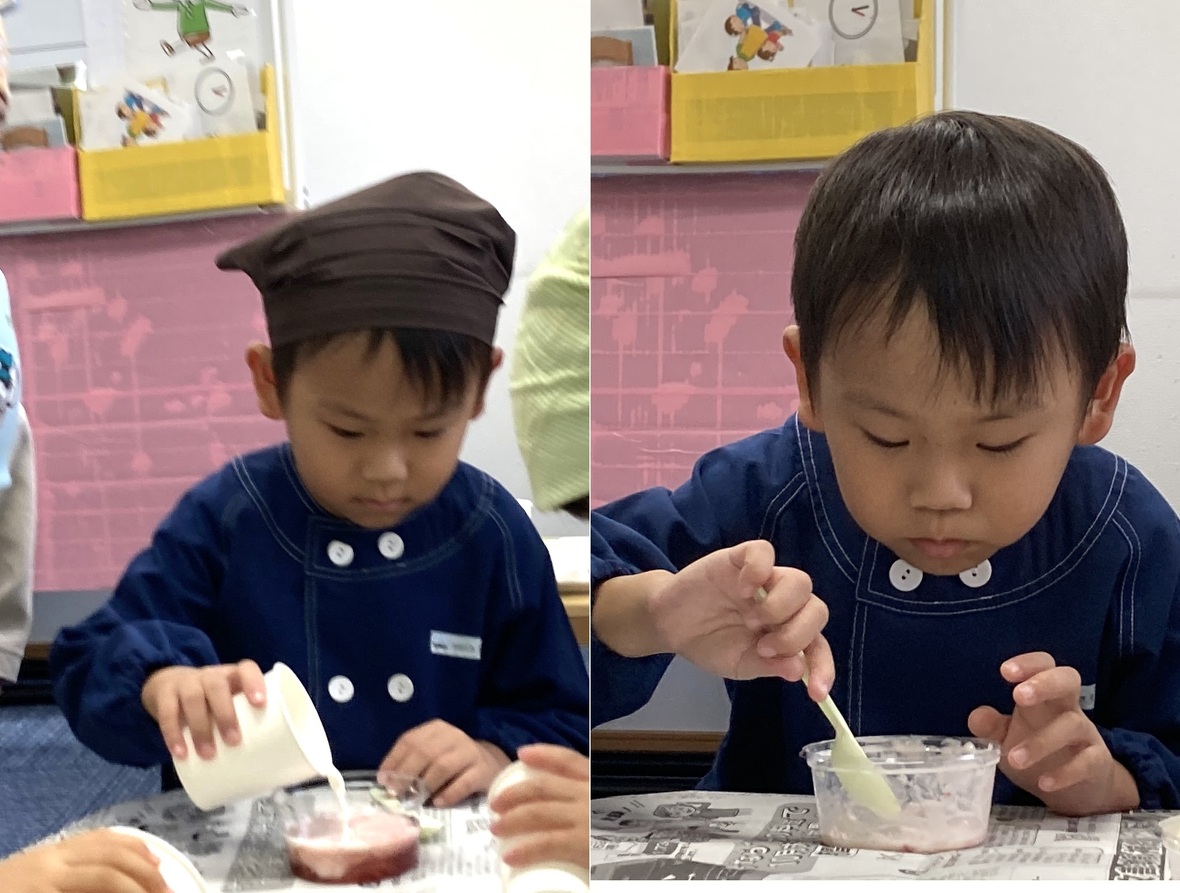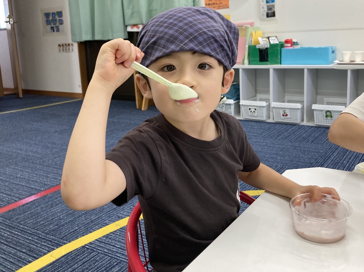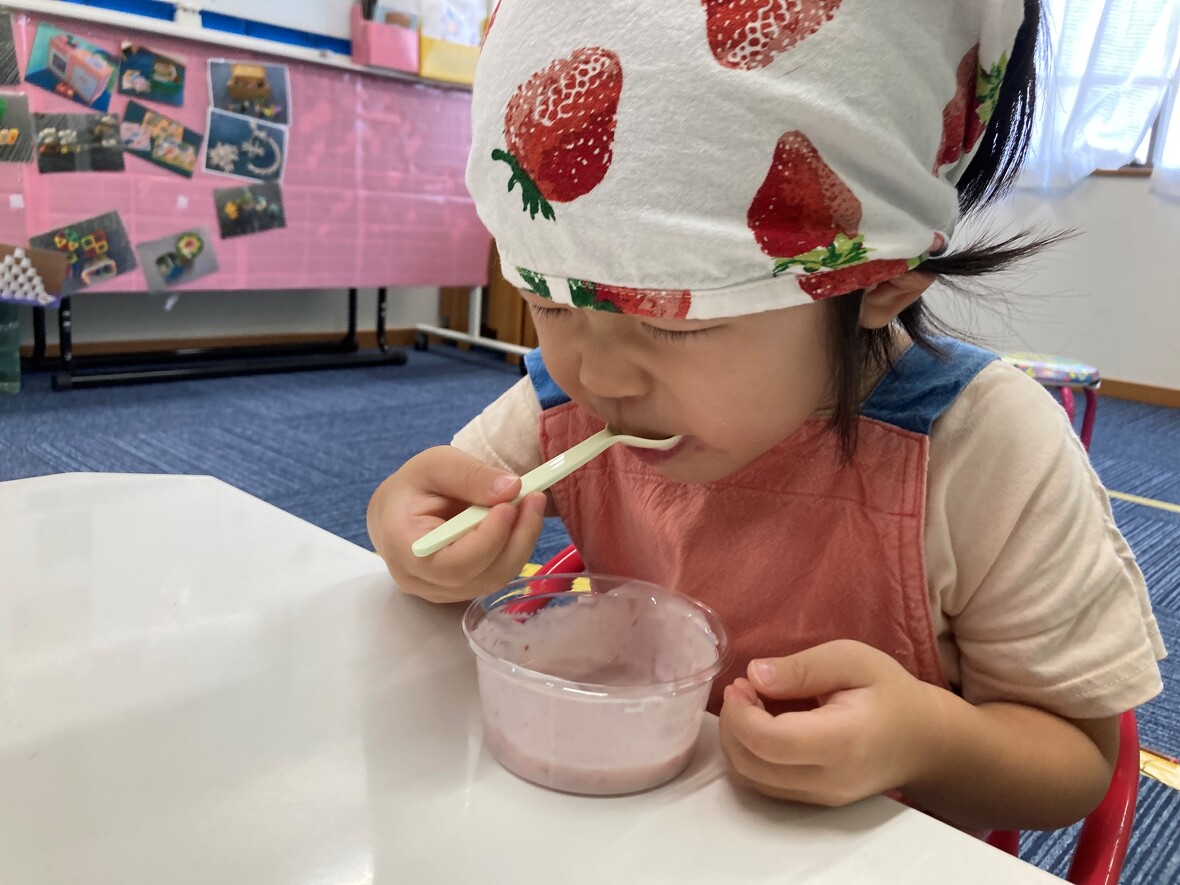 今日は、みんなでおやつ作り!今日のメニューは冷たい牛乳とイチゴ味のベースを混ぜてつくるあのスイーツ「?ルーチェ」です。エプロンとキッチン頭巾をつけて準備完了!あとはひたすらスプーンでまぜまぜ・・・。自分で作ったおやつは美味しいな!!!これから、子どもたちといろいろな料理にチャレンジしていきますね!