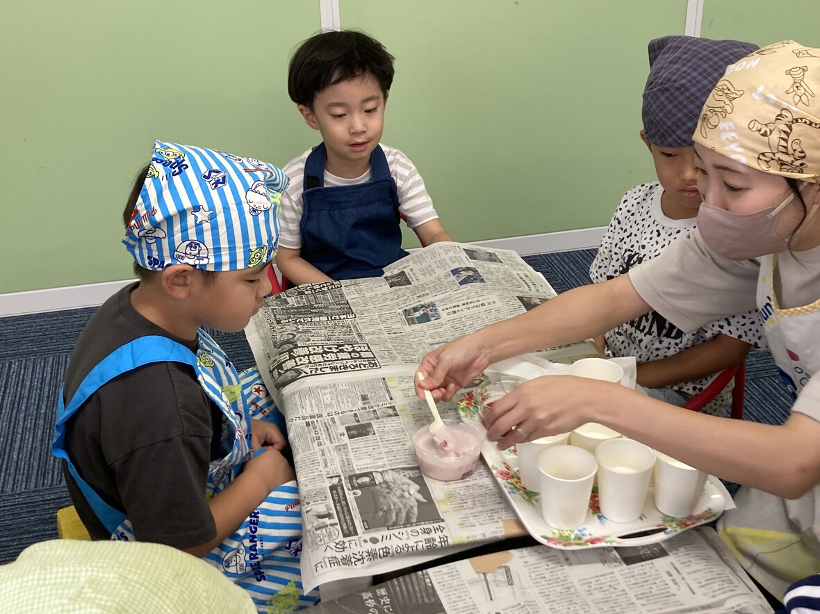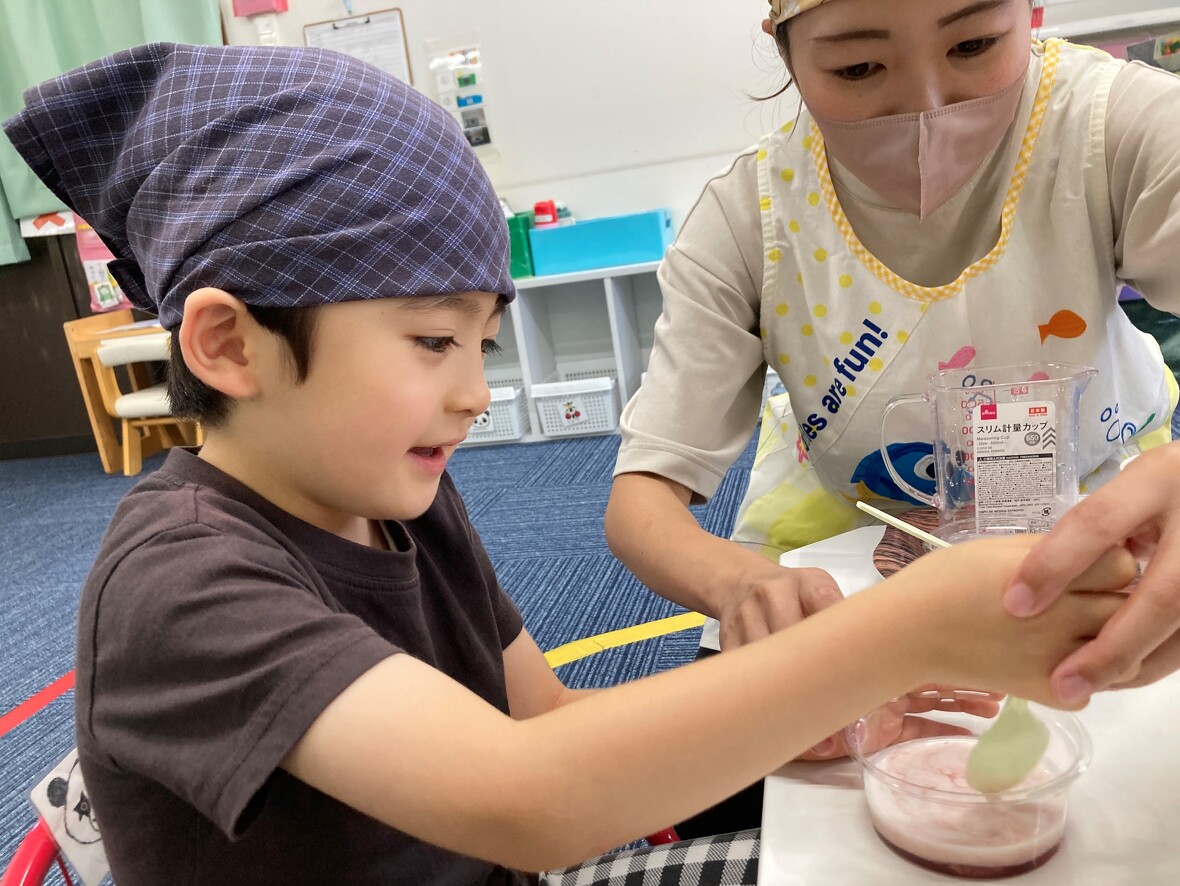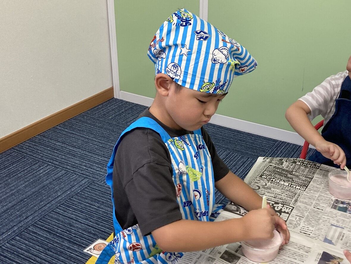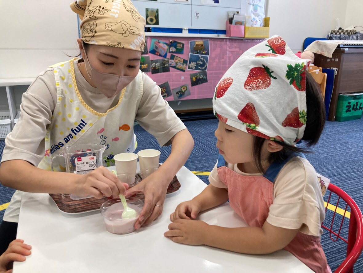 今日は、みんなでおやつ作り!今日のメニューは冷たい牛乳とイチゴ味のベースを混ぜてつくるあのスイーツ「?ルーチェ」です。エプロンとキッチン頭巾をつけて準備完了!あとはひたすらスプーンでまぜまぜ・・・。自分で作ったおやつは美味しいな!!!これから、子どもたちといろいろな料理にチャレンジしていきますね!