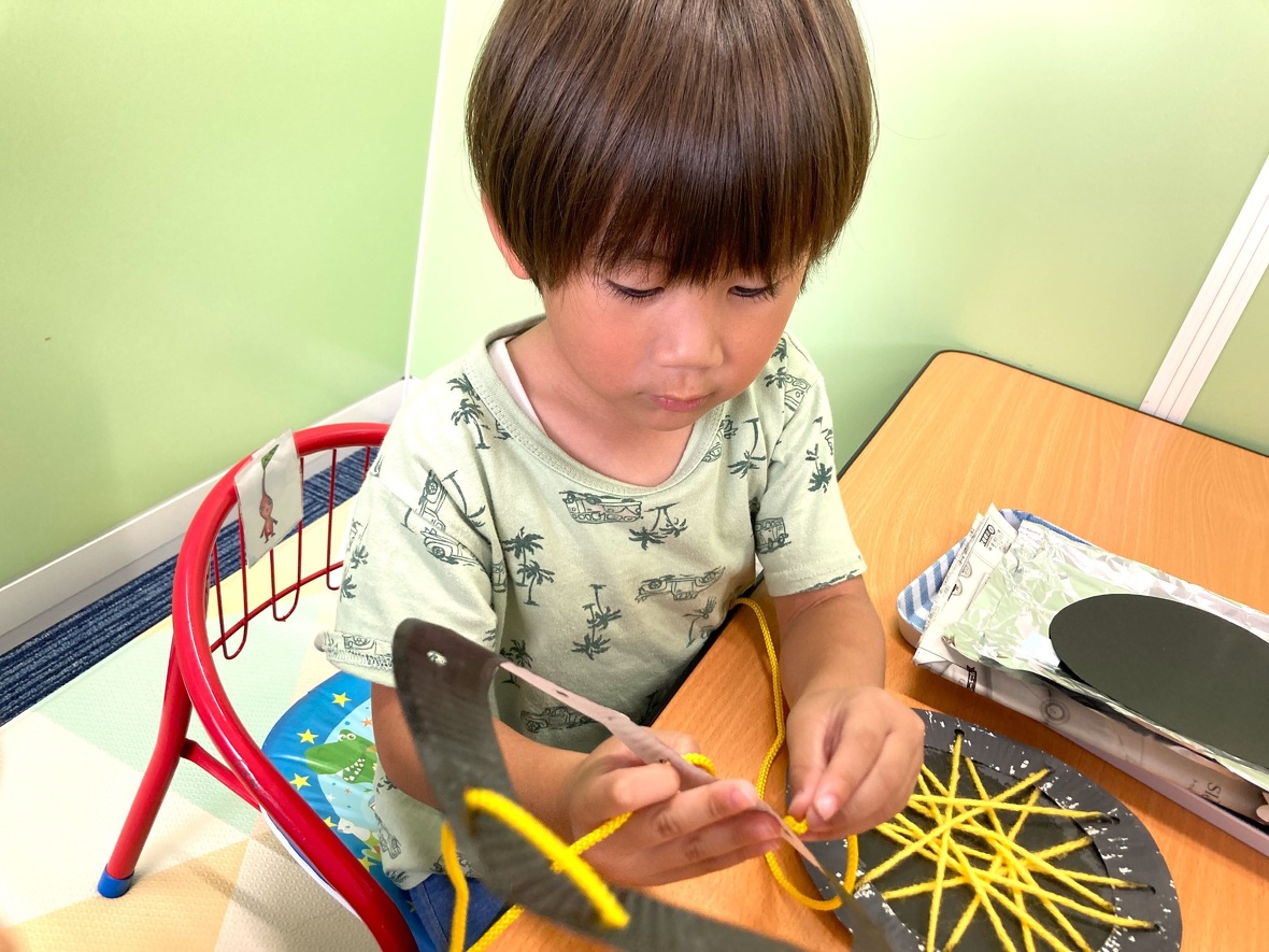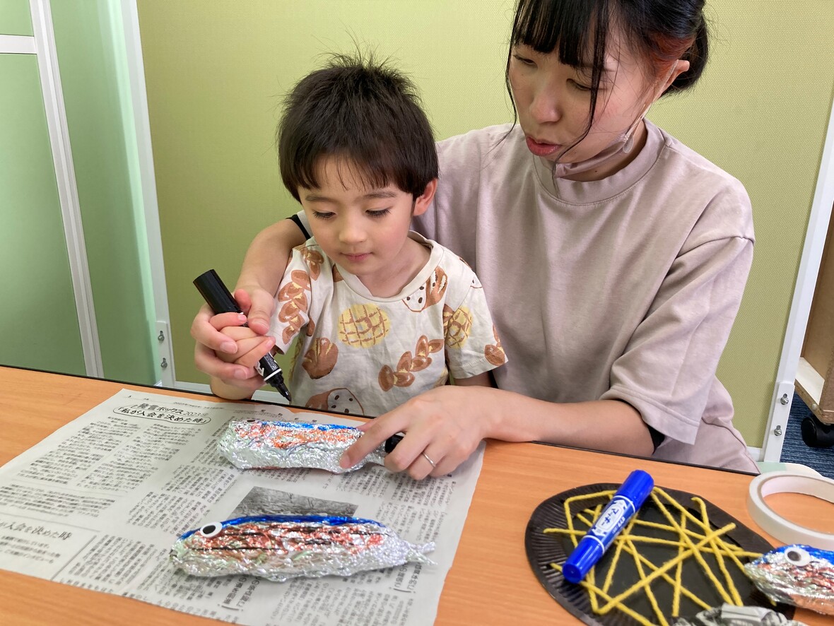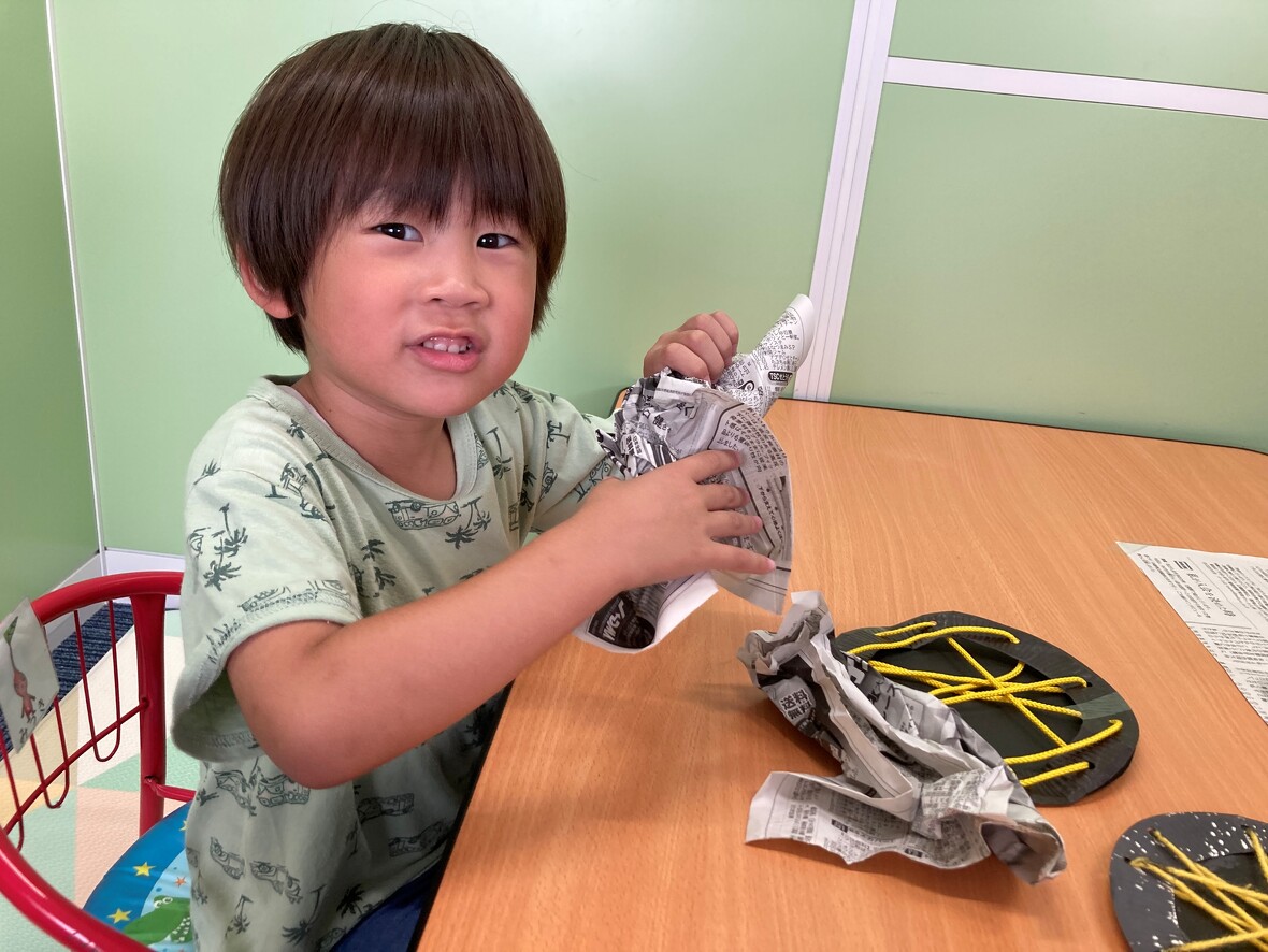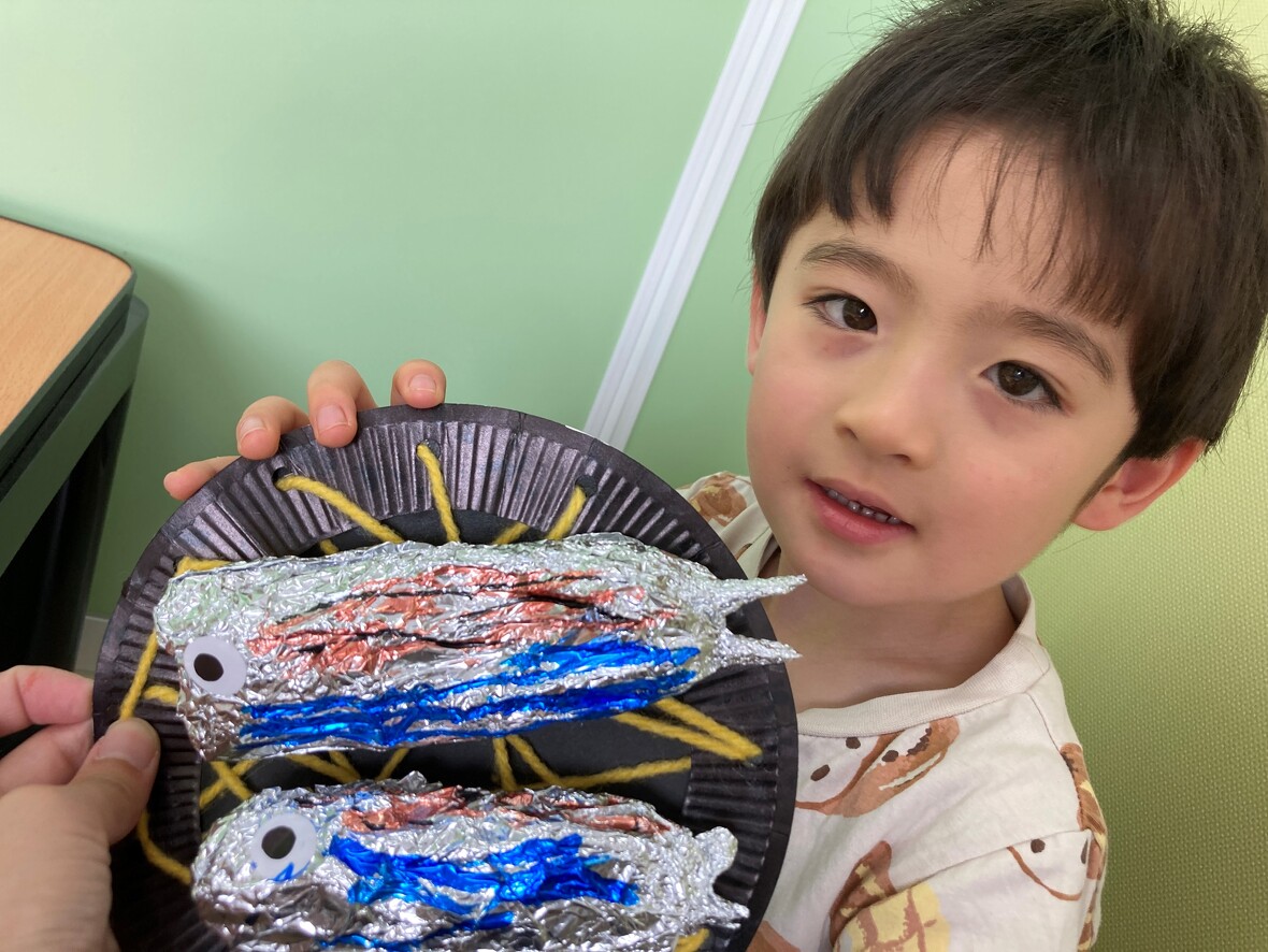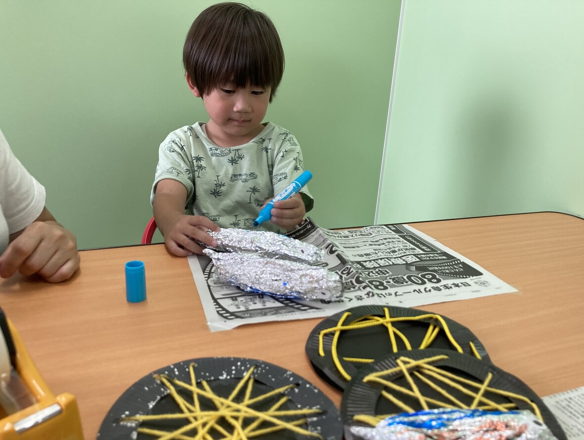 2024年10月15日(火) スタッフブログ 今日はサンマを焼こう!(製作) 秋の味覚といえば・・・サンマ!なんといっても焼いたサンマは最高ですね!今日はみんなでサンマを焼きました・・・といっても、本当は新聞紙とアルミホイルでつくったサンマです!できあがりは本物みたい! 最初は焼き網を作ります! これがサンマの材料? 新聞紙を長細く丸めて・・・ アルミホイルでくるんでから 色を塗ったら・・・ 美味しそうなサンマの網焼きができあがり~