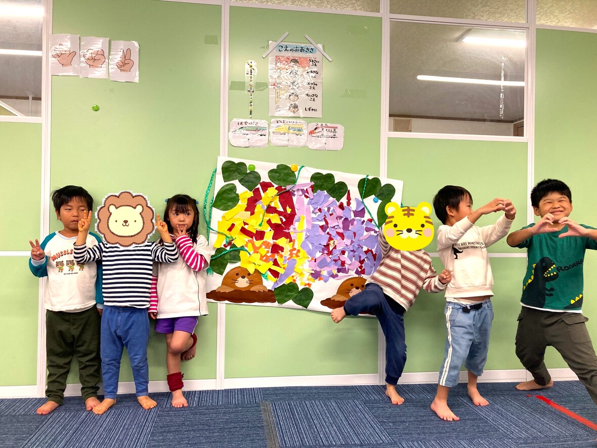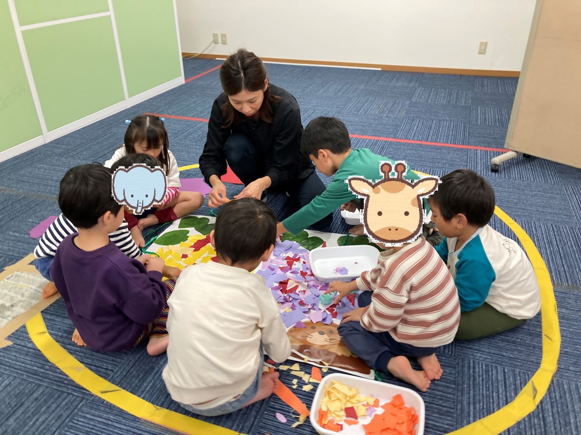 2024年11月18日(月) スタッフブログ みんなで協力!大きな「ちぎり絵」をつくりました!!!! 今日はみんなで大きな「ちぎり絵」をつくりました!題材は「サツマイモ」・・・。おイモをねらっているモグラも登場します!上手にできたね! 色紙を小さくちぎって・・・ みんなで下絵のうえに貼っていきます! 完成しました。ハイ!ポーズ!