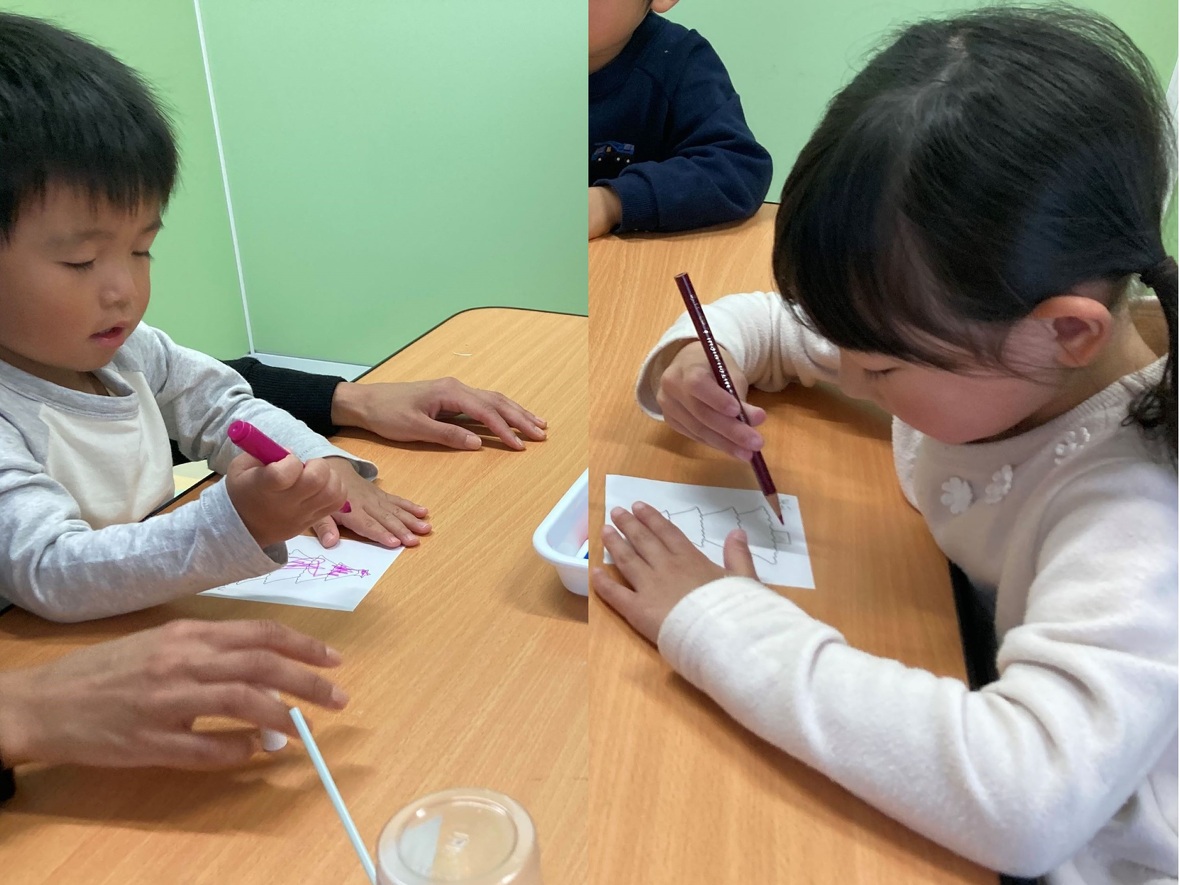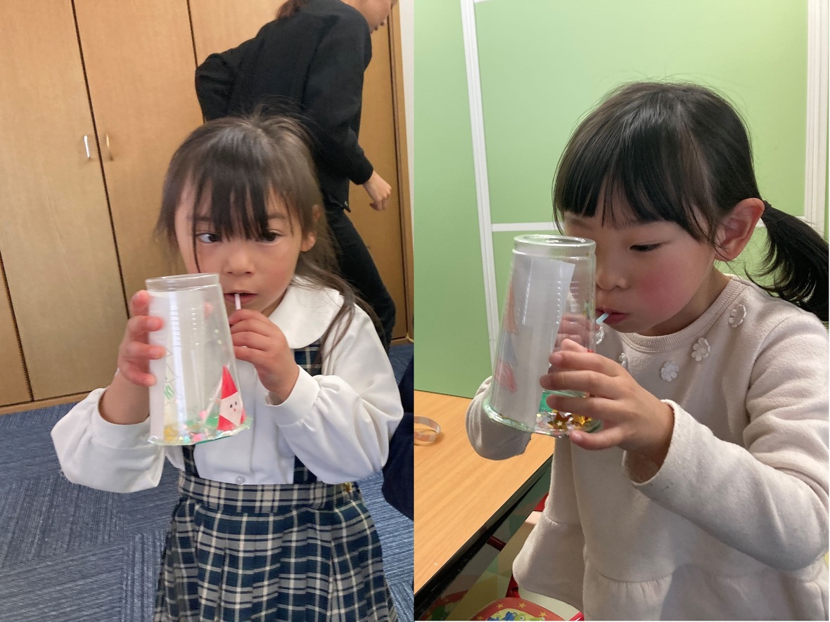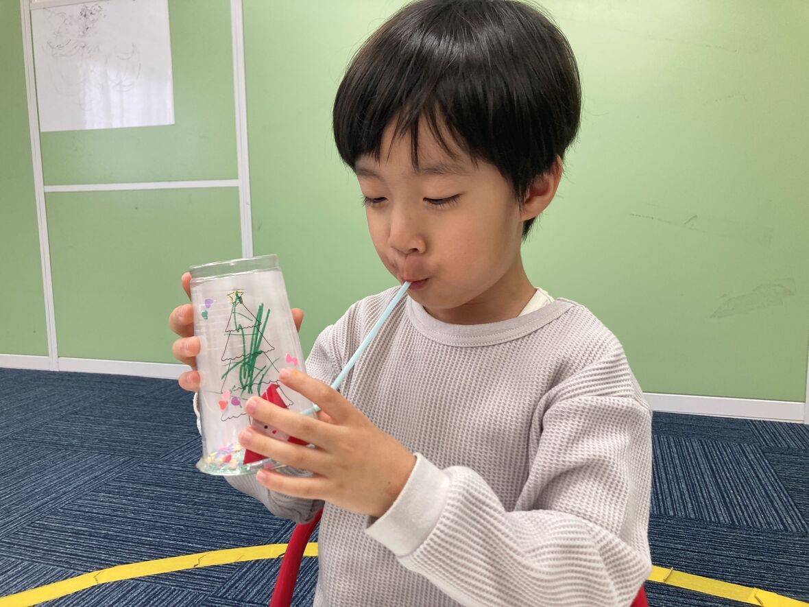 2024年12月03日(火) スタッフブログ スノードームを手作りしました! 今日はプラスティックのコップを使った「スノードームの手作り」に挑戦!まずはカップの内側に貼り付けるクリスマスツリーの絵を描きました。このスノードームは液体を入れずに、ストローで空気を吹き込むことで、中に入ったスパンコールが舞うようにしています。みんな上手にできたのでクリスマスに飾ってね! ツリーの絵を描いたら、カップの内側に貼って、スパンコールを投入! ツリーの絵に色をつけていきましょう どんな色がいいかなあ? プゥーと息を吹き込むと・・・ 中でスパンコールが舞ってキラキラ!