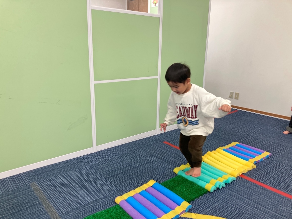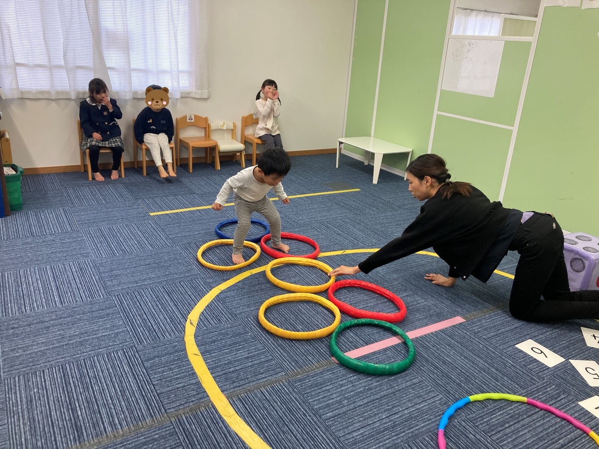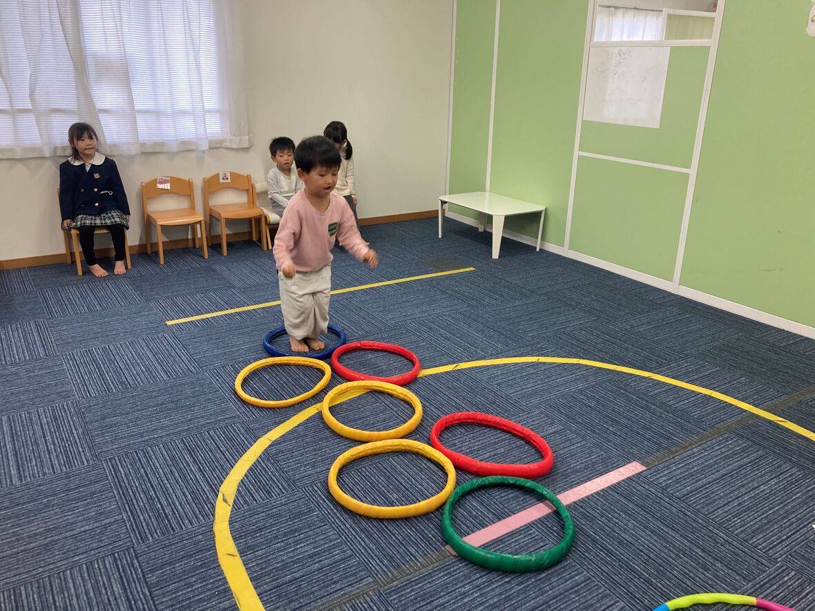 2024年12月04日(水) スタッフブログ サーキット遊びを楽しもう! サーキット遊びは、いろいろな運動を組み合わせたコースを順番にまわりながら、バランスよく体力を養う運動です!みんな上手にできてますよ! ウレタンマットの上を歩いて足裏を刺激! フープの数に合わせて足を閉じて、開いて、閉じて・・・交互にジャンプ! 上手にジャンプできてますよ! がんばれ!がんばれ!