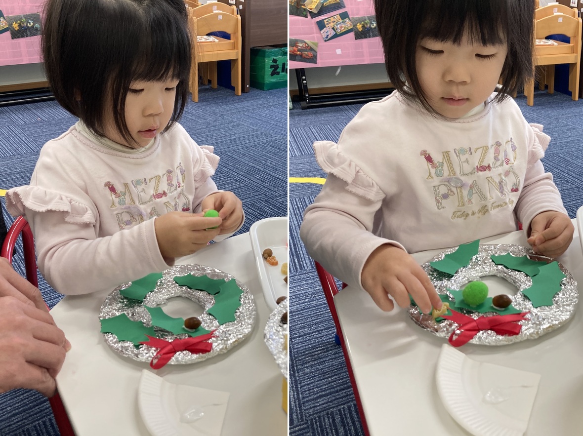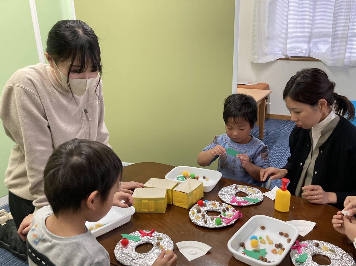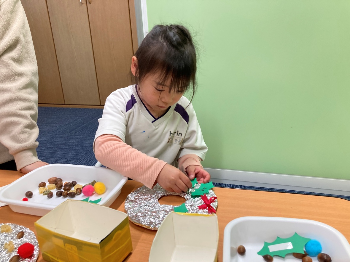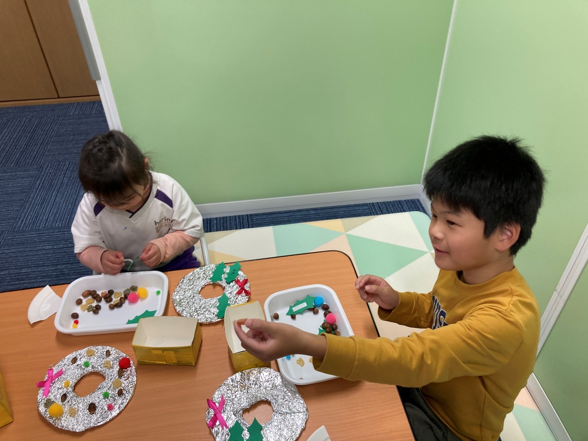 2024年12月12日(木) スタッフブログ クリスマスリースを作りました! もうすぐクリスマス!今日はみんなでクリスマスリースの手作りにチャレンジしました!上手にできたから、サンタさんもビックリ!!! ヒイラギの葉っぱをペタペタ! ドングリもあるよ~ 飾りが落ちないように木工用ボンドでしっかりつけよう! みんな一生懸命作りました!