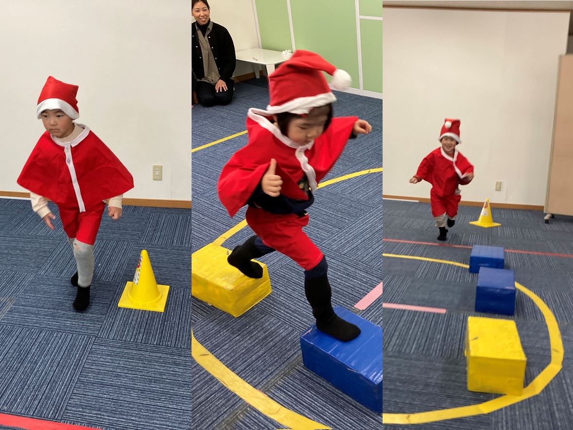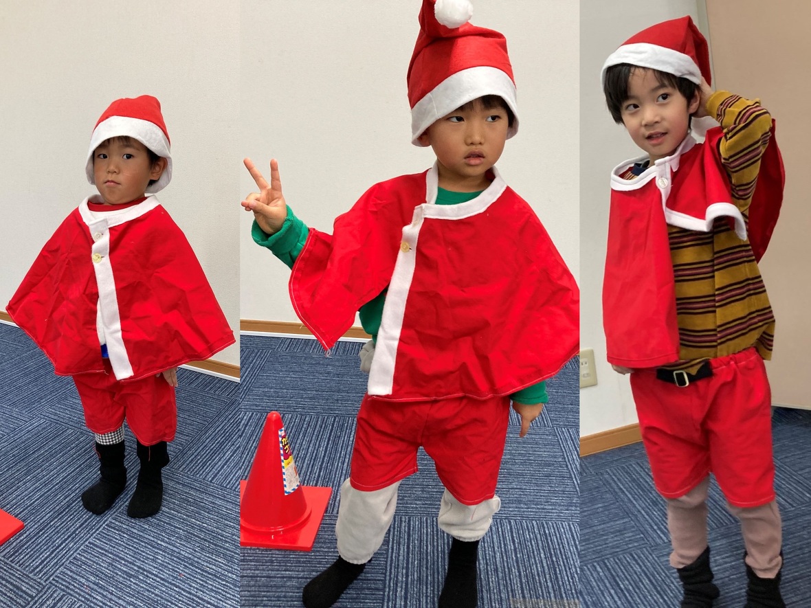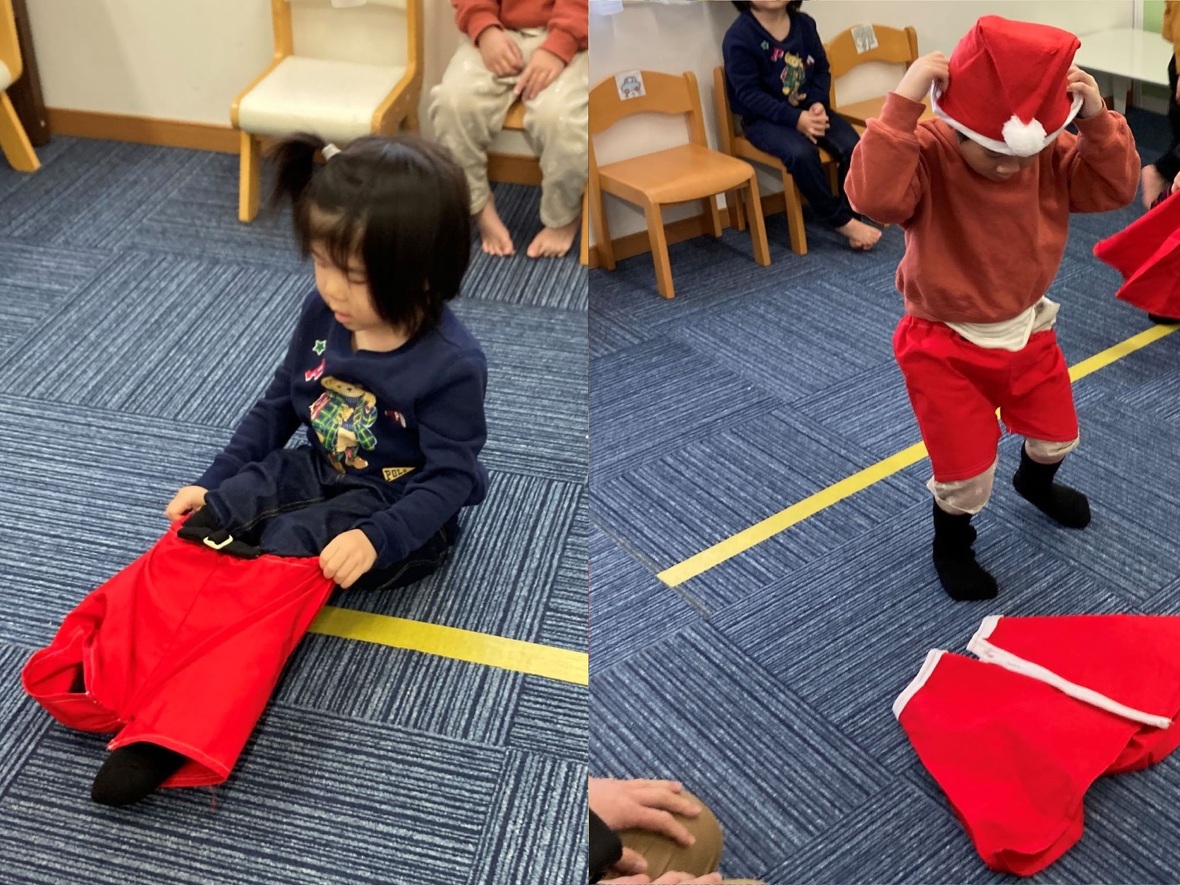 2024年12月25日(水) スタッフブログ 今日は楽しいクリスマス!小さなサンタクロースが大集合! 今日はクリスマス!みんなでクリスマスをお祝いしながら、いろいろな遊びを楽しみました!おなじみのサンタ早着替えサーキットやプレゼント探しで頑張った後は、ごほうびでサンタのカゴにお菓子をつめ放題!楽しかったね! サンタさんの服装に早着替え・・・ かわいいサンタクロースがいっぱい! サンタクロースがサーキット遊びにチャレンジ! 部屋の中にかくされたプレゼントを捜索中・・・。こんなところに? お菓子のボックスを手作りして・・・ 好きなお菓子をボックスに入れましょう 何がいいかな? ゼリーが人気? みんなで鈴を鳴らしながら、「あわてんぼうのサンタクロース」を歌いました!