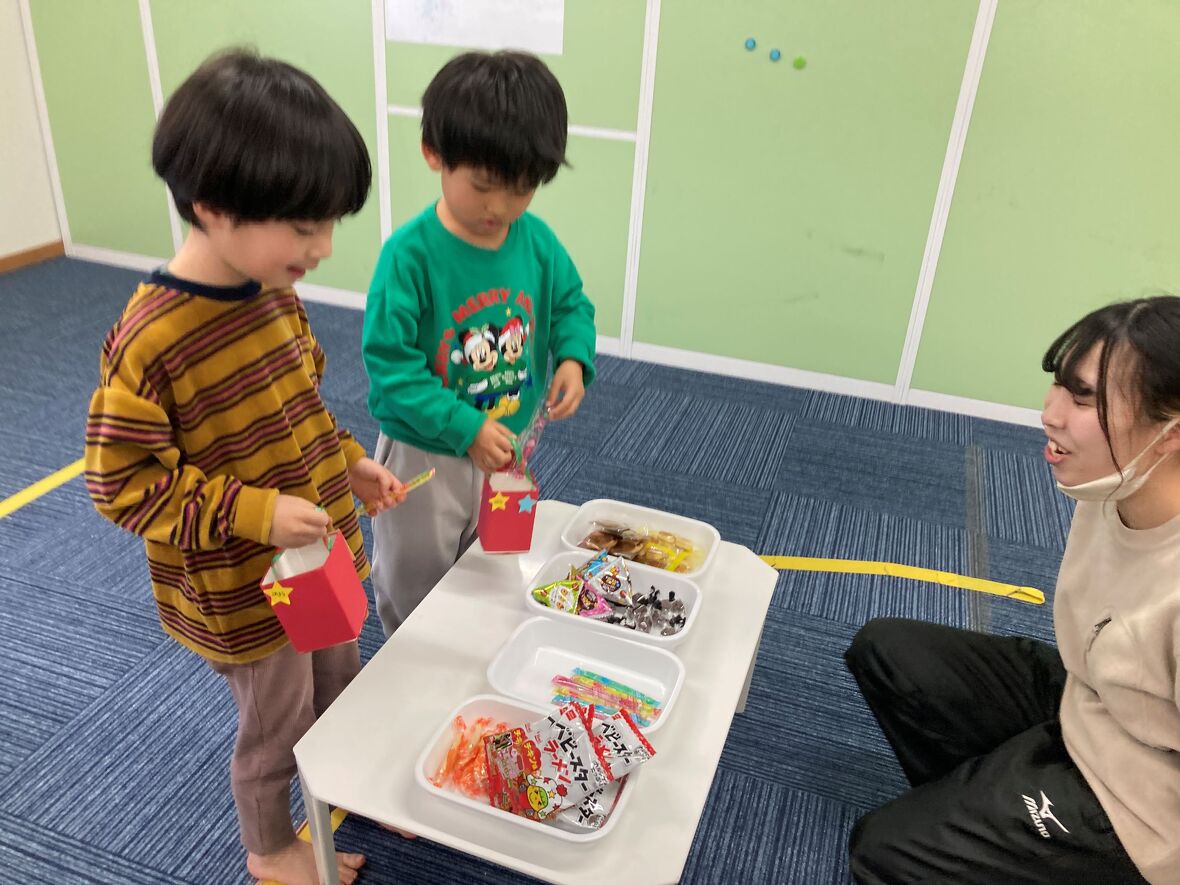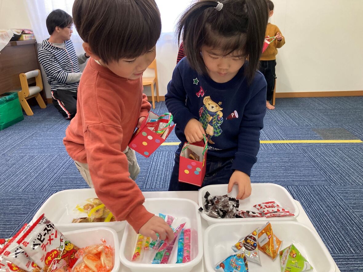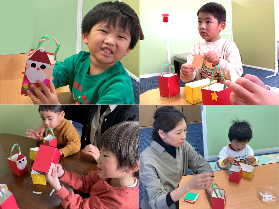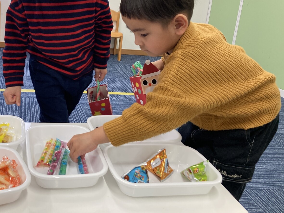 2024年12月25日(水) スタッフブログ 今日は楽しいクリスマス!小さなサンタクロースが大集合! 今日はクリスマス!みんなでクリスマスをお祝いしながら、いろいろな遊びを楽しみました!おなじみのサンタ早着替えサーキットやプレゼント探しで頑張った後は、ごほうびでサンタのカゴにお菓子をつめ放題!楽しかったね! サンタさんの服装に早着替え・・・ かわいいサンタクロースがいっぱい! サンタクロースがサーキット遊びにチャレンジ! 部屋の中にかくされたプレゼントを捜索中・・・。こんなところに? お菓子のボックスを手作りして・・・ 好きなお菓子をボックスに入れましょう 何がいいかな? ゼリーが人気? みんなで鈴を鳴らしながら、「あわてんぼうのサンタクロース」を歌いました!