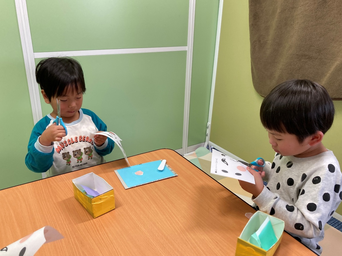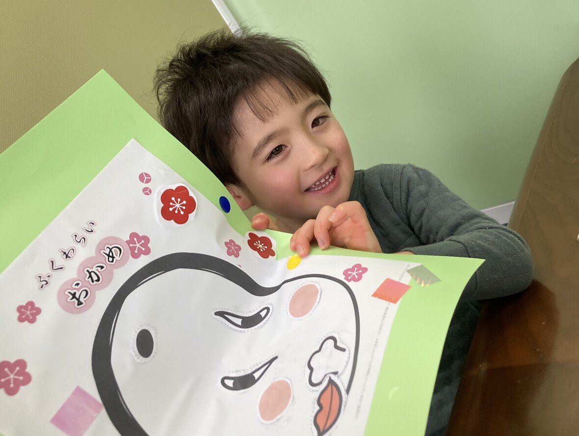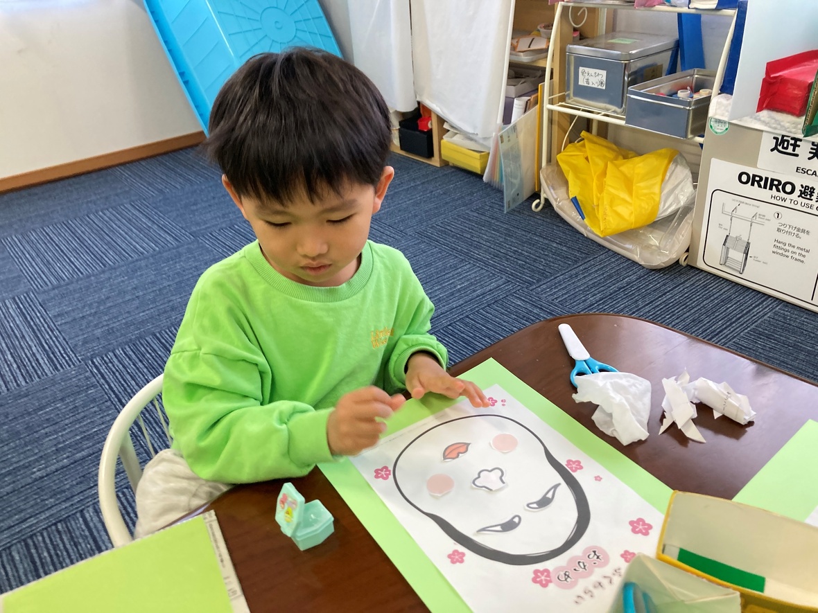 2025年01月16日(木) スタッフブログ みんなで楽しく「ふく笑い」 日本で古くから親しまれている「ふく笑い」。こどもたちにとって、顔の表情を理解するうえで効果的な遊びでもあります!顔の輪郭に合わせて、バランスをとりながら、目、鼻、口、眉、頬のパーツを貼っていきました。上手にできたね! お顔のパーツをよく見て・・・ 楽しいお顔ができあがり~ 午後のお友だちは、パーツも自分で作ります! 目や鼻、口の位置をしっかり確認しながら貼っていきます! 左右上下のバランスがよくとれていますよ!