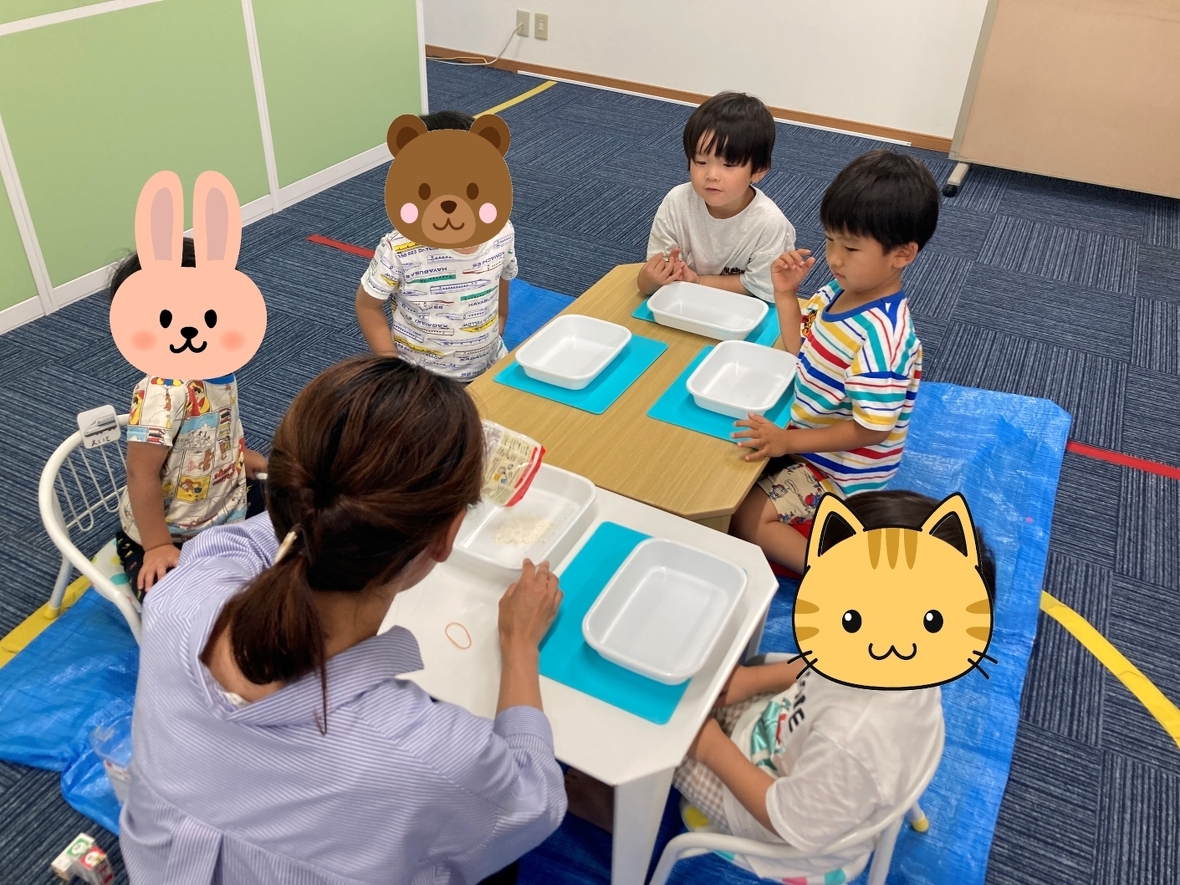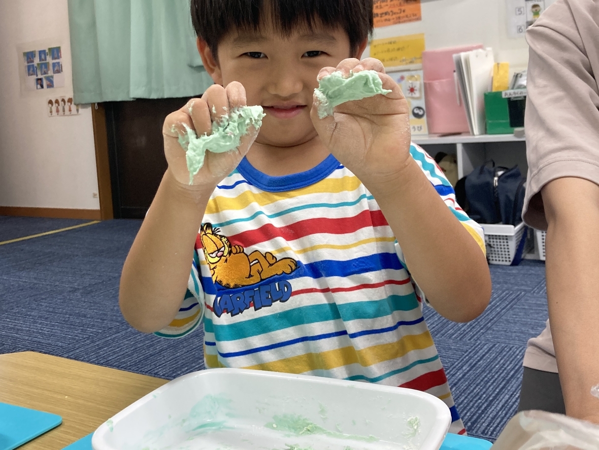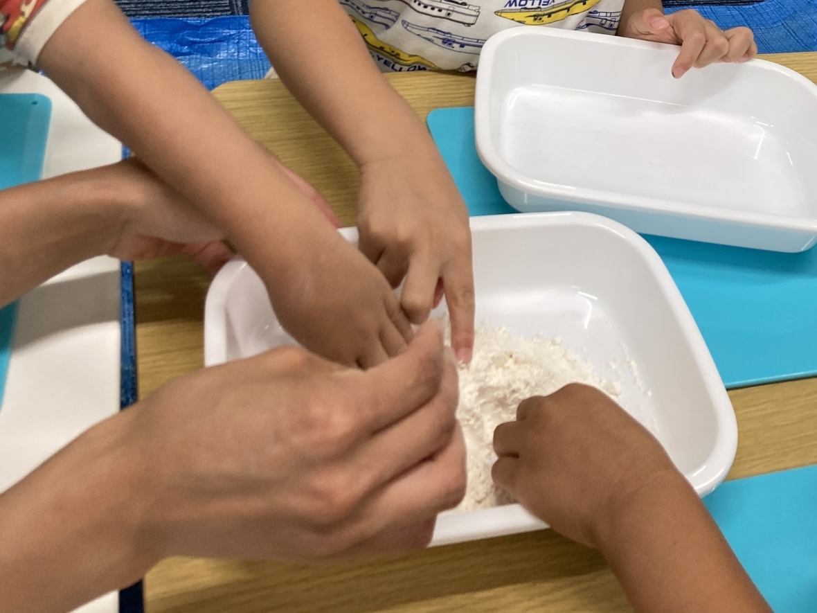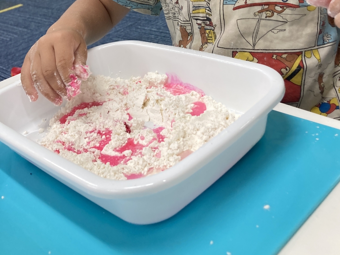 みんなで小麦粉を使って感触遊び。最初はサラサラした粉の状態から・・・少しドキドキしたけど小麦粉に人差し指で恐るおそる「ツンツン」と触ってみました。好きな色の食紅や水を混ぜると、色も変わってベトベトになって普段使っている粘土とは違うなんだか不思議な感覚・・・。手にくっついた小麦粉をぬぐいとろうとするお友だちもいたけど、さらにしっかり混ぜていくとトロトロの触感でついついさわりたくなっちゃう!!