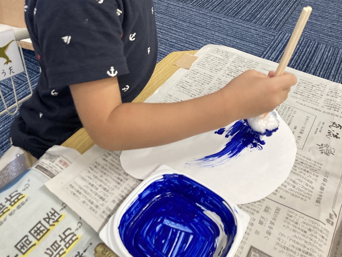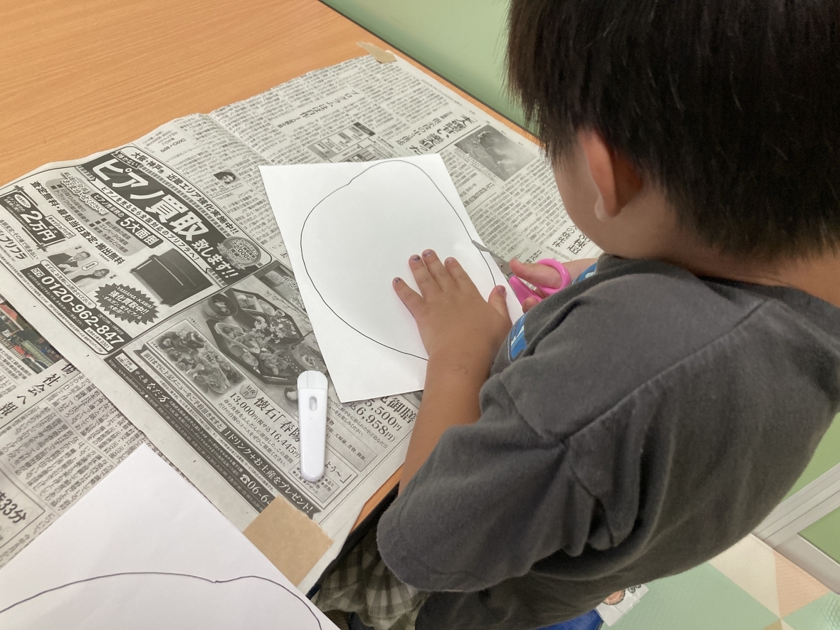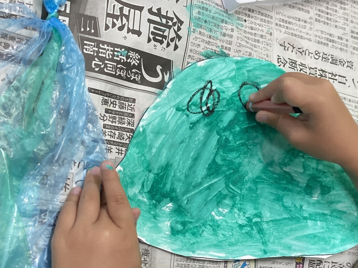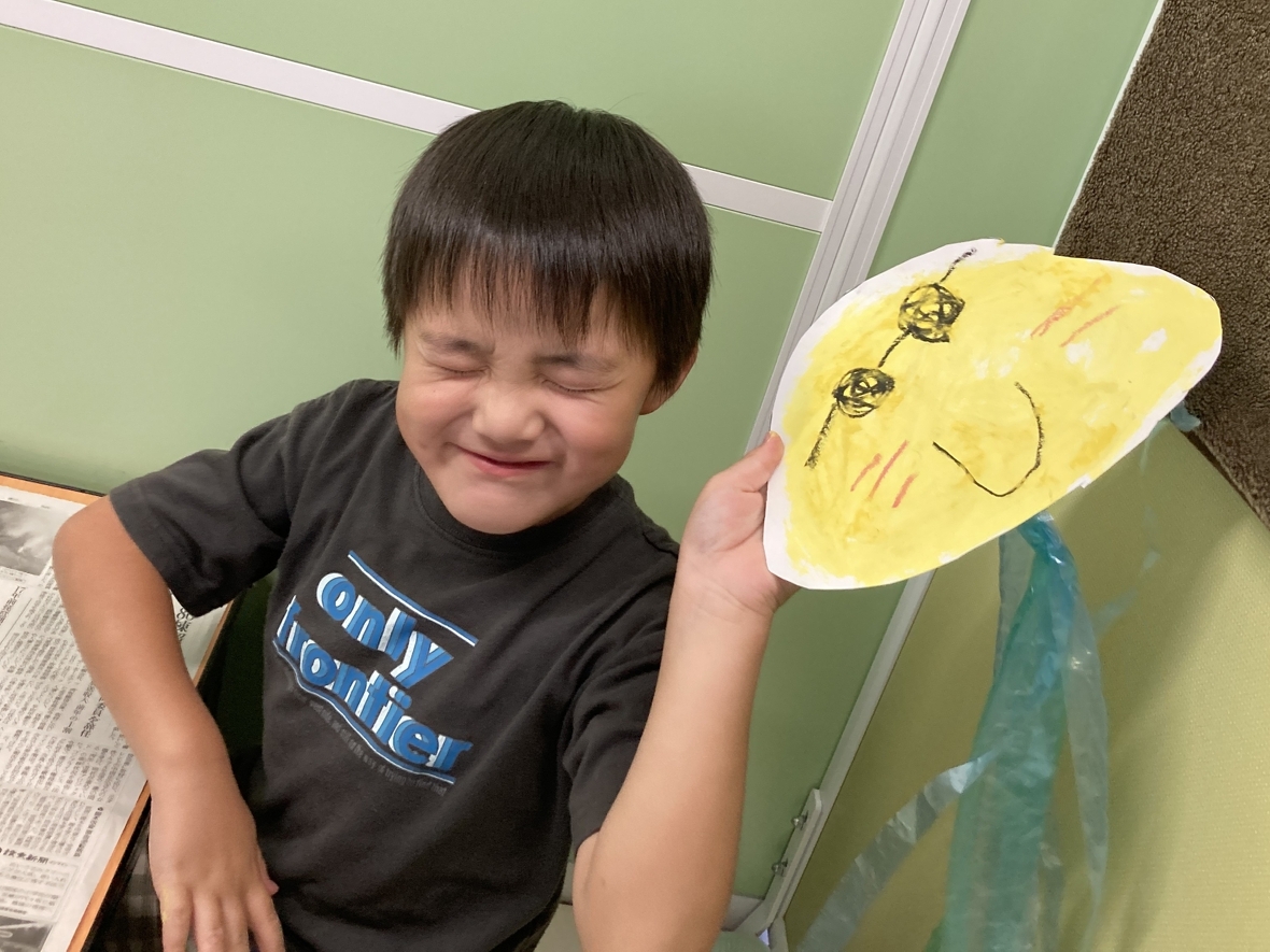 今日の製作は海の生き物のクラゲ!うまくできるかドキドキだけど、先生から作り方を聞いてスタート!!まずはハサミで厚紙を切って、クラゲの頭を作ります。線に沿って切るのは難しかったけど紙を回しながら切っていったよ。次に、絵の具を選んで、クラゲの頭に好きな色を筆で塗ったり、タンポでポンポンしたり!色が濃いところと薄いところがあって、キレイ~~☆クラゲの足はスズランテープを割いて作ったよ。足の太さはみんな違ったから、面白い‼顔を描いて足を付けたら完成♪いろんな表情をしたクラゲができて、とっても楽しかった!