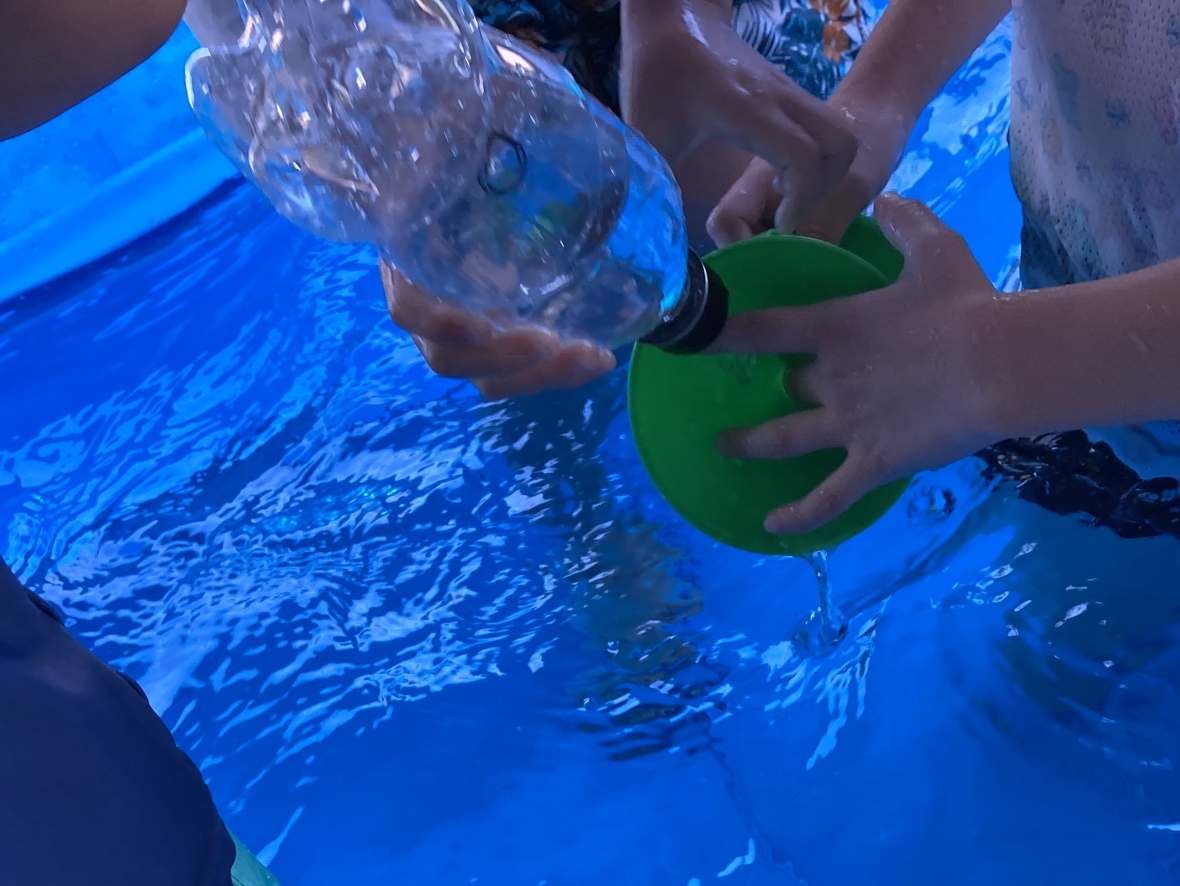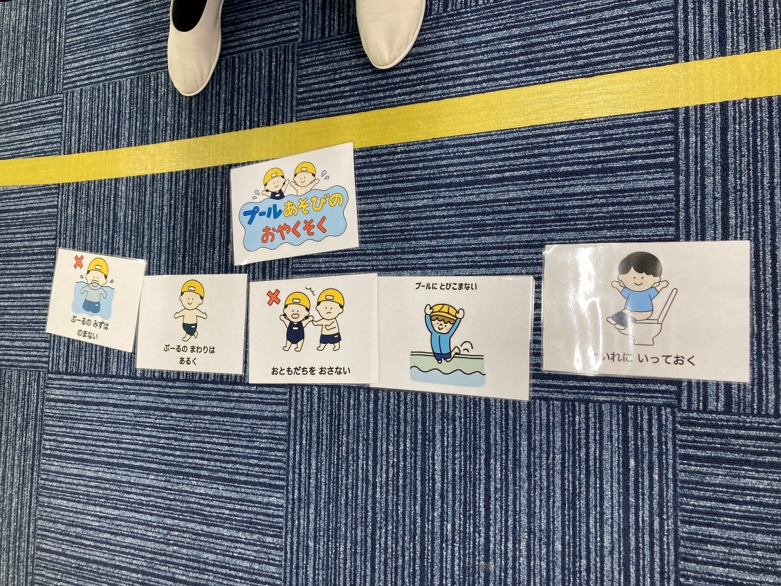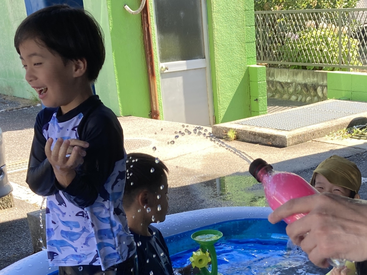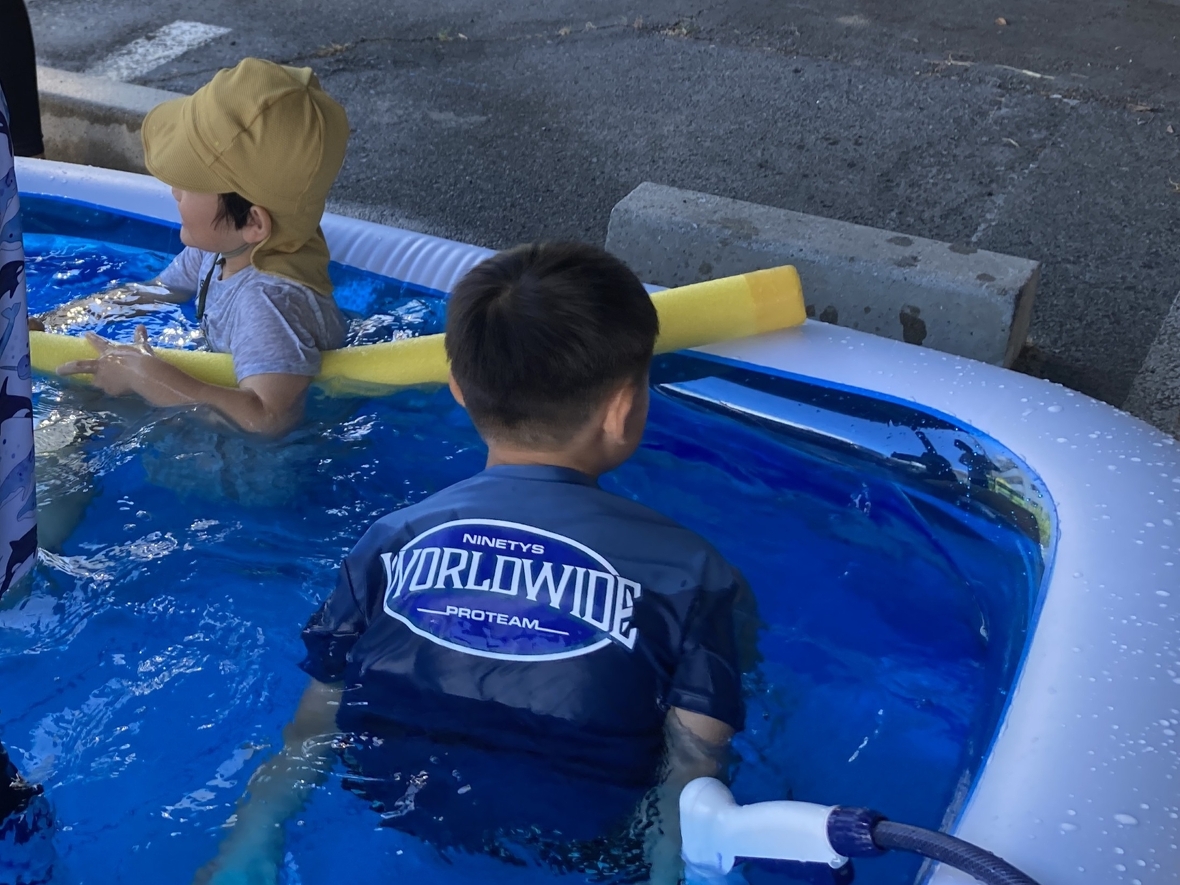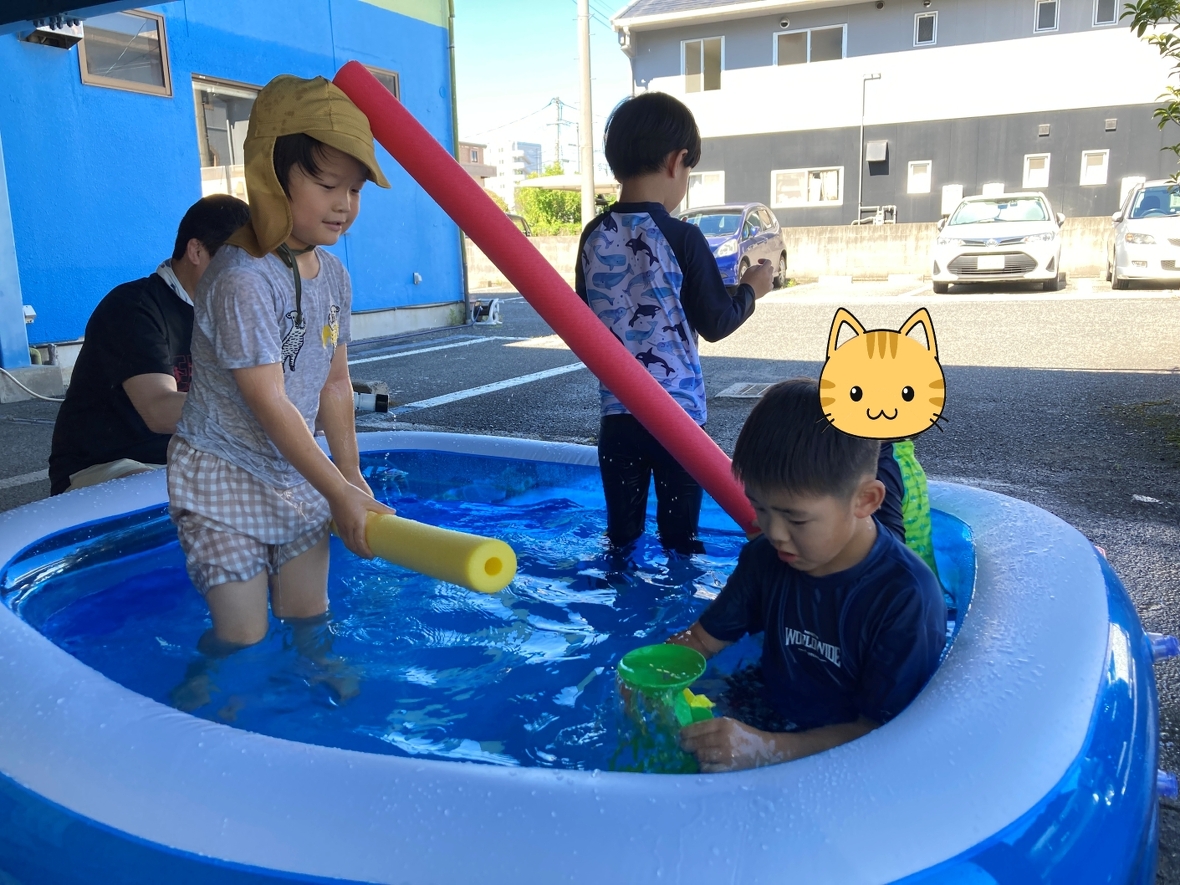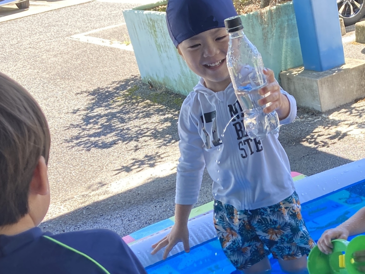 今日は、HiKaRiでの今年初めての水遊び!大きなプールで水遊びができるから、とっても楽しみにしていたんだよね~♪まず最初にみんなでプール遊びのお約束を確認したよ。安全に遊ぶために守っていくぞ!水着に着替えたら、プールの隣で準備体操をして、いざ水遊びスタート‼‼プールはみんなで入っても、まだ他にも友だちが入れるくらい大きい!お外は暑いけど、プールの中はお水が冷たくて良い気持ち☆ペットボトルや水車のおもちゃ、カップ、プールスティックを使って遊んだよ。お友だちと一緒にプールスティックの両端から、水を入れるとどうなるか実験できて面白かったなぁ・・・。また水遊びをしたいな!!