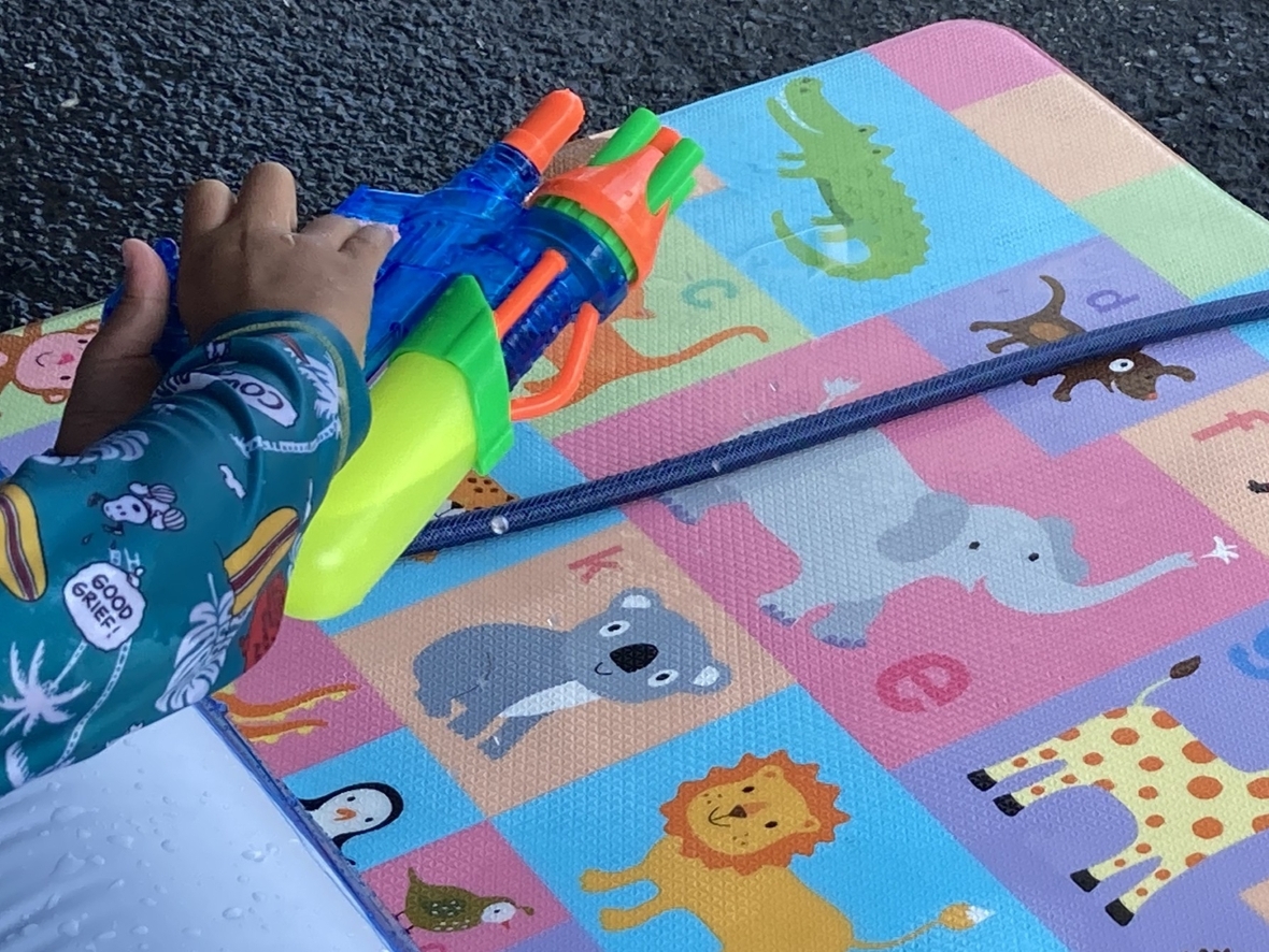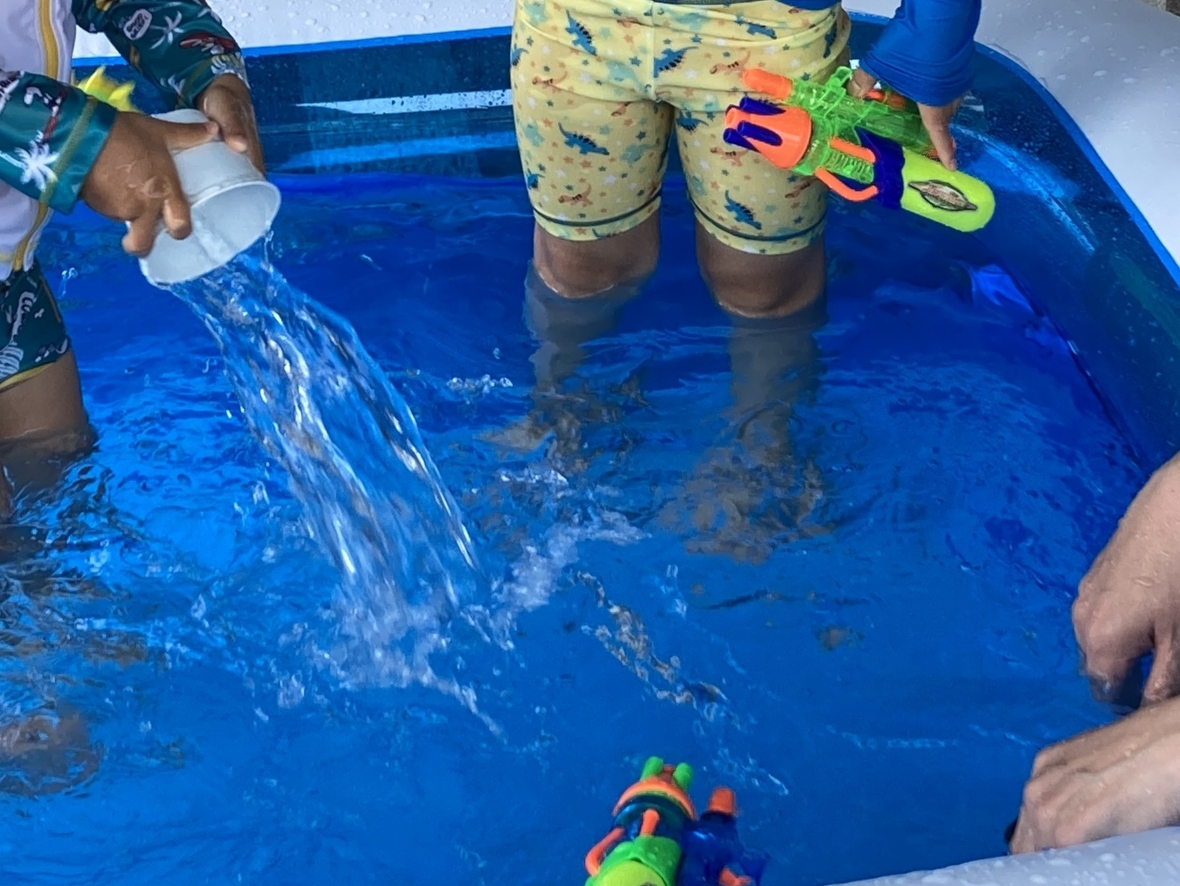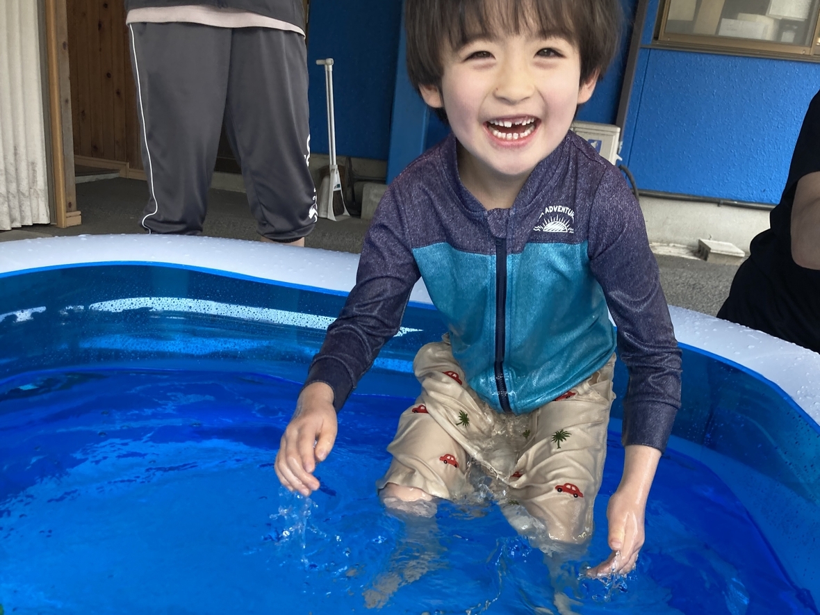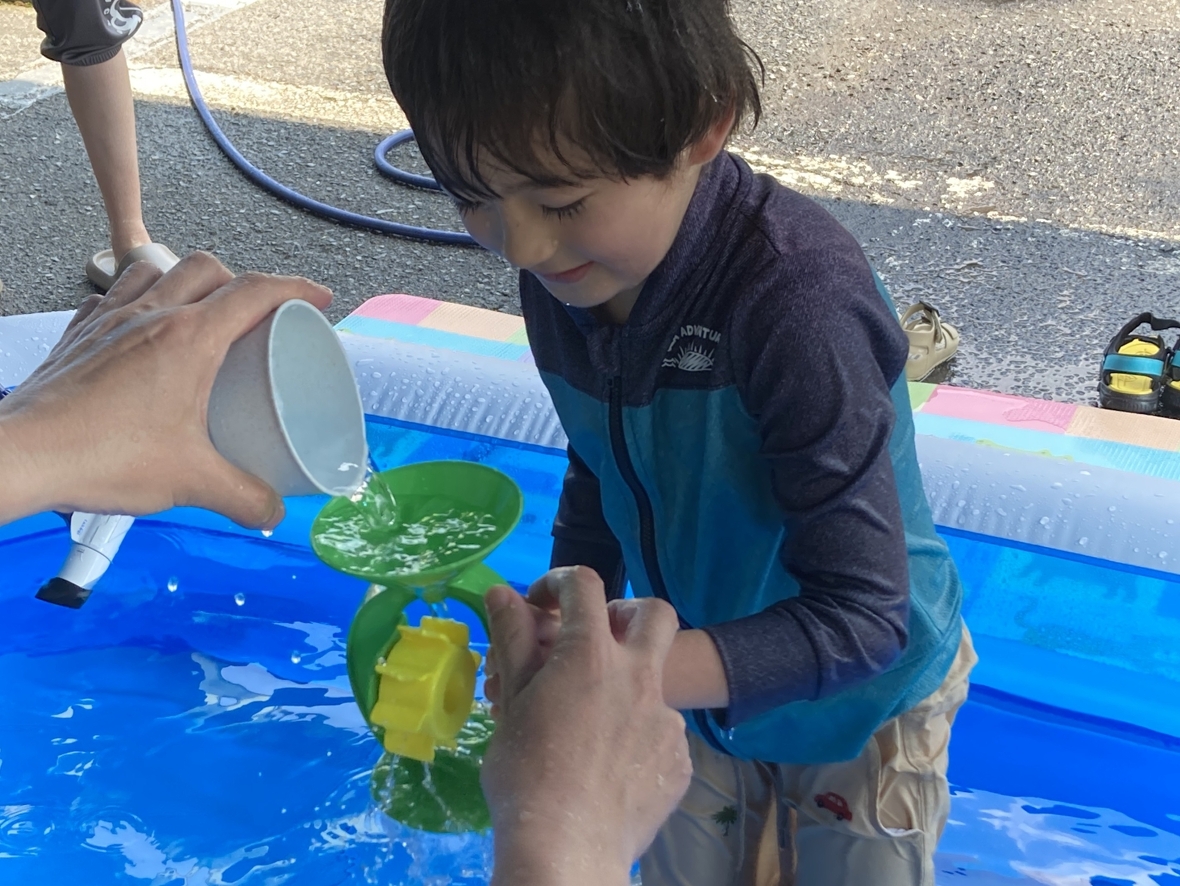 ここ数日の雨が嘘のように、いいお天気になり、プールを楽しみました!HiKaRiでプール遊びが初めてのお友だちがいたから、水遊びのお約束をみんなでよく聞いたよ。準備体操の後にプールに入ると、気持ちいい~~♪先生におもちゃの使い方も教えてもらったよ。今日は、水鉄砲もあるみたい!一本の指だと力が入りにくいから、二本の指を使ってみよう!ペットボトルを的にして倒そうとするとなかなか難しい…(-_-;)近くの柱を的にしたら、水の跡がついて面白い☆プールで水遊びは、楽しくて最高!!(*^▽^*)