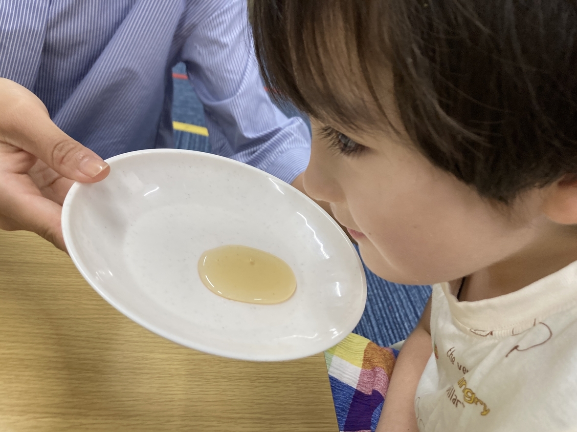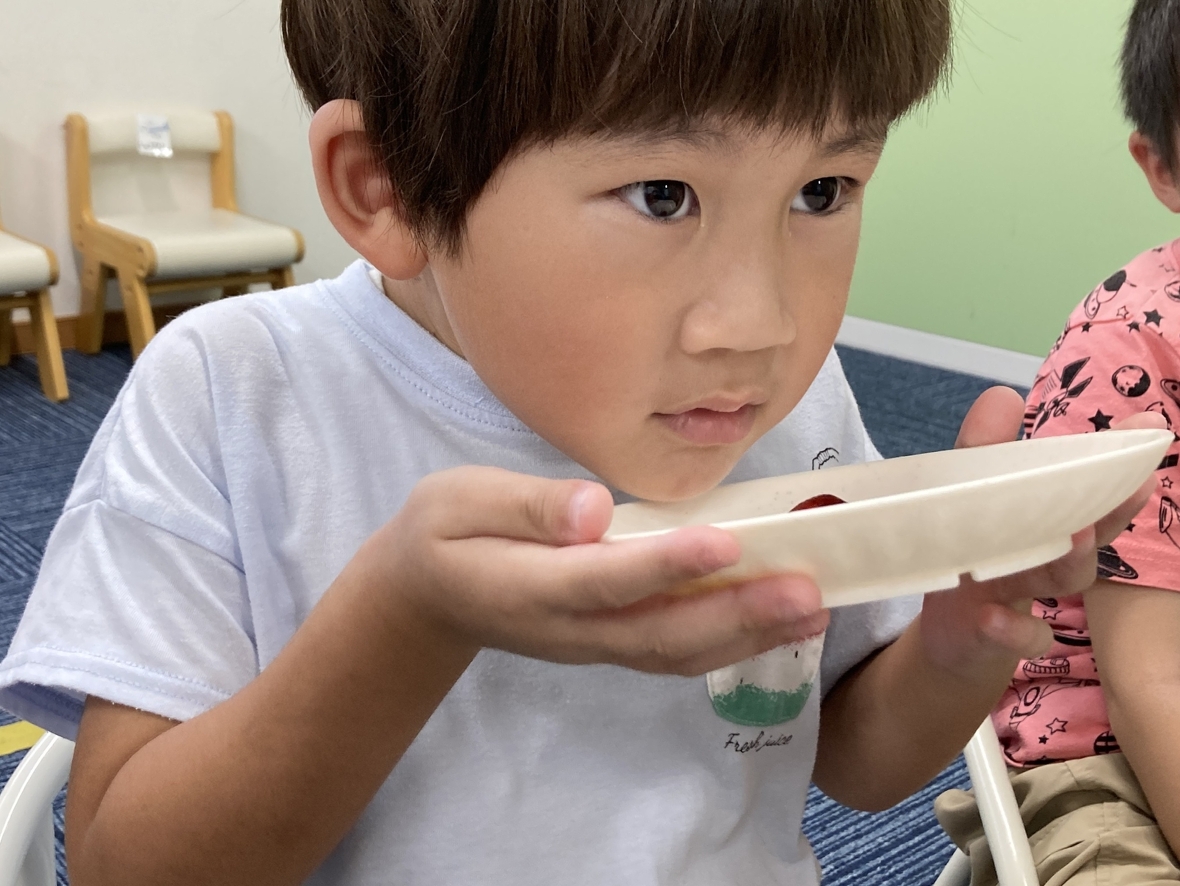 今日は、実験の日!いろんな香りを嗅いでみました!最初は、お皿に乗っているものを観察して、何かを考えてみたよ。色や形を見て、想像するけど何だろう?そのあと、鼻を近づけてくんくん匂ってみたよ。甘い香り?おいしそうな香り?少し酸っぱい香り?これまでに嗅いだことがあるかなあ…?お友だちと順番にチャレンジして全員が終わったら、正解発表!ジャムや調味料、石鹸もあって...。少し苦手な香りもあったけど、面白かった( *´艸`)
