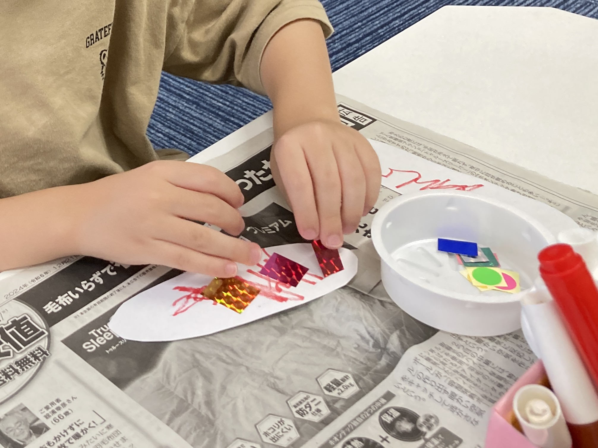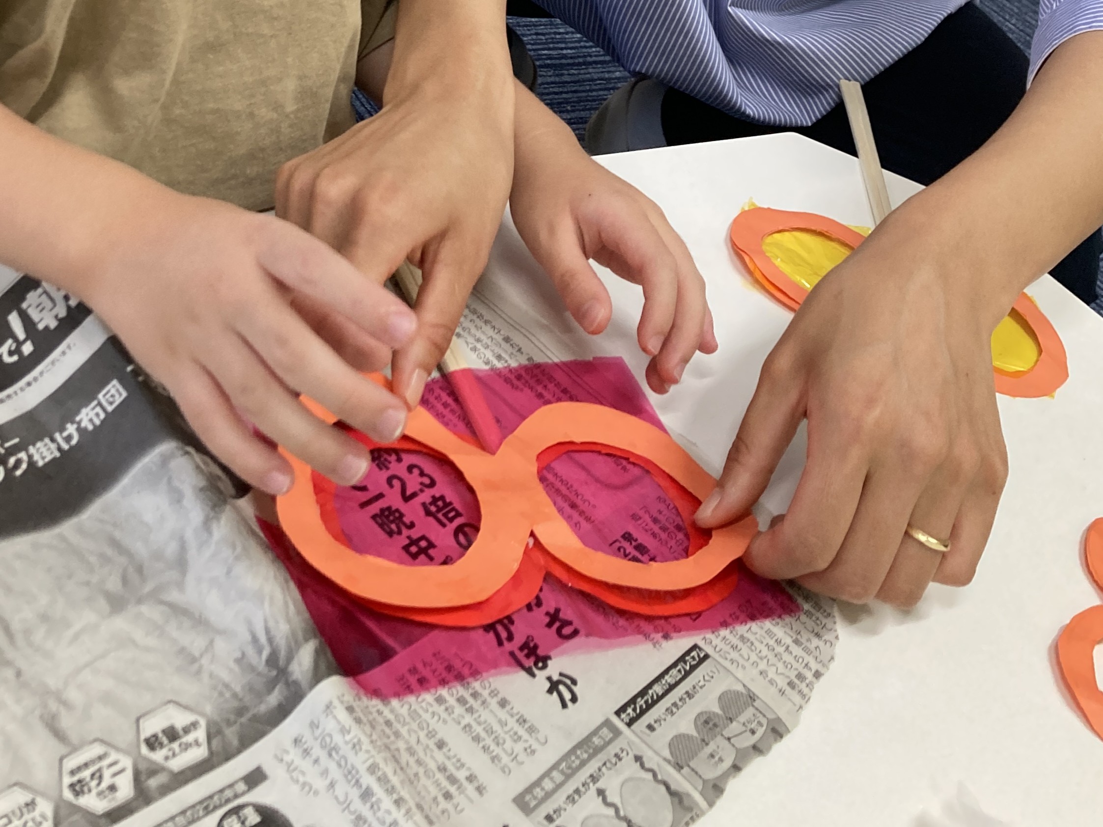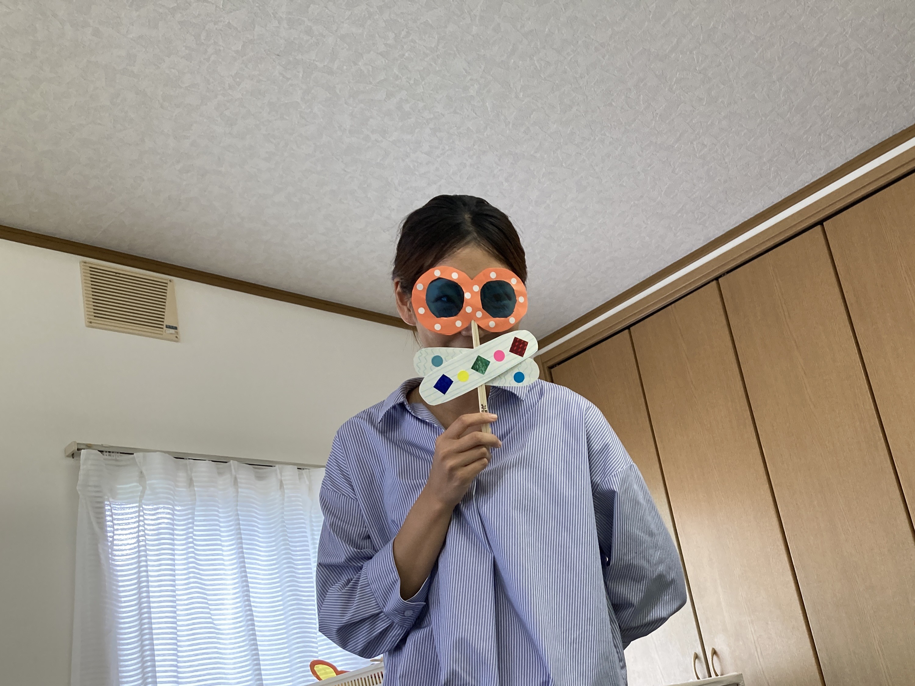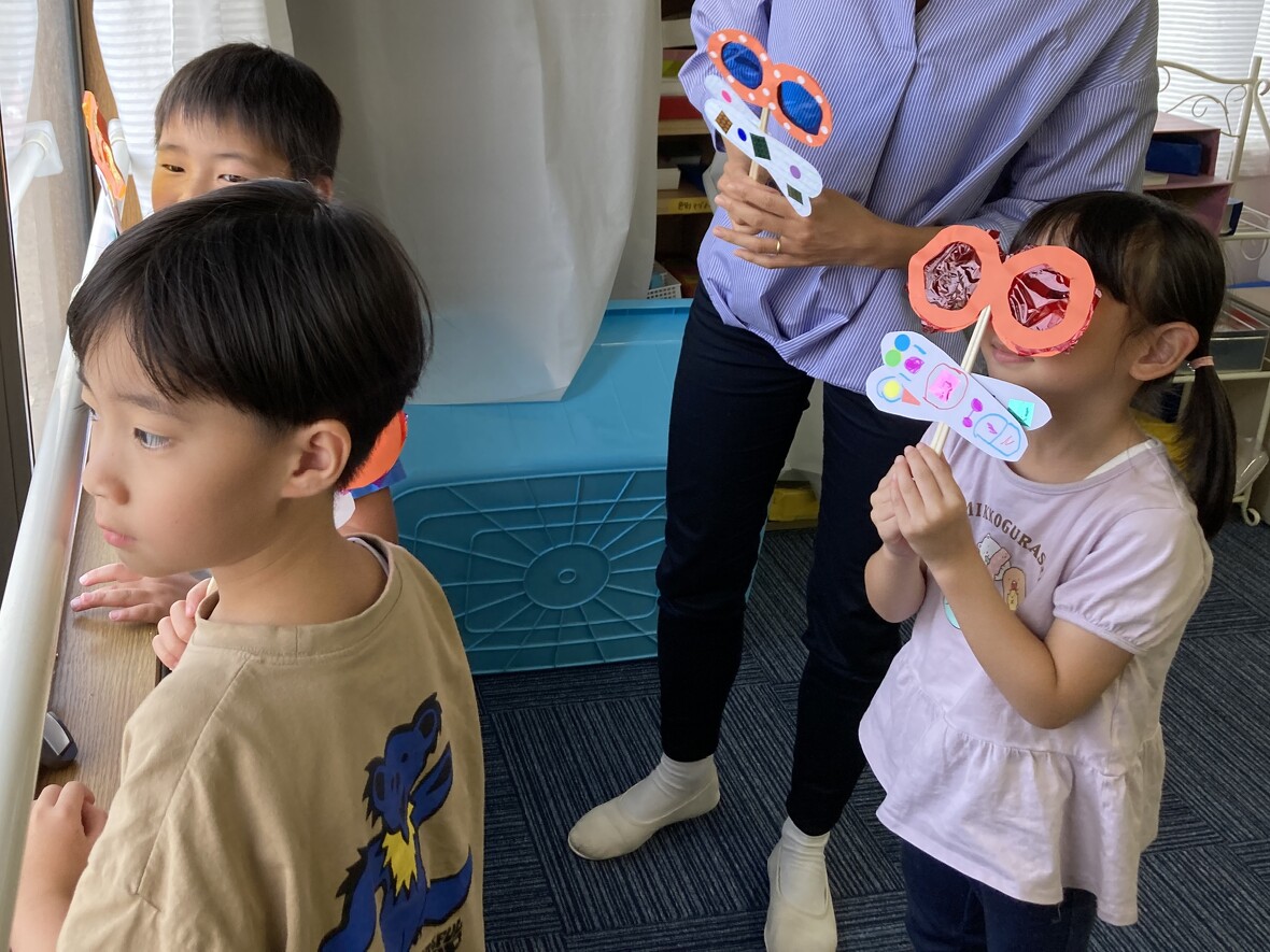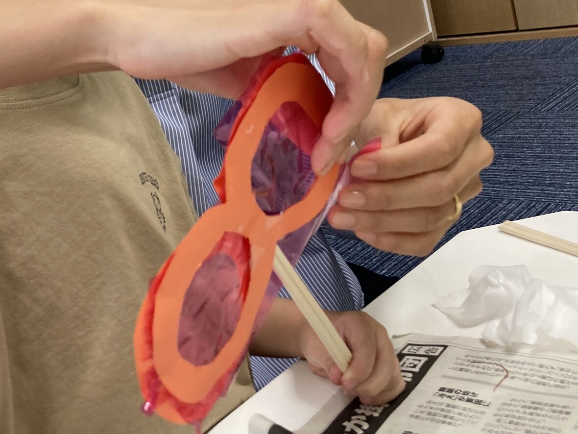 もうすぐ秋!飛びまわる赤トンボの姿を見かけるようになりました!今日はみんなでトンボのめがねを作るよ!ふじ先生から見本を見せてくれて、作り方を教えてもらいます。本物のめがねみたいに覗けるらしい。早く作ってみたいな♪まずは、ペンで模様を描いたり、シールで飾り付けしたりトンボの羽をおしゃれにしていくよ!見本をまねしてクネクネと曲線の模様を描いてみようかな?次は、8の字に切った画用紙にでんぷんのりで好きな色のカラーセロファンを貼って、めがねのレンズを作っていくよ。はみ出ているカラーセロファンはきれいにとって、さっき飾り付けた羽と一緒に割りばしの胴体に付けたら完成☆めがねを覗いてみると赤い世界や、黄色い世界に大変身!窓から見る景色がいつもと違って、とても面白かった(≧▽≦)