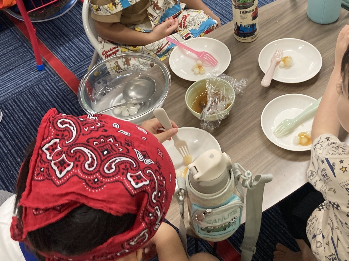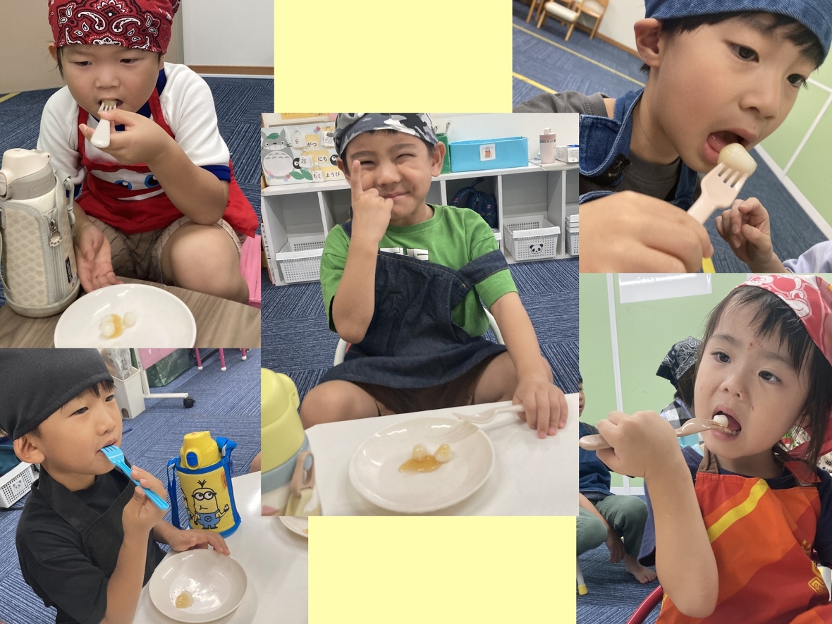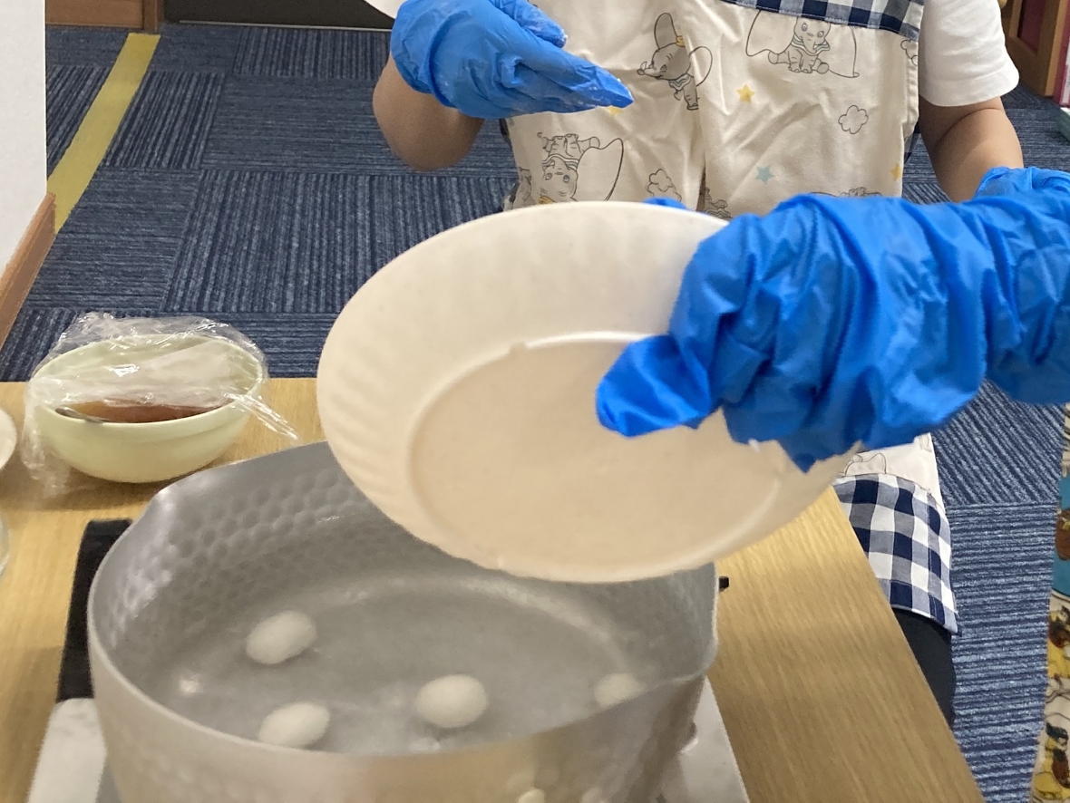 9月のクッキングは、お月見団子!自分たちで粉から団子を作っていくから、楽しみ♪エプロンに着替え、手を洗って消毒をし手袋をはめたらクッキングスタート!団子の粉に水を入れて、こねていくよ。バラバラだった粉が少しずつ一つになってきた!先生が一口サイズに分けてくれて、自分たちでコロコロと丸めて団子を作ったよ!粘土遊びみたいで面白かった☆丸めた団子はぐつぐつ沸いているお湯の中に入れます。だんだんお湯の中で浮いてきた!浮いてきたらすくって、冷たい水で冷やして完成‼お皿に盛りつけて、甘い「みたらしのタレ」をかけたらみんなでいただきます!団子を初めて食べてみる友だちも、食べたらおかわりするくらい気に入ってて、とっても美味しかったよ!自分で作ると楽しいし、いつもよりおいしく感じるね(*^▽^*)
