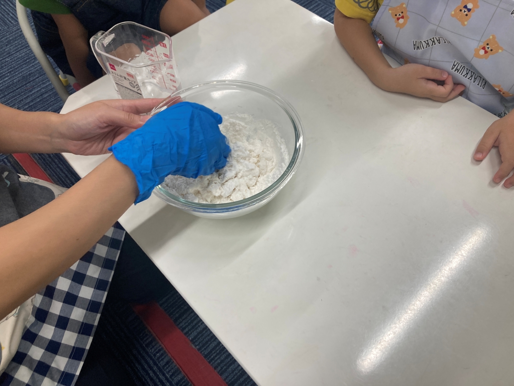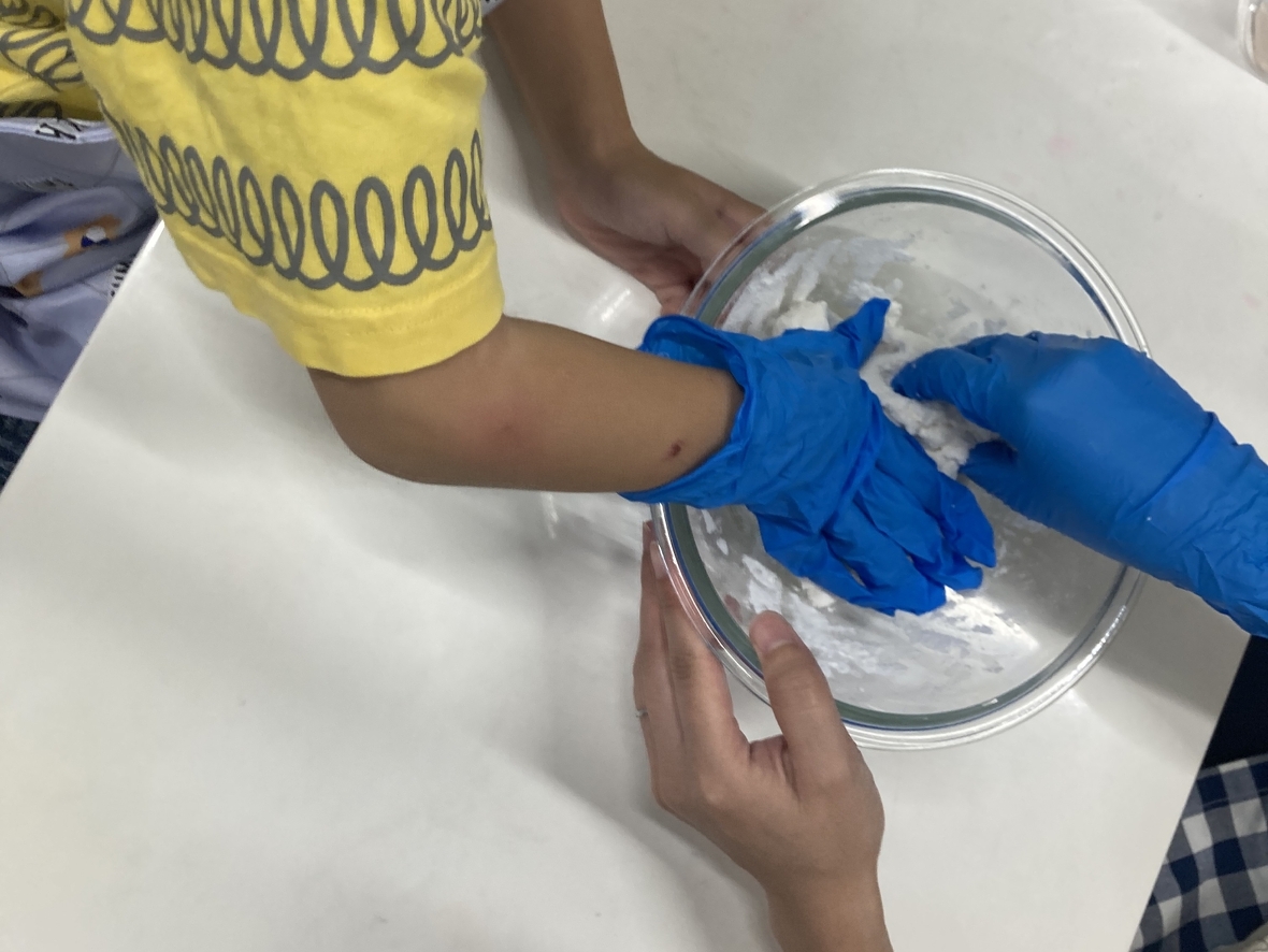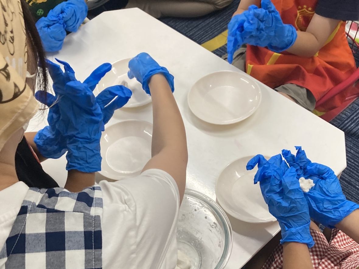 9月のクッキングは、お月見団子!自分たちで粉から団子を作っていくから、楽しみ♪エプロンに着替え、手を洗って消毒をし手袋をはめたらクッキングスタート!団子の粉に水を入れて、こねていくよ。バラバラだった粉が少しずつ一つになってきた!先生が一口サイズに分けてくれて、自分たちでコロコロと丸めて団子を作ったよ!粘土遊びみたいで面白かった☆丸めた団子はぐつぐつ沸いているお湯の中に入れます。だんだんお湯の中で浮いてきた!浮いてきたらすくって、冷たい水で冷やして完成‼お皿に盛りつけて、甘い「みたらしのタレ」をかけたらみんなでいただきます!団子を初めて食べてみる友だちも、食べたらおかわりするくらい気に入ってて、とっても美味しかったよ!自分で作ると楽しいし、いつもよりおいしく感じるね(*^▽^*)