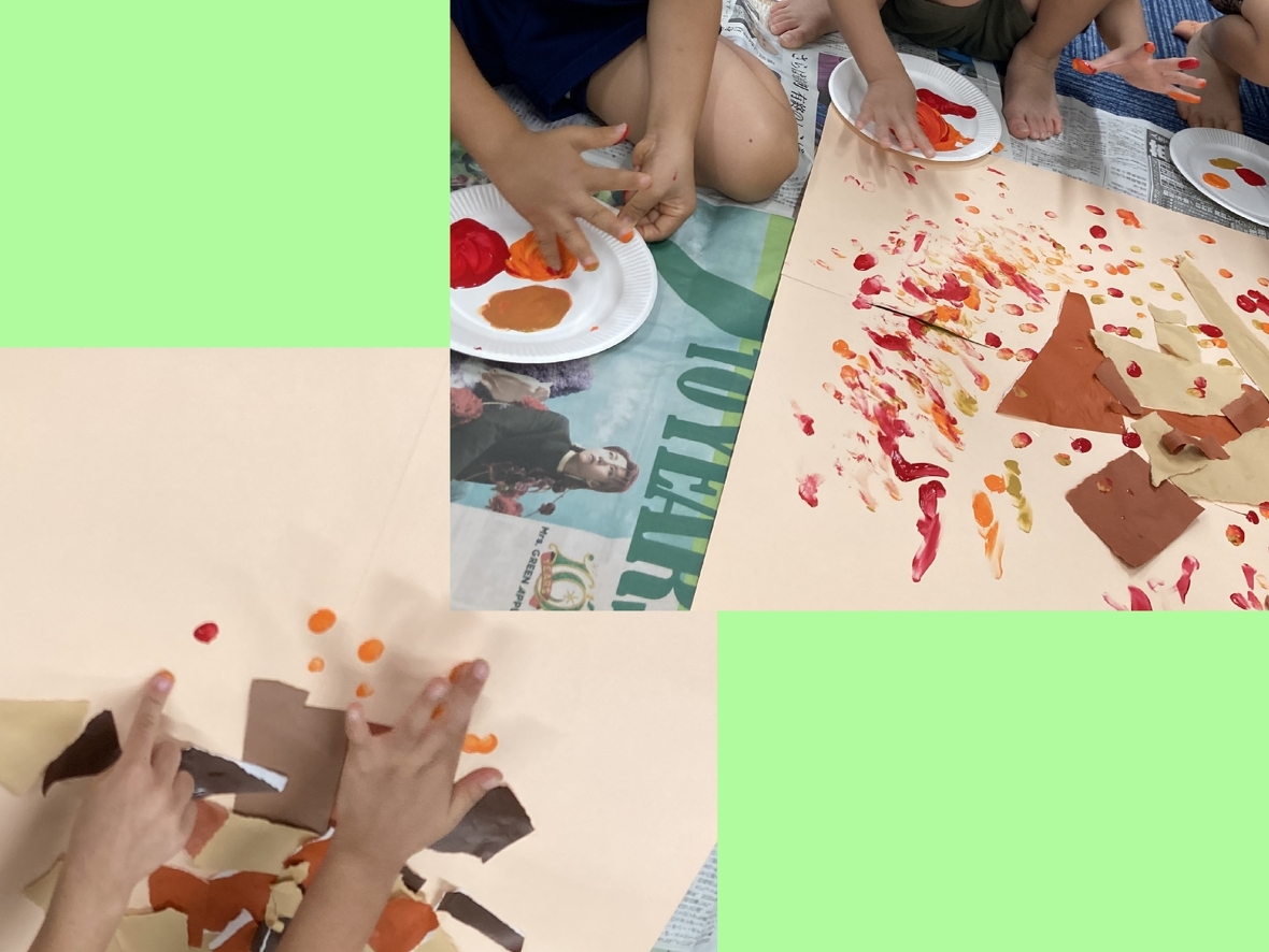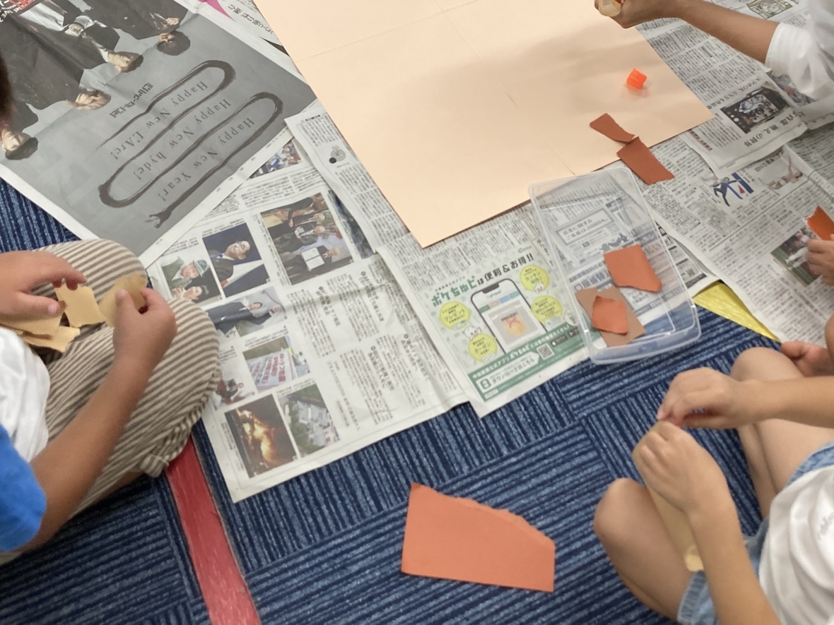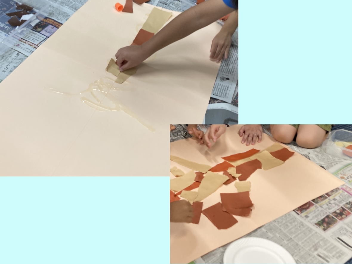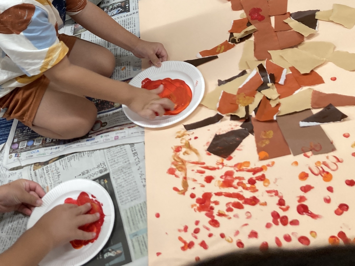 朝夕が少しずつ寒くなって昼間の暑さも和らいできましたね!一段と秋の気配を感じる今日は、お友だちと一緒に「秋」をテーマにした大きな作品作り!2チームに分かれて、フィンガーペイントで「紅葉」を表現しました。まずは、茶色い画用紙や折り紙をちぎったよ。その後、大きな画用紙に、ちぎった紙をのりで貼って、木の幹や枝を作っていったよ。いろいろな大きさにちぎったから、細い枝や太い枝になっていい感じ!次は、絵具を指先につけて「ちょんちょん」と木の周りに葉っぱを描いていくよ。木の根っこのあたりに落ち葉を描いている子もいたよ。絵具の感触が気持ちよくてどんどん大胆になって・・・色を混ぜたり、手のひら全部使って葉っぱを描いたりして、楽しかったなぁ☆出来上がった作品はみんなで見たり、お母さんやお父さんにも見てもらえたりして、たくさん褒められて嬉しかったよ!