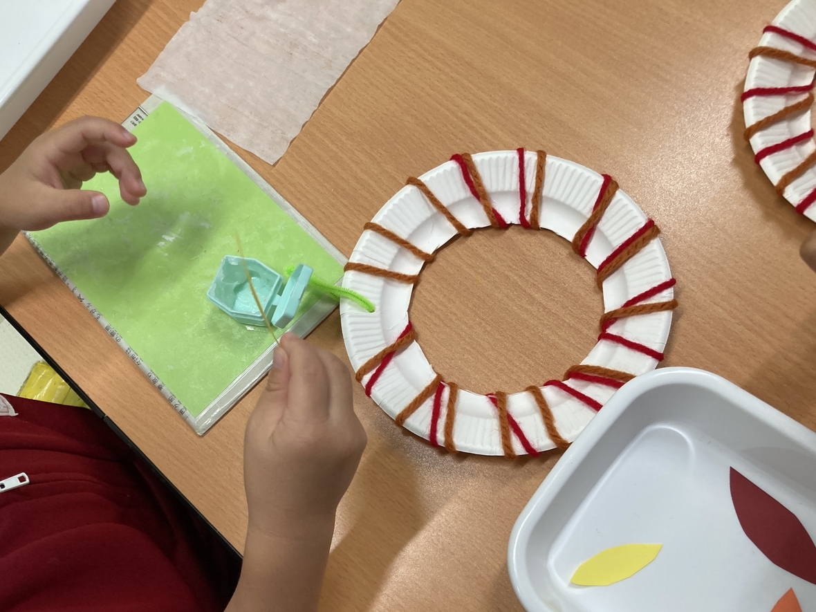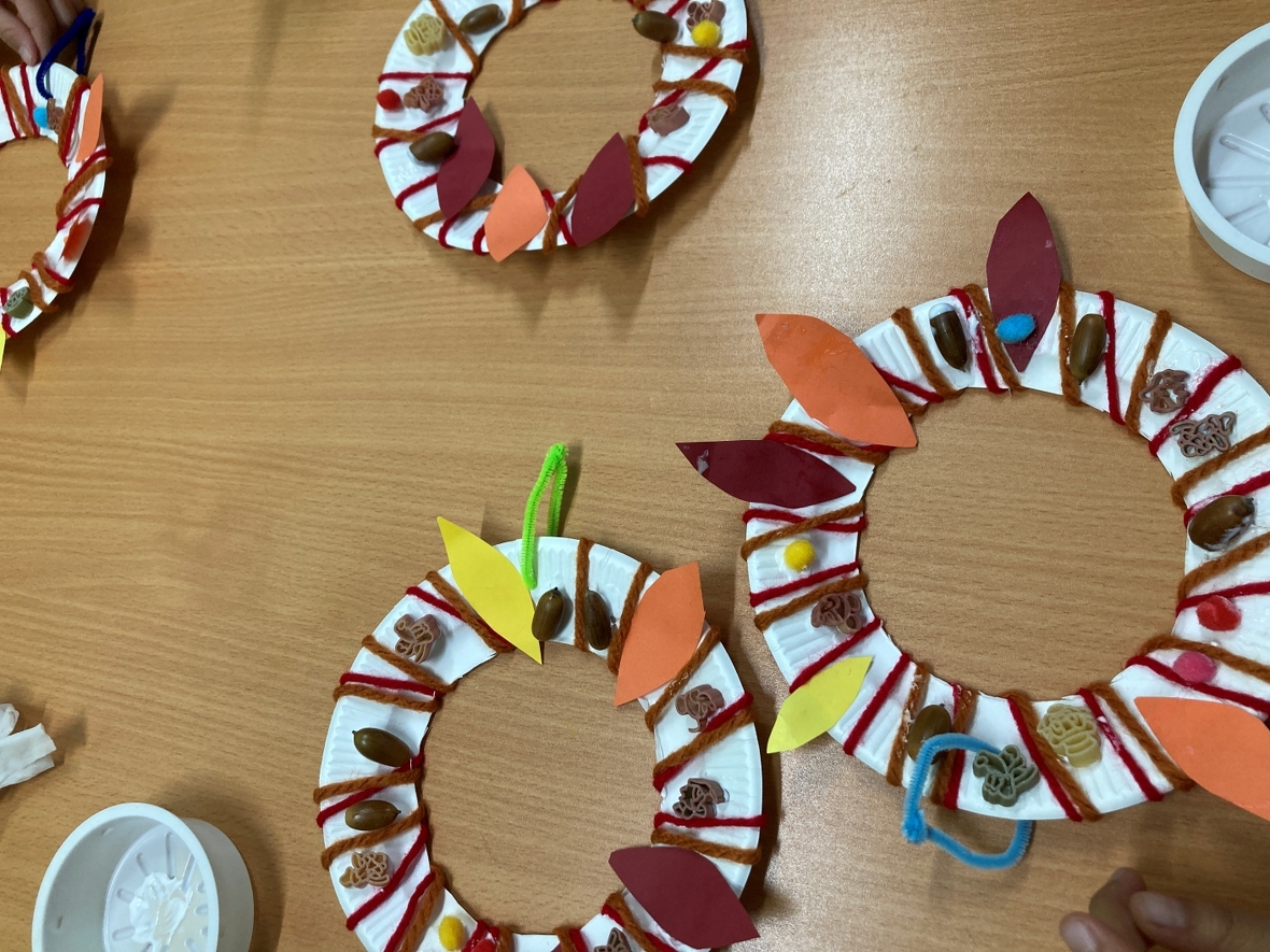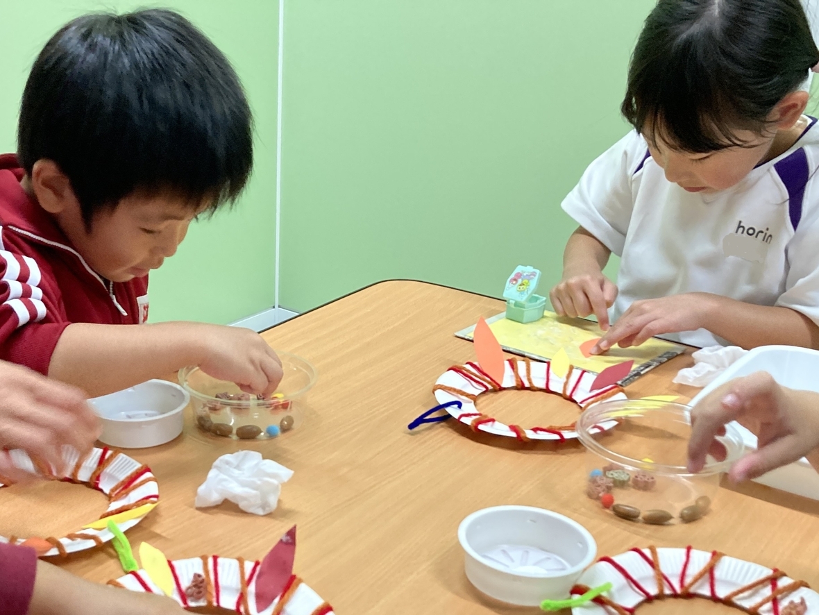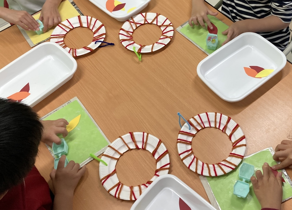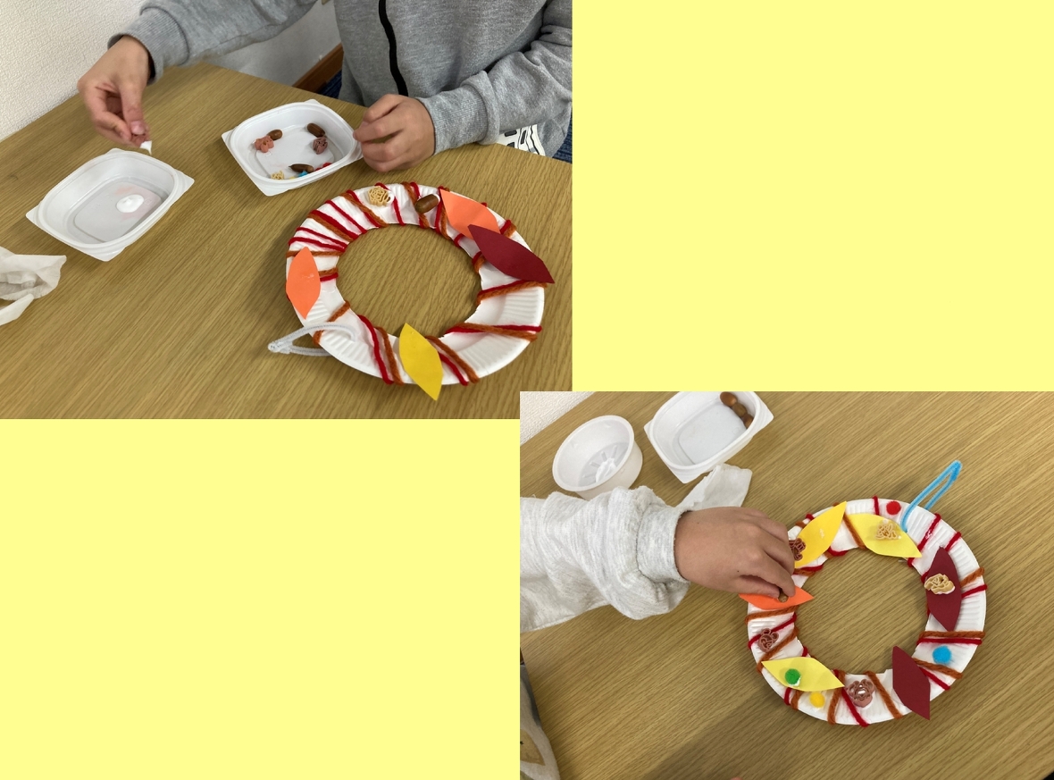 今日の製作は「秋のリース」!まずは、でんぷんのりを指につけ、葉っぱの形をした画用紙を毛糸が巻いてある紙皿の土台に貼っていくよ。いろいろな向きで葉っぱを貼って、おしゃれにしていくぞ!葉っぱの他にも、ドングリや色づけしたマカロニ、デコレーションボールも使います。ちょんちょんとボンドをつけて、リースの上に置いていくと、どんどんキレイになってきた☆お友だちも自由に飾りつけをして、素敵なリースを作っていたよ。最後は、お友だちと見せ合いっこをしました♪