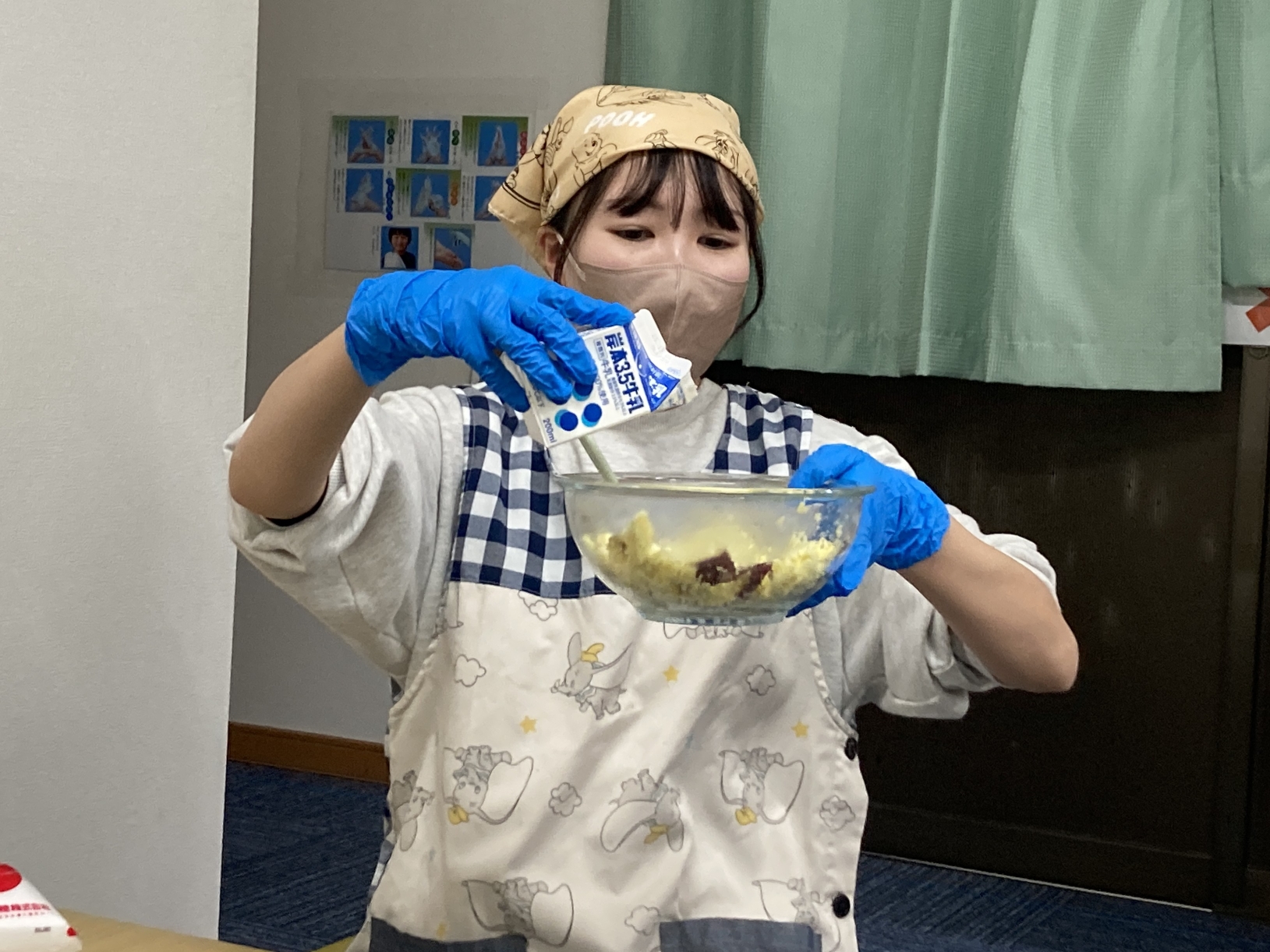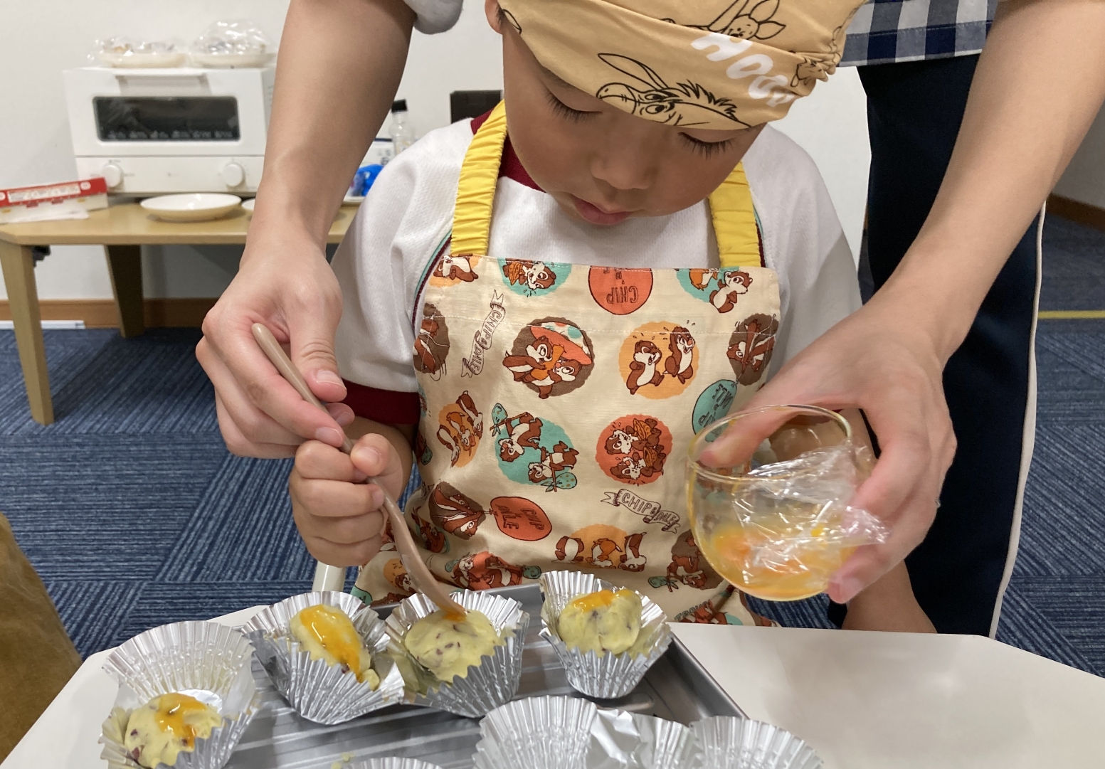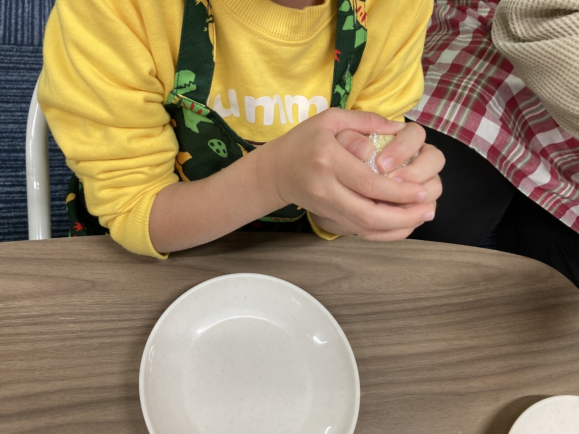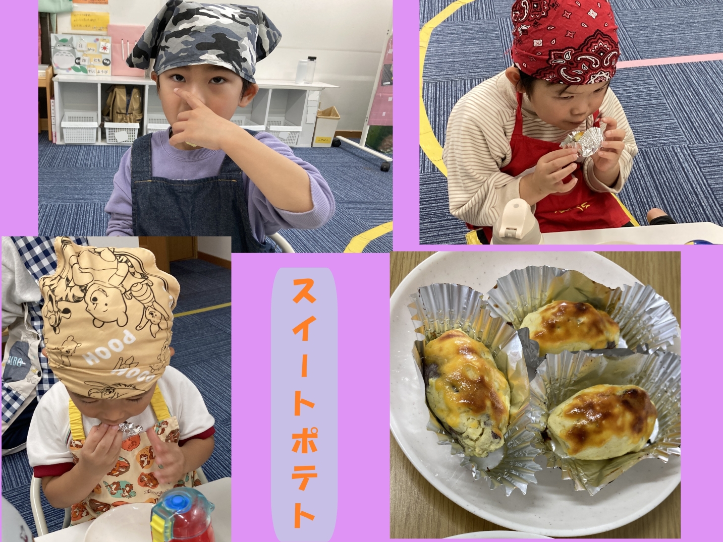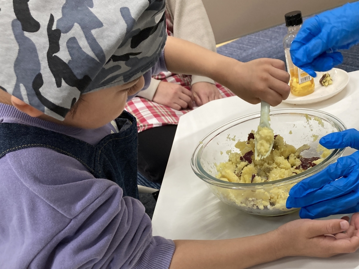 月に一回のクッキングの日!今月は秋の味覚、美味しいサツマイモを使って、スイートポテトを作ったよ。エプロンに着替え、三角巾を付けて、キレイに手を洗ったら準備バッチリ☆まずは、今日使うサツマイモをみんなで触ってみたら、硬くてごつごつ「食べられるのかなあ!」。でも先生がレンジで蒸かしてくれたら、少し力を入れると潰れるくらい柔らかくなってた‼そこに牛乳・砂糖・油を入れて、友だちと順番にサツマイモを潰しながら、混ぜていったよ。しっかり混ざったら、ラップに包んでギュッギュッと細長い楕円形を作っていったよ。フォークで潰すときの感覚と違って、ラップ越しに触ると気持ちいいね!できあがったら、アルミカップの上に置いて卵を塗って、トースターの中へ!焼き上がると部屋いっぱいにいい匂いがしてきた!完成したスイートポテトは、熱々だったから少しずつ冷ましながら食べたよ。とっても甘くておいしかった(≧▽≦)