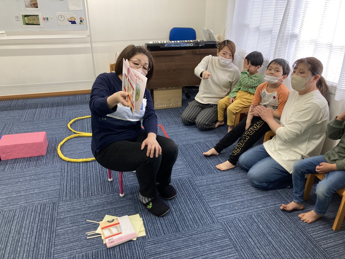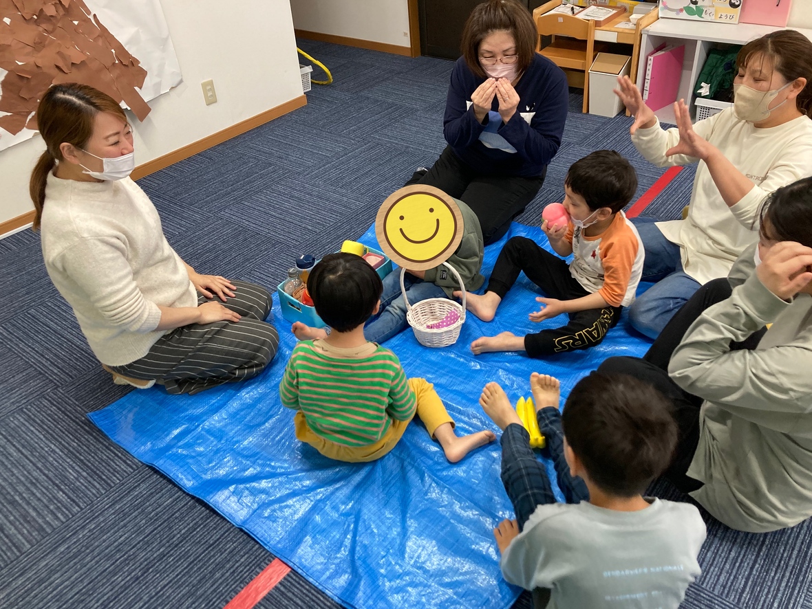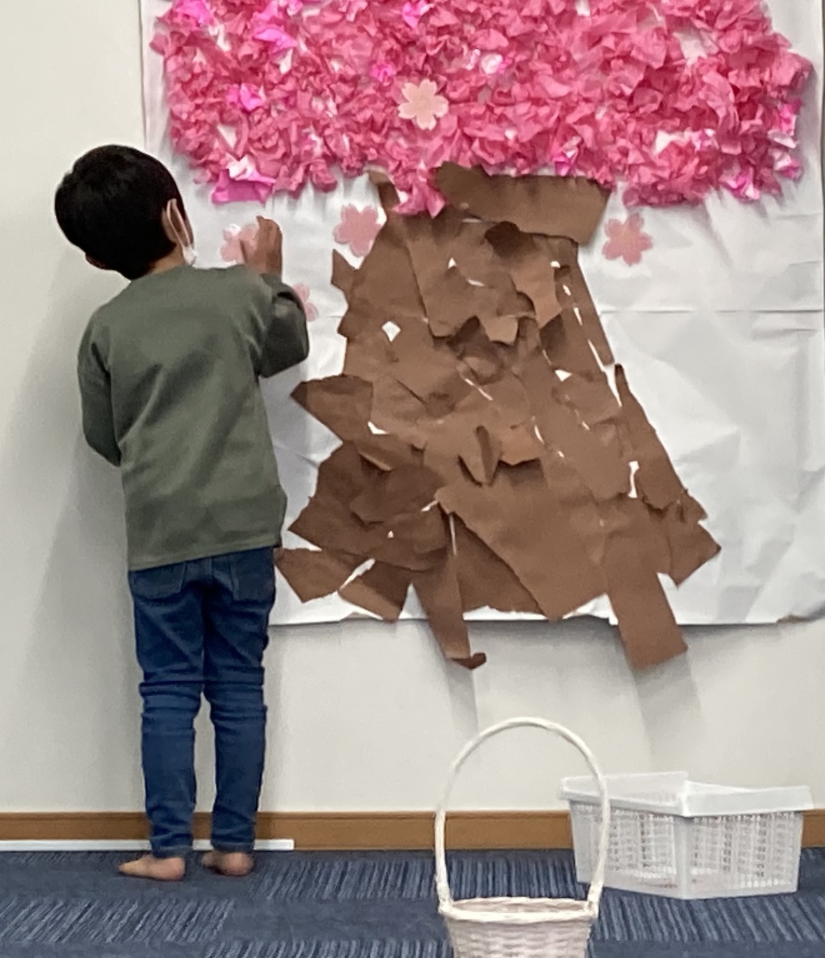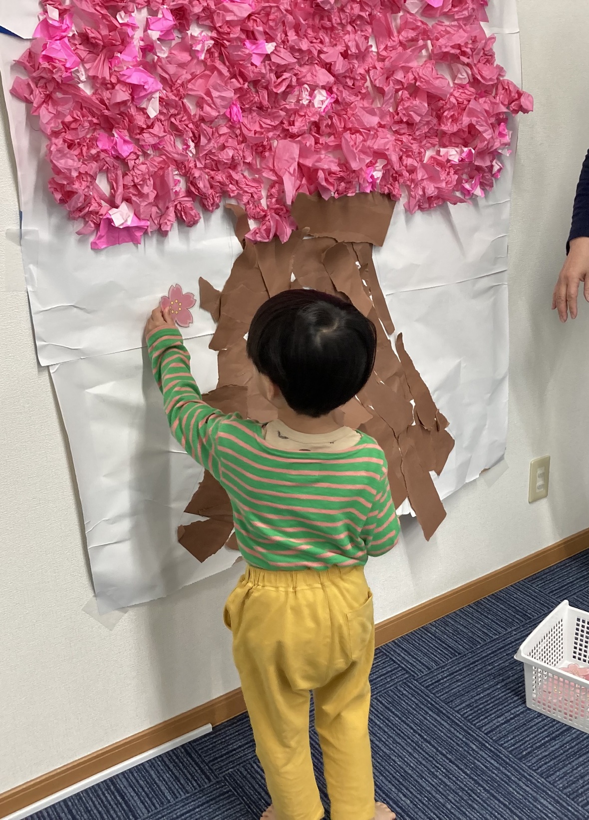 2023年04月06日(木) スタッフブログ お花見ごっこをしたよ! お天気が良ければお花見に出かける予定でしたが、 外はあいにくの雨。そこでお部屋でお花見ごっこを することにしました。絵本を読み、歌を歌ってから お花見ごっこスタート! バスに乗って一本橋を 渡ったり、桜の花びらを付けたり。果物のお買い物もし、 昨日作った桜の木の下でシートを広げて『いただきます!』。 楽しいごっこ遊びになりました!