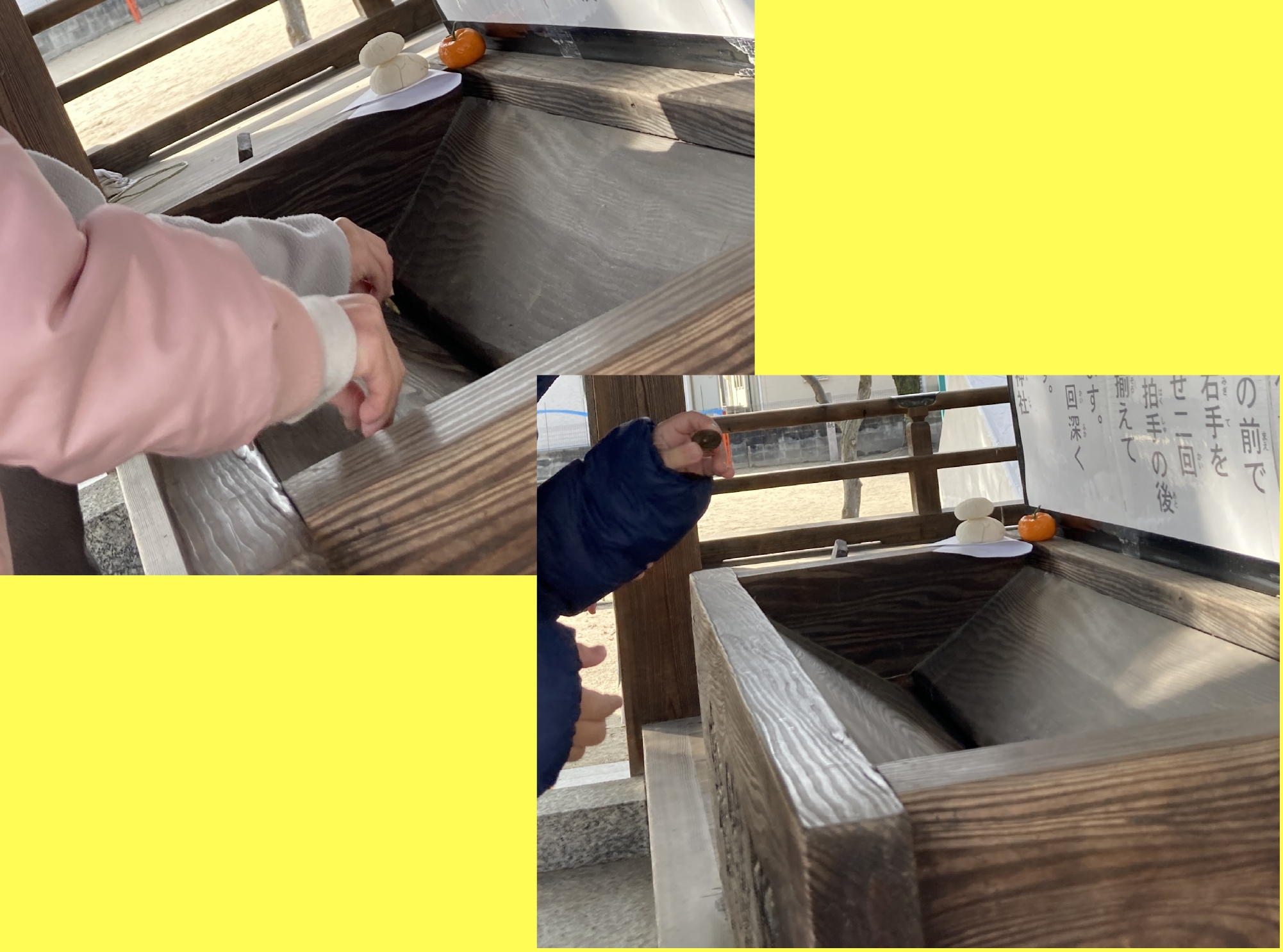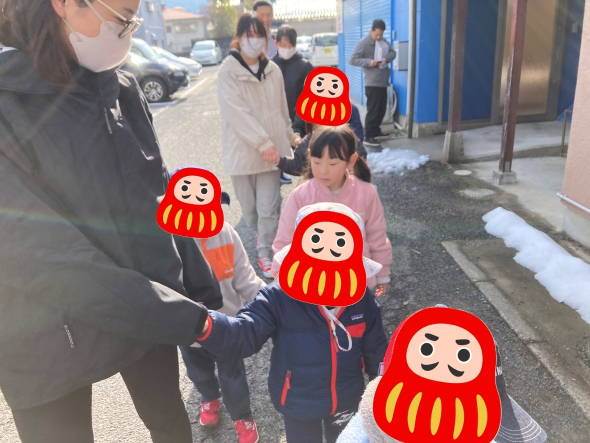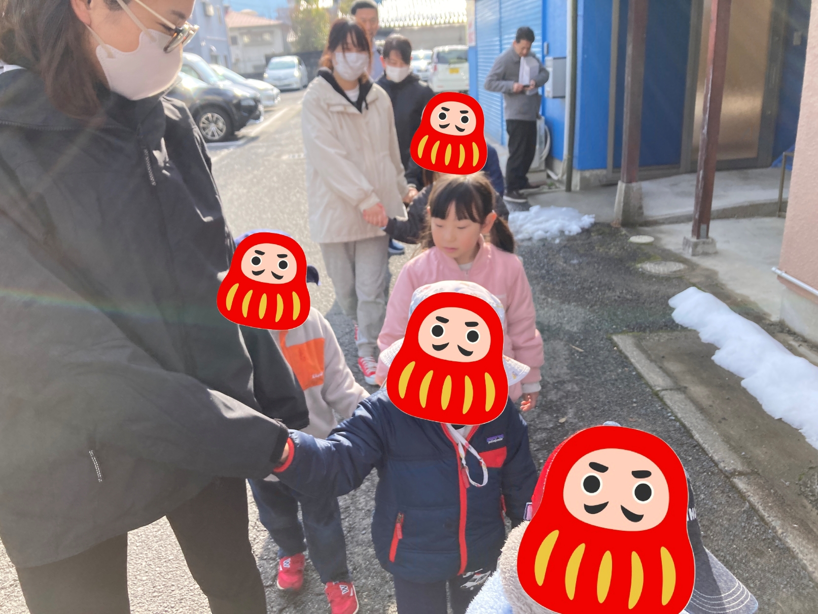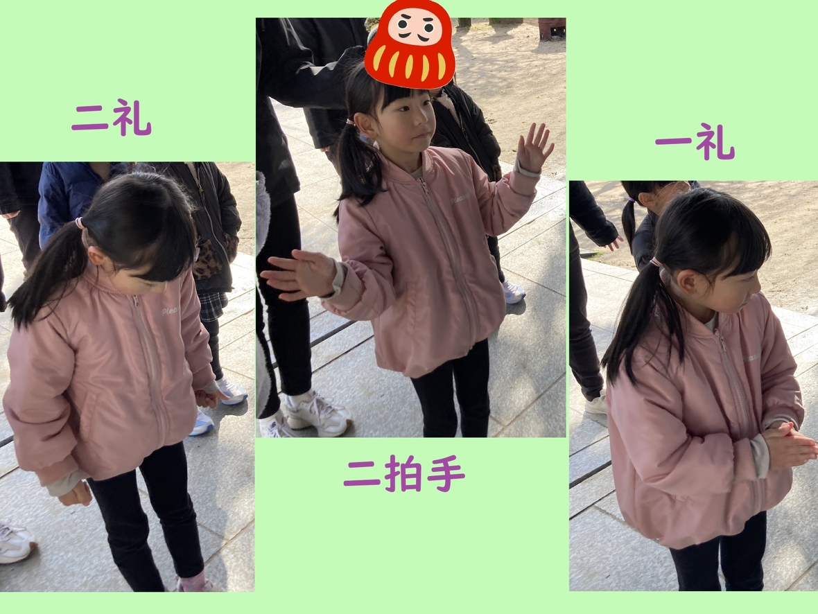 新年初めてのHiKaRi!お母さんやお父さんと一緒に「明けましておめでとうございます。」って、先生たちに新年の挨拶をしました。今日は、お友だちや先生と近くの神社まで、初詣散歩に行ってきたよ!狭い道や車の走る道も歩くから、手を繋いで交通ルールを守ったよ!車が来ないかなってしっかり確認しなくちゃね☆20分くらい歩いて、神社に到着‼初詣の参拝のやり方を教えてもらって、お友だちと交代でお参りをしたんだ。お賽銭箱に本物の5円玉を入れられて嬉しかったな!ご縁(5円)がありますようにって意味があるんだって。ニ礼・ニ拍手・一礼をして、お願い事をしました。今年も一年いい年になるといいなぁ(^^♪歩いて帰るのは少し疲れたけど、帰ってからのお弁当はとても美味しかったな!