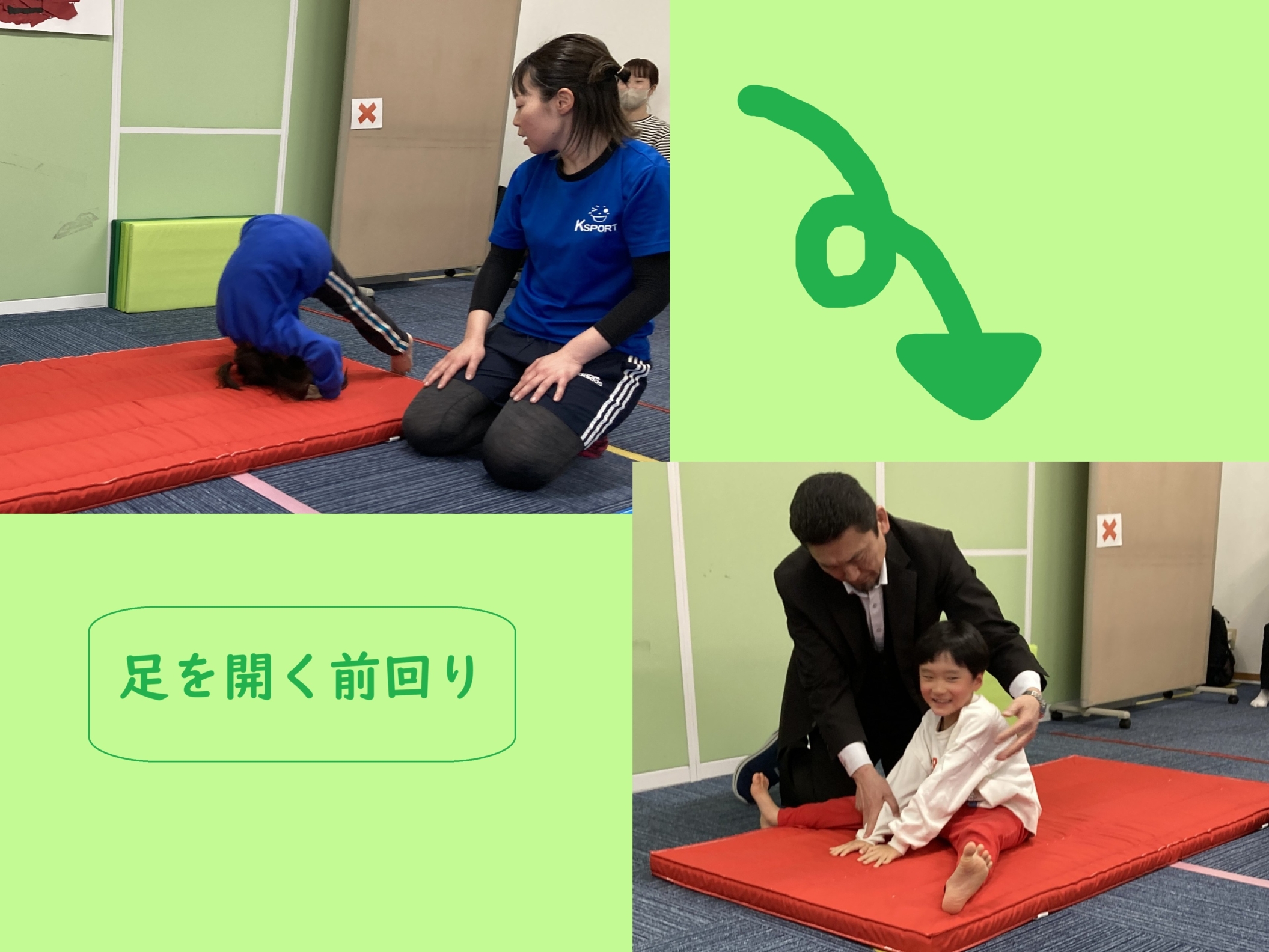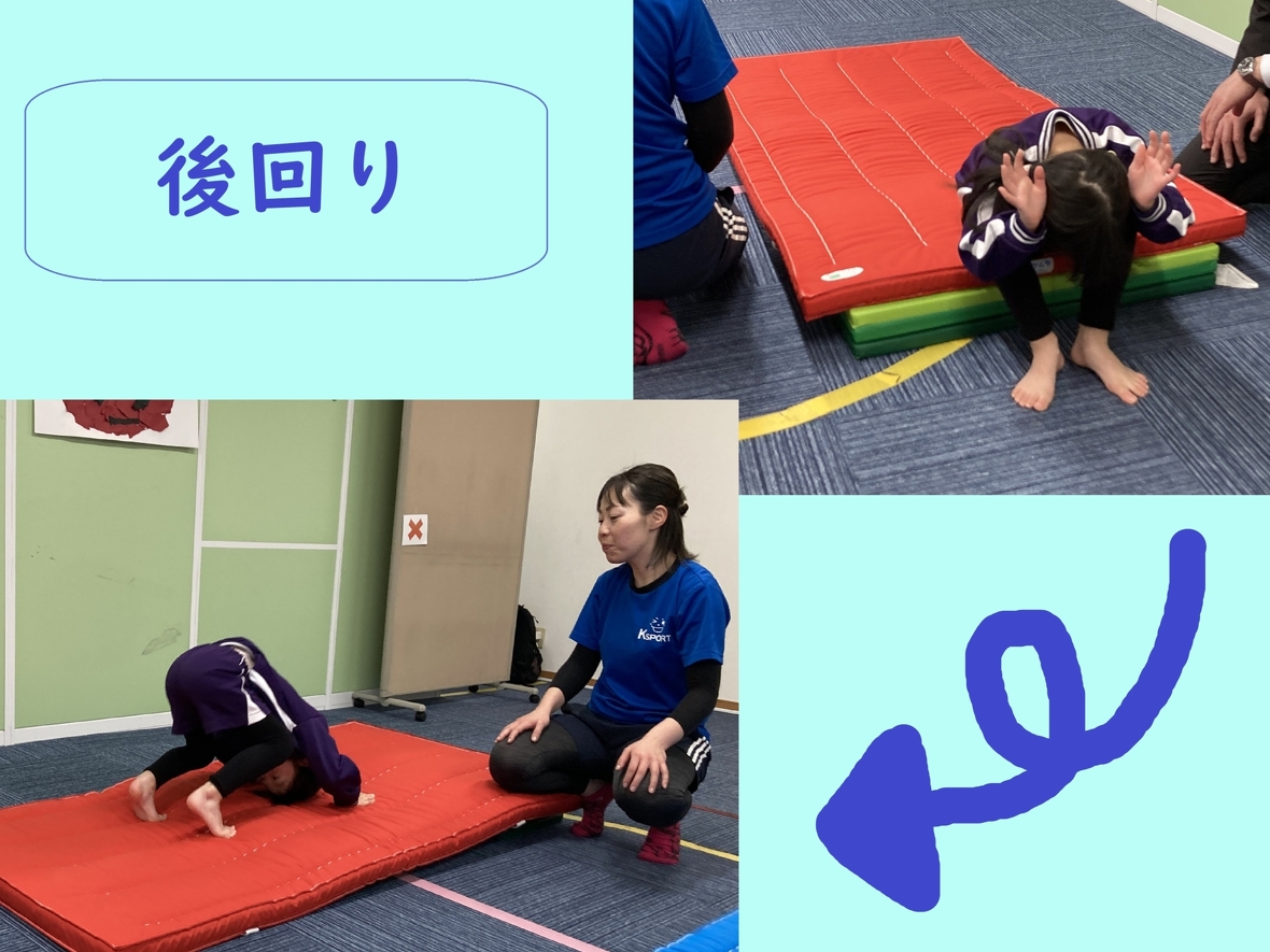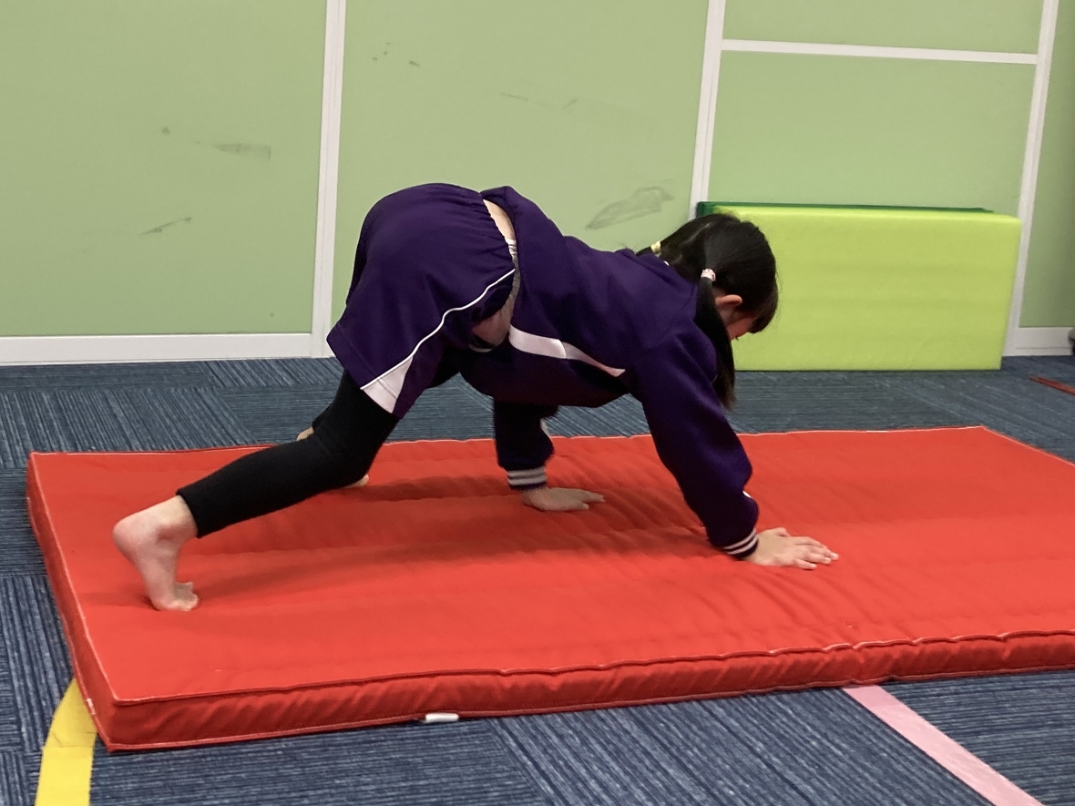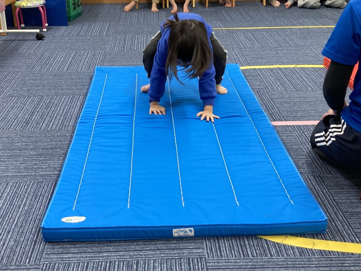 今日の午後は、ミポ先生とマット運動を楽しんだよ★手で体を支えながら、四本足で歩くクマさんのように行う「くま歩き」。前方向だけでなく後ろにも進みます!お尻を高く上げることが、ポイントなんだって!進もうと思うとお尻が下がってきちゃうから、先生に声をかけてもらって意識しながらチャレンジ!!マットに手を着いて両足ジャンプで飛んでいくこともしたよ。体の使い方が少し複雑になって難しかったけど、先生やお友だちの真似をしながら頑張りました‼マットでは、「くるん!!」って回転する技もしたよ。前回りは、毎回やっているから少しずつ上手になってきて、一人で回れるようになってきたよ!年長のお友だちは、回った後に立ち上がってポーズまでしていて、かっこよかったな♪前回りにも種類があって、最後に足をパッと開く技もあるんだって!何度も練習して、前回りした後の手を置く位置を確認したよ。後回りでは、ウサギさんのようにみんなで耳の横に手を置くイメージ練習をして、いざ実践!見えない場所に手を置くことって難しい…。でも、先生のサポートを受けて、ぐるりんって後ろに回ることは楽しかったな(*^^)v