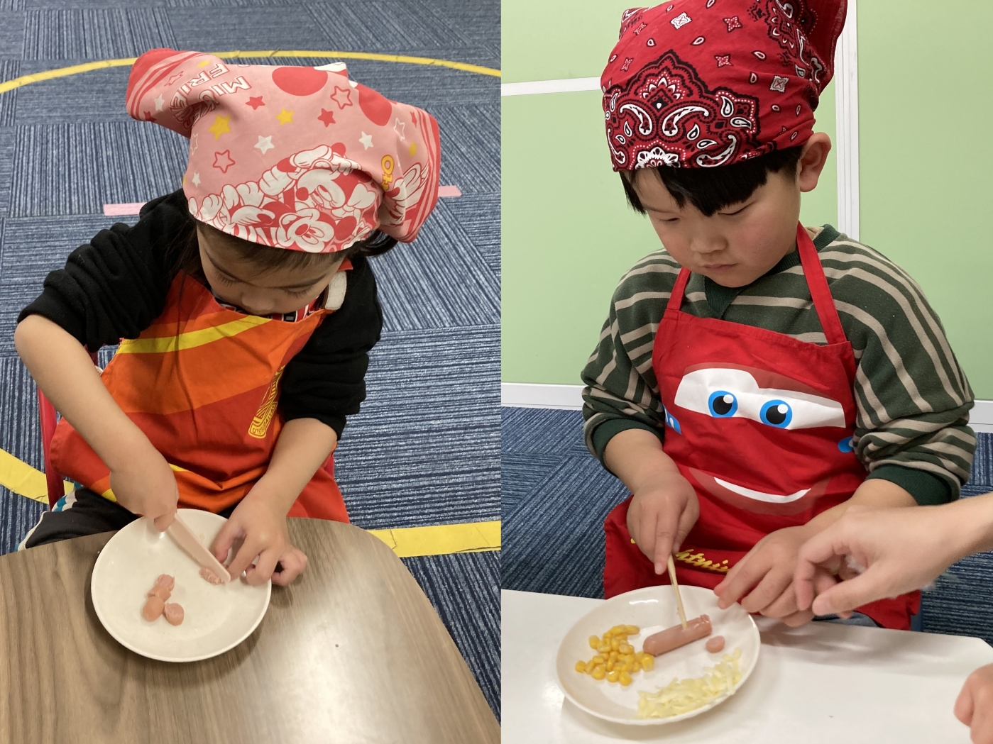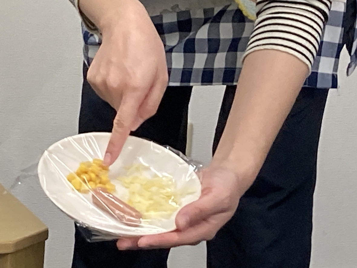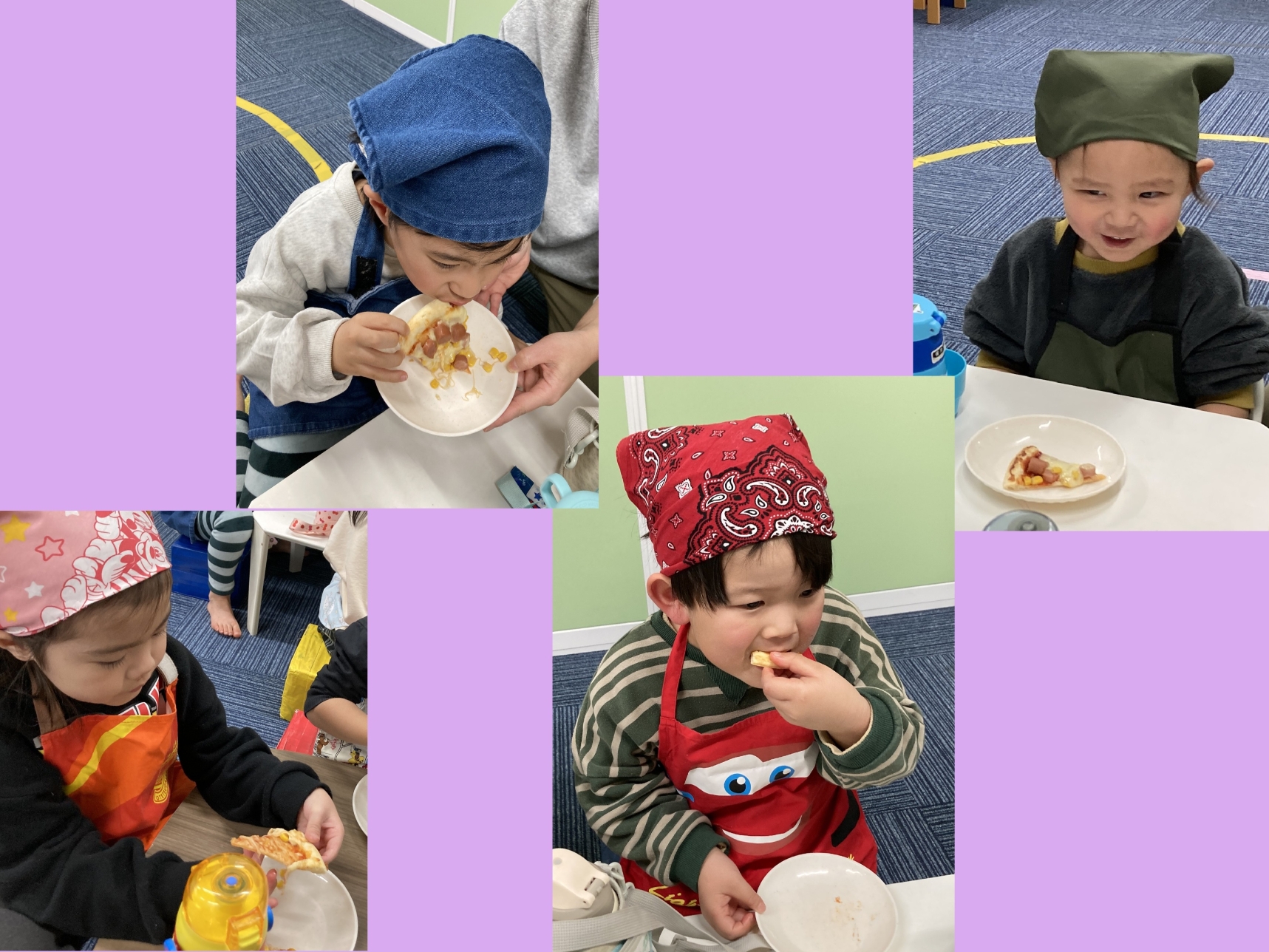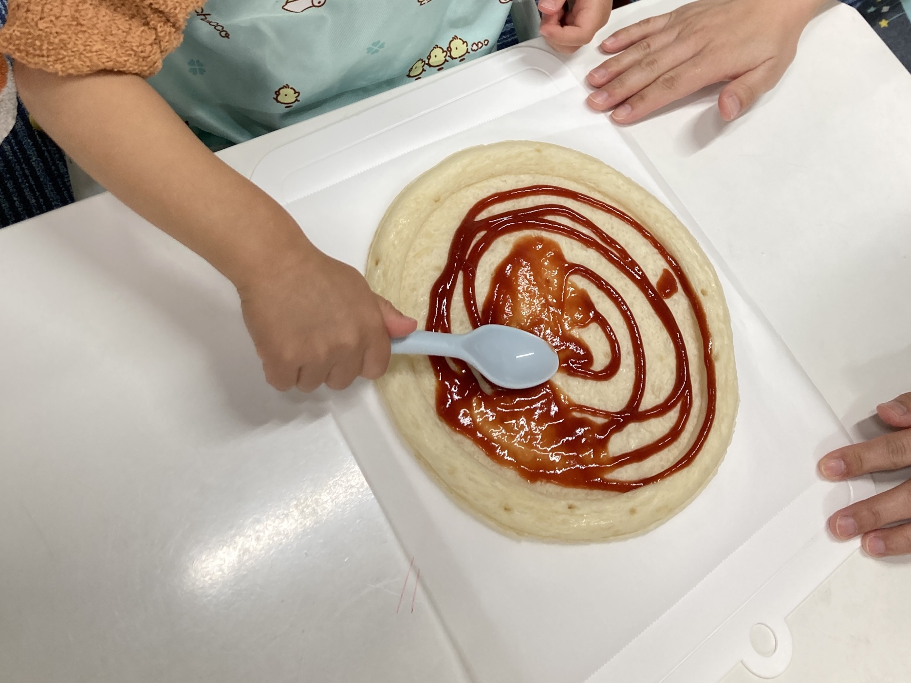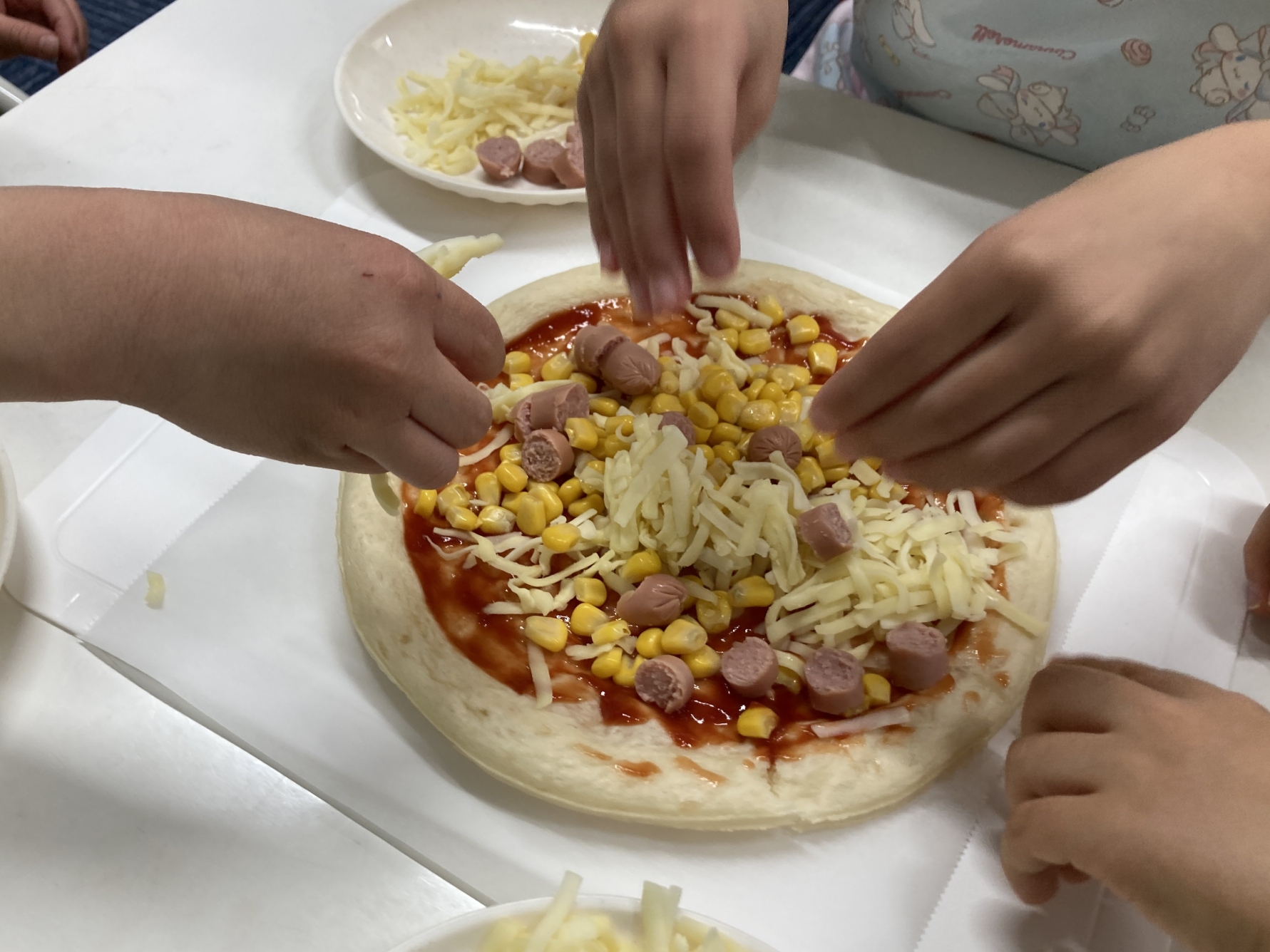 今月のクッキングは、なんと!!!お家で食べるようなでっか~いピザ!!エプロンに着替え、三角巾の中にしっかり髪を入れて、手を洗ったら準備完了‼今日は市販のピザ生地にケチャップを塗るところからスタート。お店で買うようなピザを自分で作れることが楽しみ☆トッピングするのは、コーン・ウインナー・チーズ!ウインナーは、プラスチックナイフで一口サイズに切っていったよ!お皿の上で「コロコロ♬」転がらないように、手で持ちながら切りました。順番にピザ生地の上に具材をのせたら、オーブントースターで焼いたよ!中をのぞいて少しずつチーズが溶けていく様子をみんなで見てたら、早く食べたくなっちゃった(≧◇≦)いい匂いがしてきて、チン‼って音が鳴ったら完成。先生が大きなピザを切り分けてくれて、お友だちとわけっこしたよ!焼きたては熱々だったけど、おかわりをしちゃうくらい美味しかったから、また食べたいな~!