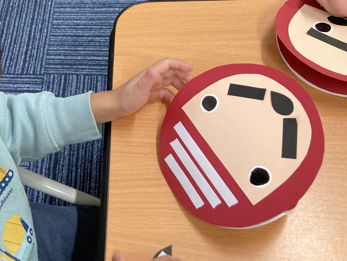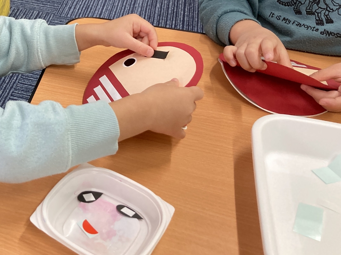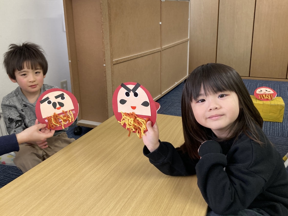 毎回楽しみな製作の日!どんなものを作るのかなあ?先生に聞いたら見本を見せてくれて、今日はゆらゆら揺れるダルマを作るんだって!まずは、台紙に顔のパーツを貼っていったよ。目や口はイメージがつくけど、眉毛やひげはどこに貼ろうかな~‼眉毛は貼り方が違うと、友だちと違う表情を作れて面白い!(^^)!次は、毛糸の洋服を付けていくぞ☆両面テープを剥がして、ギュッギュッと押してつけていく!しっかりつけないと、毛糸がはがれちゃうみたい。テープの白いところにピッタリつけたら、落ちないぞ!全部貼ったら出来上がり~♪完成したダルマがゆらゆら揺れていて、とっても可愛い!