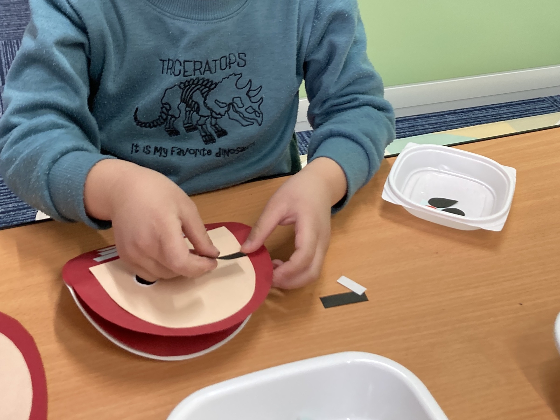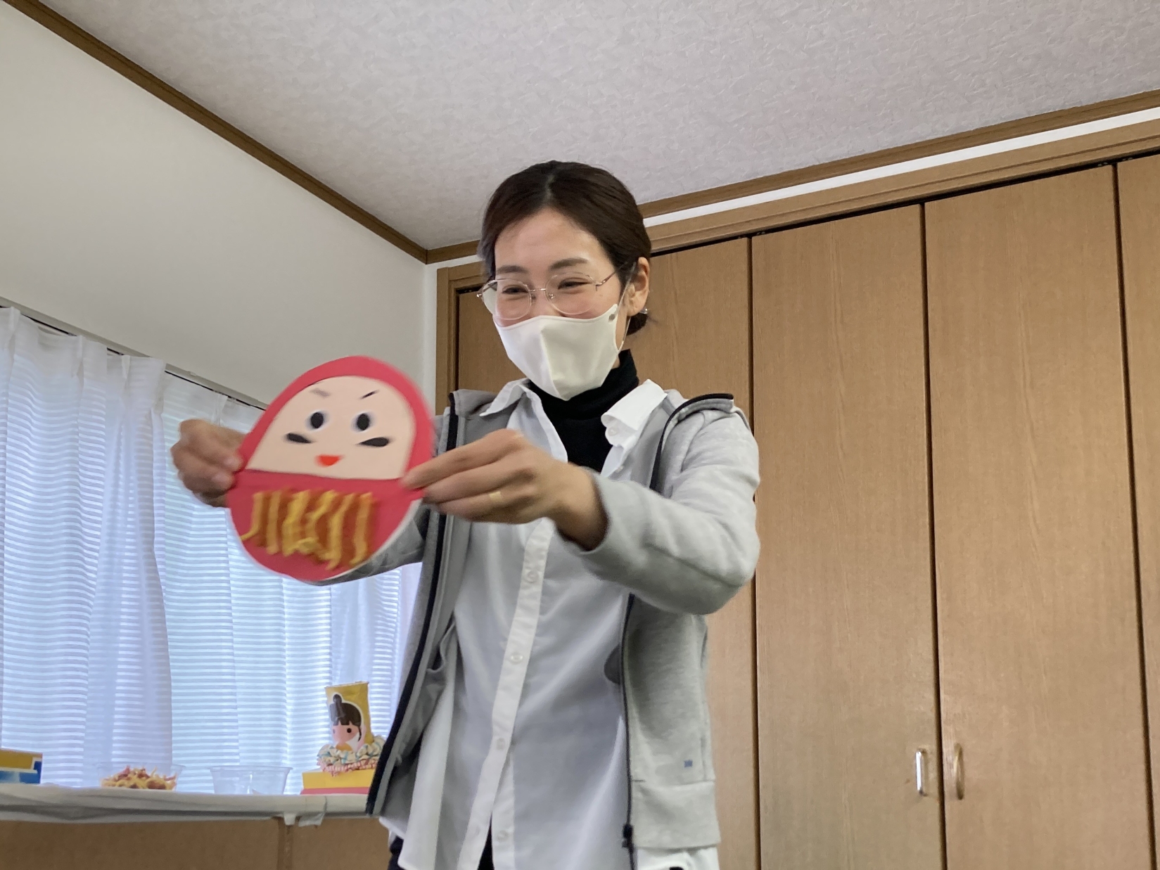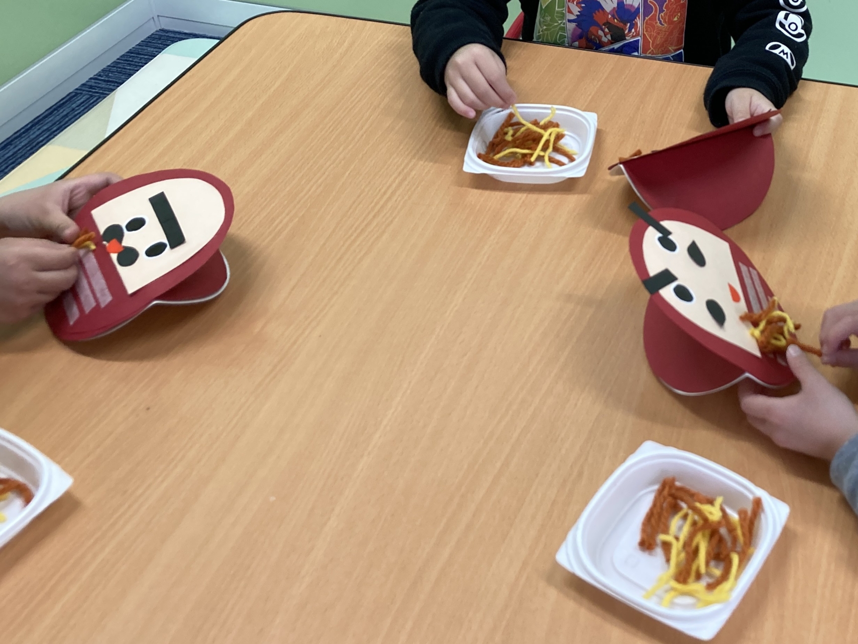 毎回楽しみな製作の日!どんなものを作るのかなあ?先生に聞いたら見本を見せてくれて、今日はゆらゆら揺れるダルマを作るんだって!まずは、台紙に顔のパーツを貼っていったよ。目や口はイメージがつくけど、眉毛やひげはどこに貼ろうかな~‼眉毛は貼り方が違うと、友だちと違う表情を作れて面白い!(^^)!次は、毛糸の洋服を付けていくぞ☆両面テープを剥がして、ギュッギュッと押してつけていく!しっかりつけないと、毛糸がはがれちゃうみたい。テープの白いところにピッタリつけたら、落ちないぞ!全部貼ったら出来上がり~♪完成したダルマがゆらゆら揺れていて、とっても可愛い!