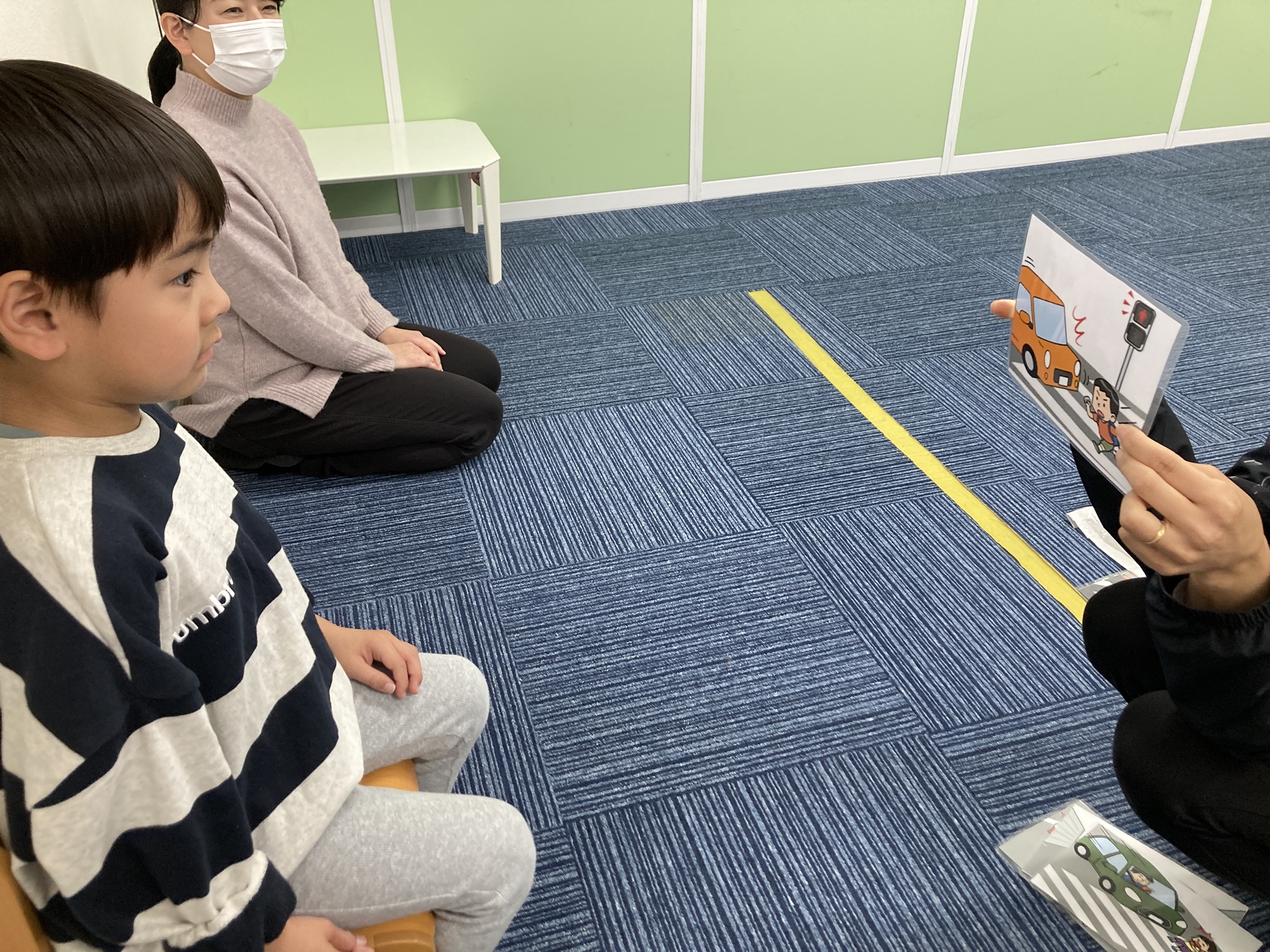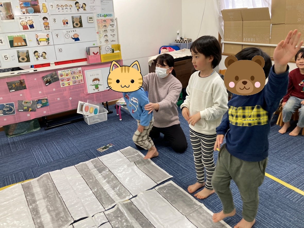 2026年01月28日(水) スタッフブログ 交通ルールを学ぼう!! 今日は交通ルールの勉強!!本来なら、外に出て本物の横断歩道を渡る予定でしたが、今日は寒いので、お部屋の中で行いました。最初はカードを使ってお勉強!!続いてお部屋の中に横断歩道を作って渡り方の練習をしました。 まずは部屋でカードを使ってお勉強!