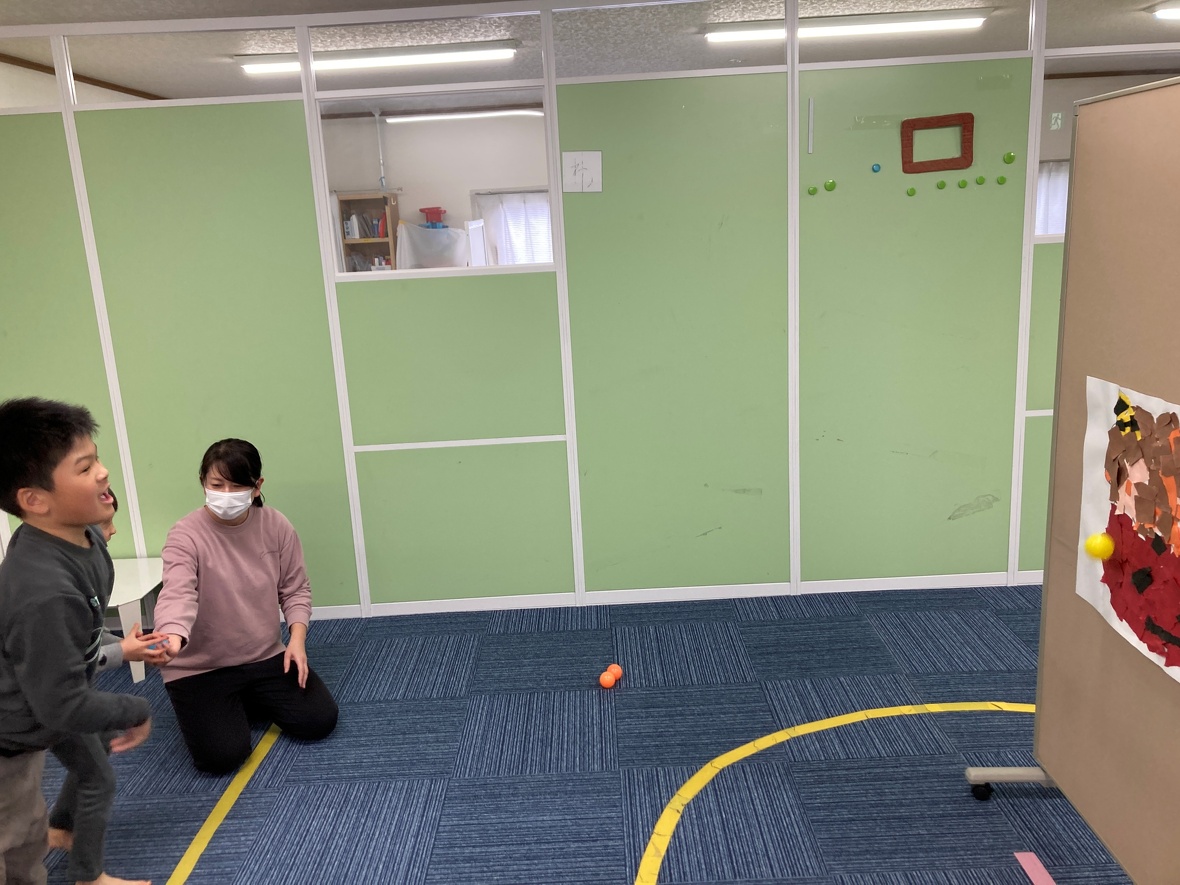 2026年02月02日(月) スタッフブログ 節分ゲームをしたよ! 明日2月3日は節分!節分にそなえて別の日にみんなで画用紙をちぎってペタペタ貼って鬼の顔を製作したよ! 鬼の顔の色はいろいろ工夫して赤にしてみました?!!出来上がると迫力があって力強い鬼が完成☆ そして今日の節分ゲームでは、鬼さんのお面に向かってボールを投げて的あてをしたよ!! 少し離れていたので、なかなか当たらなくて難しかったけど、皆で力を合わせて頑張ったよ(*^^)v 皆で作った大きな鬼の顔>^_^< 鬼は外~!