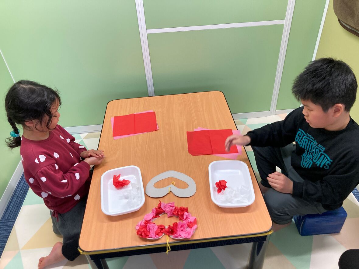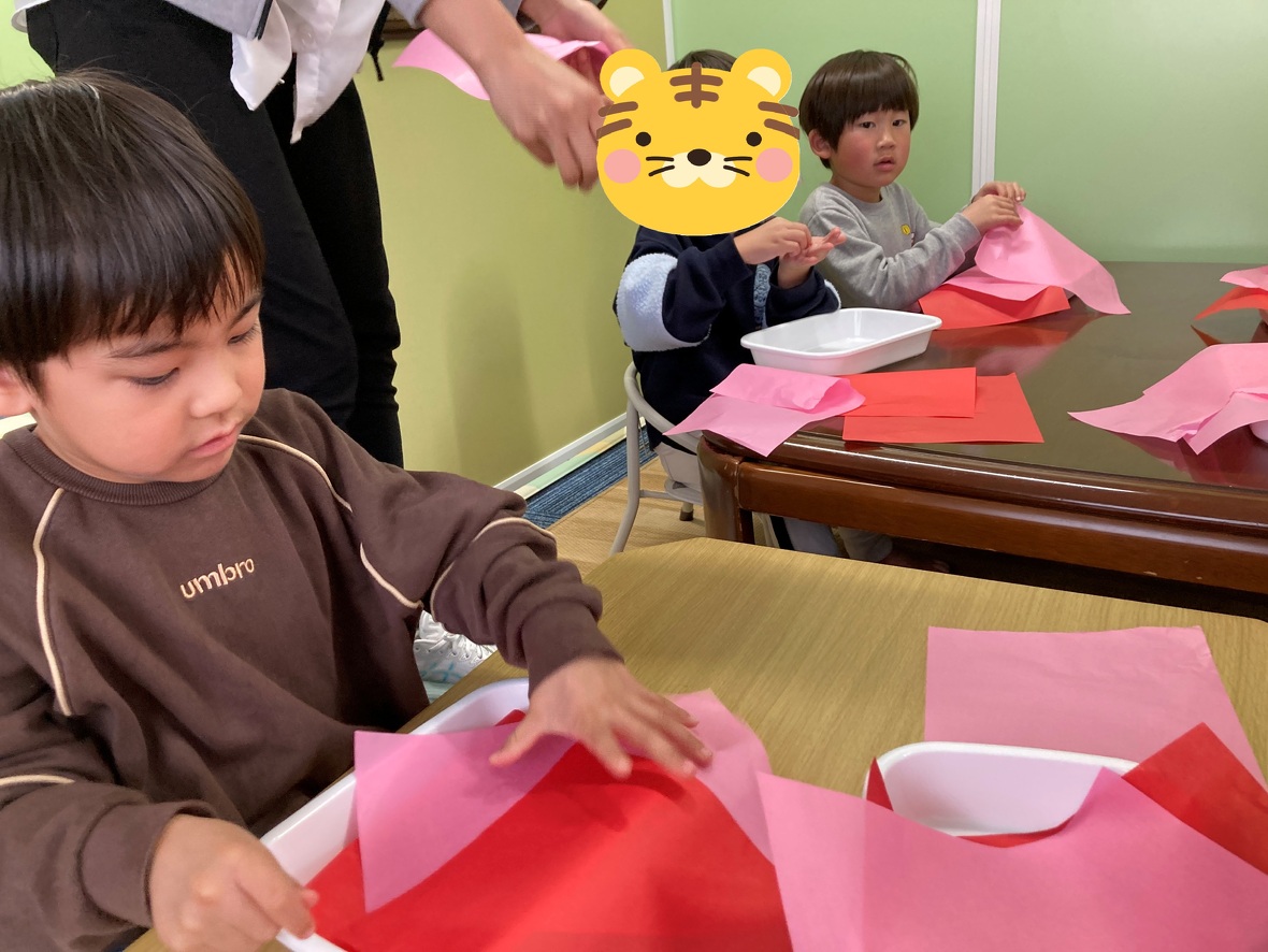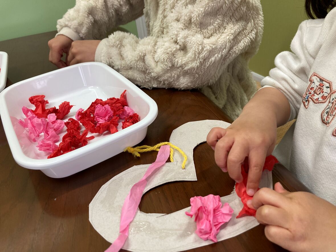 まず最初にピンクと赤と白の紙をビリビリちぎって、次に手のひらで「クルクルッ」と丸めたパーツを作ります。準備ができたら先生が作ってくれていたハートの台紙にのりで貼っていくよ(≧▽≦)