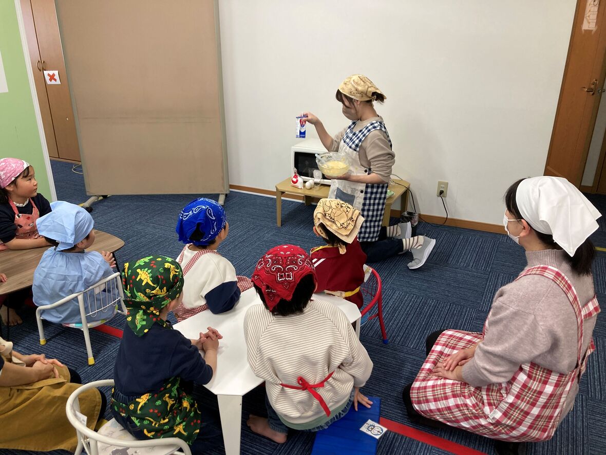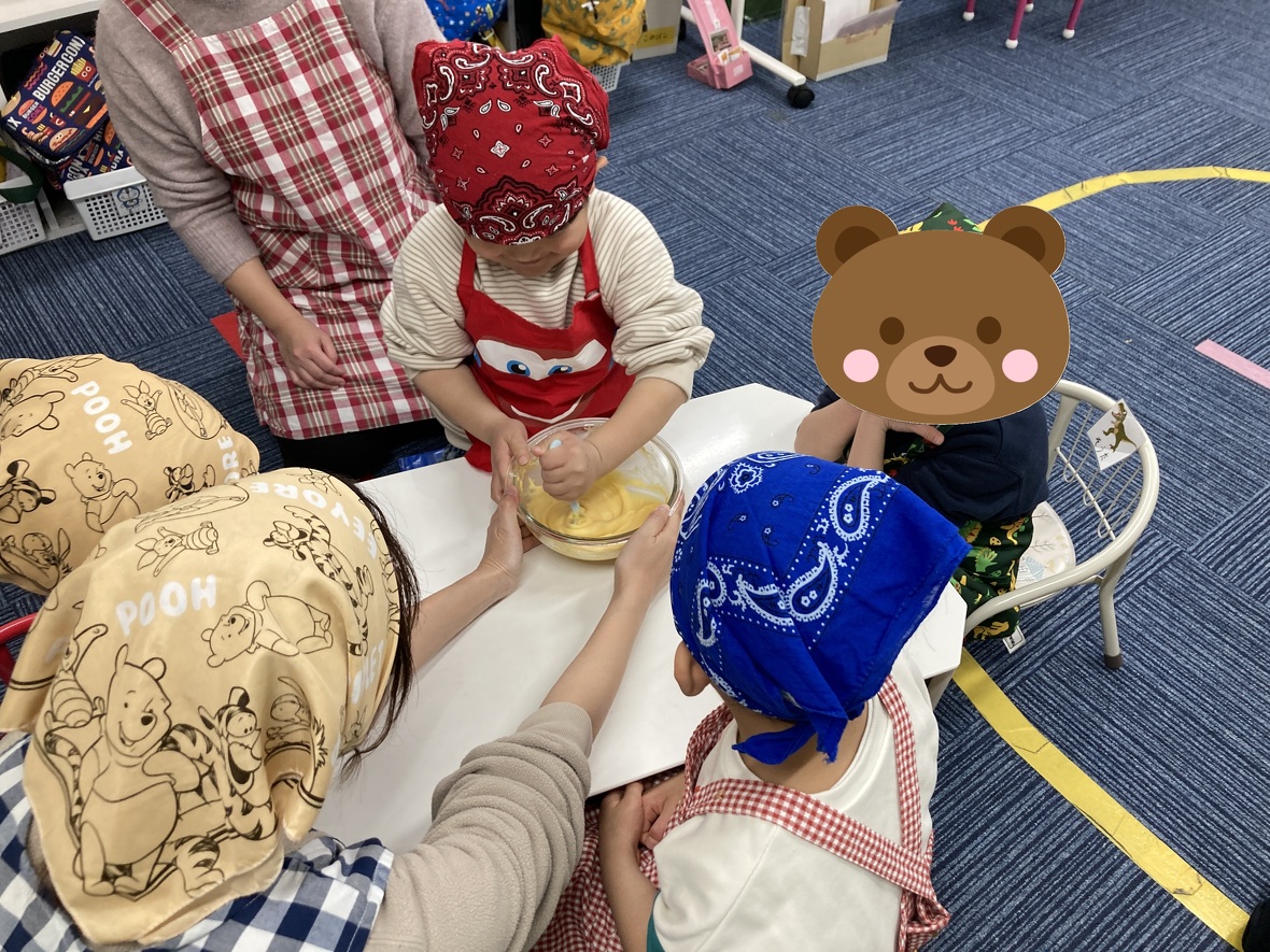混ぜた生地は焼く前から甘くて良い匂いがしたよ♬先生と一緒にカップに生地をいれてレンジで1分半チンッ