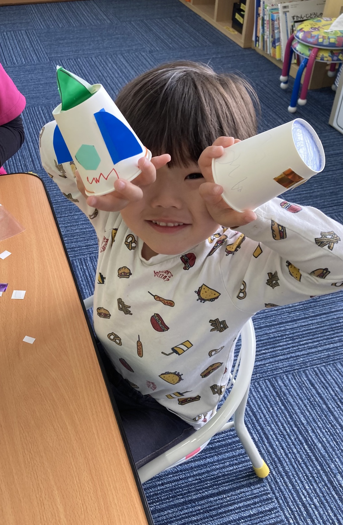 2023年04月11日(火) スタッフブログ いっぱい遊んだよ!! 制作ではロケット作り! 切って貼ってゴムを付けたら・・ 見て!こんなに素敵なロケットが完成! 『3・2・1発射!』元気な声が響いていました。 集団遊びでは、ハンカチ落としと椅子取りゲームに挑戦。 勝ったり負けたり、追いかけられたり・・・ 子ども達の笑い声一杯の楽しい活動になりました♪