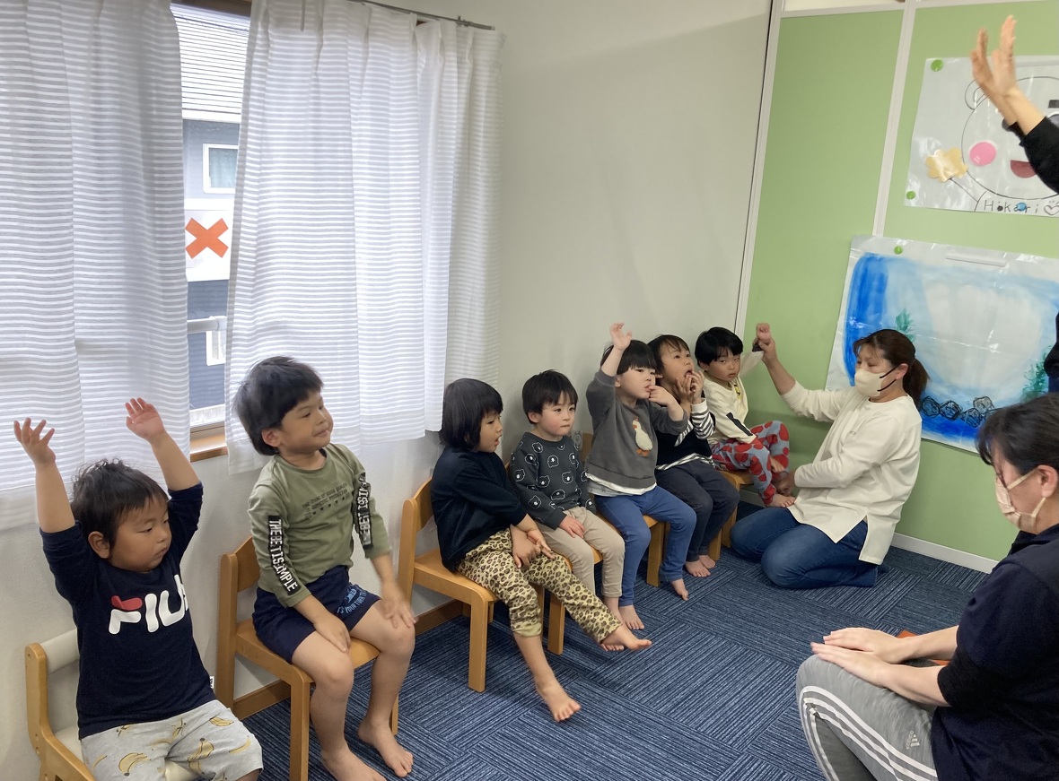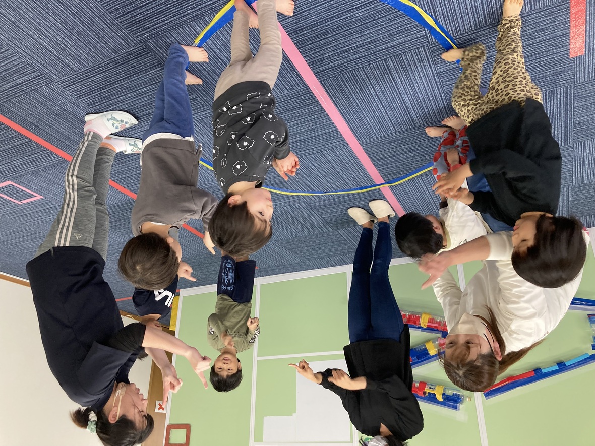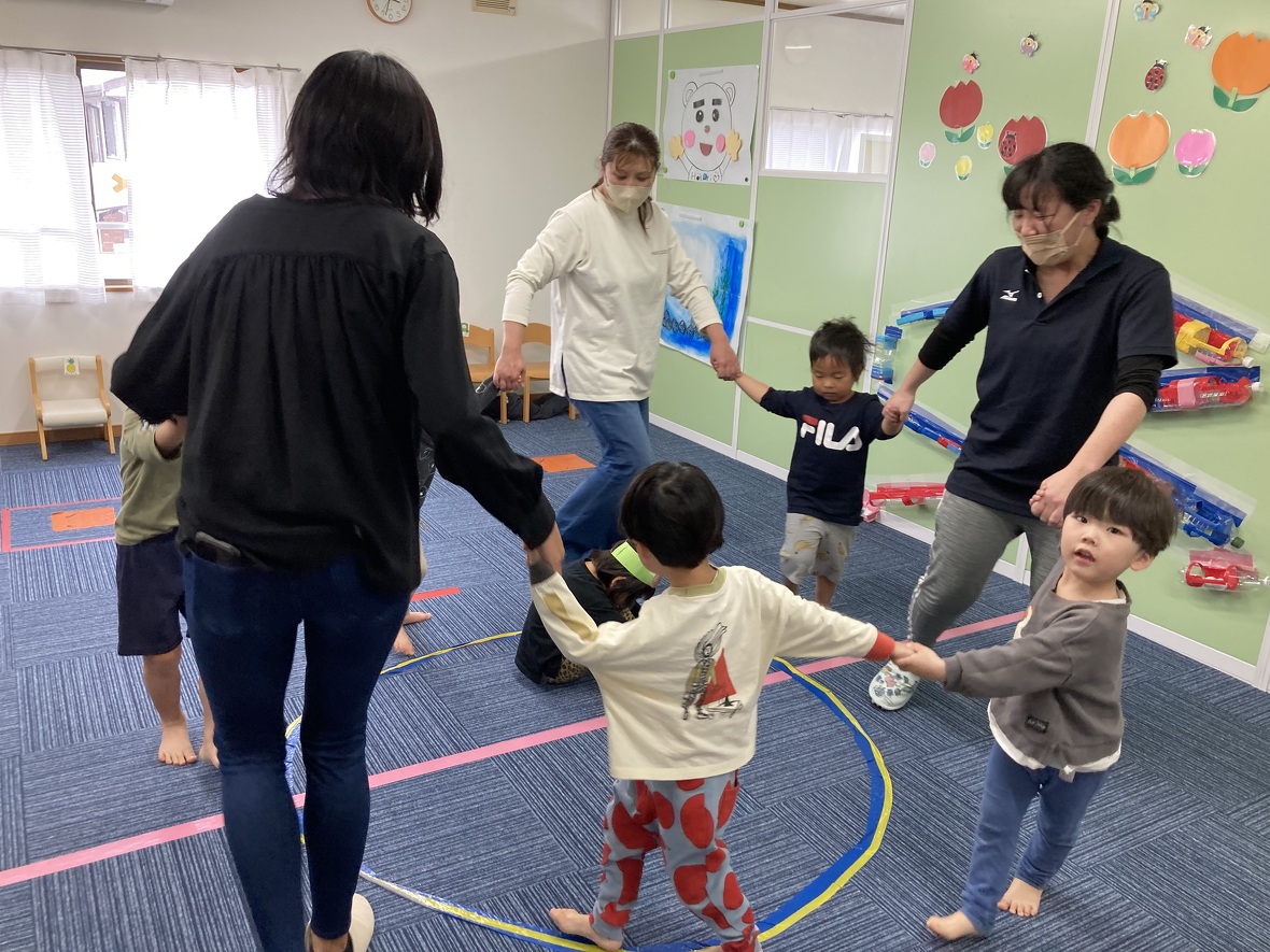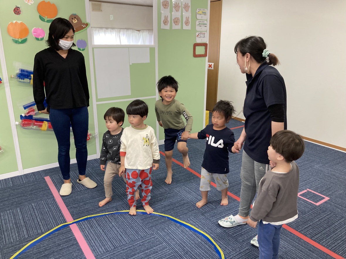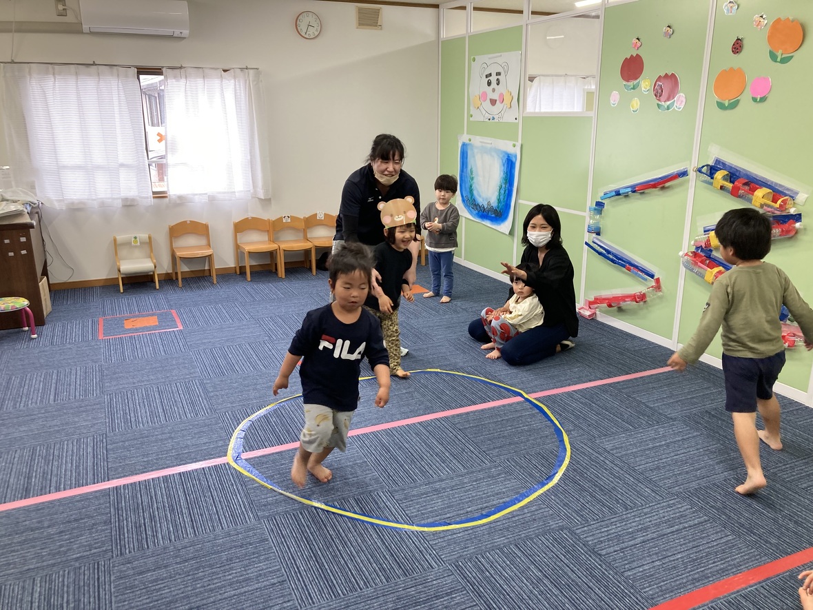 2023年04月24日(月) スタッフブログ 今日の集団遊びは・・・。 今日の集団遊びは『おりょうりあそび』『むっくりくまさん』。 みんなで手を繋ぎ、大きなボウルを表現し、身体全体を使って 材料を混ぜたり、焼いたりしながらケーキ完成させ、大きなお口で モグモグモグ。 寝ていたくまさんが眠りから覚め、大変!追いかけてくる!! 捕まらないように一生懸命逃げる子ども達。 ドキドキしながらも嬉しそうに遊ぶ元気な声が部屋中に響きわたりました☆