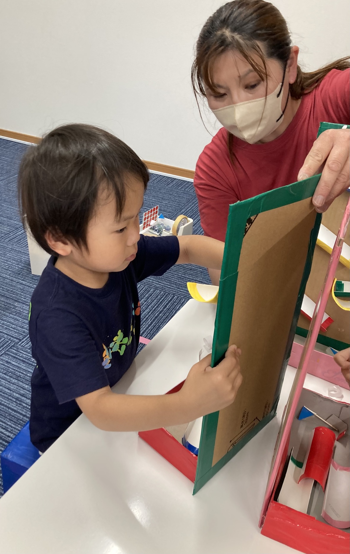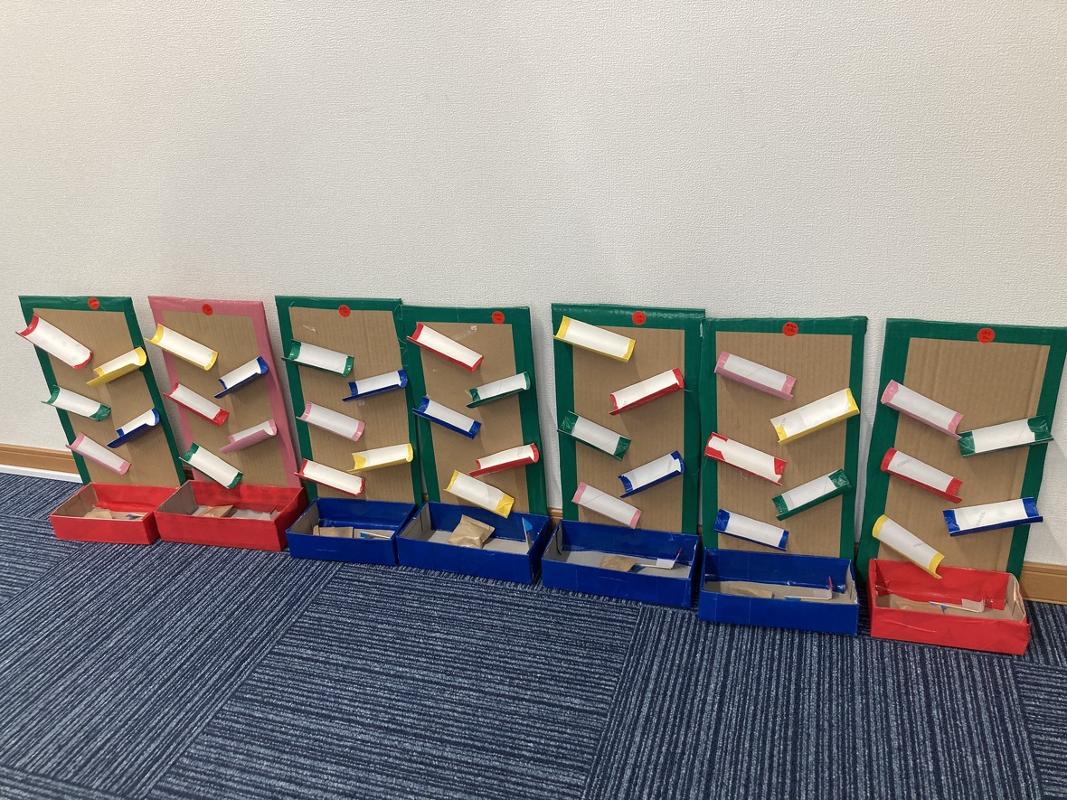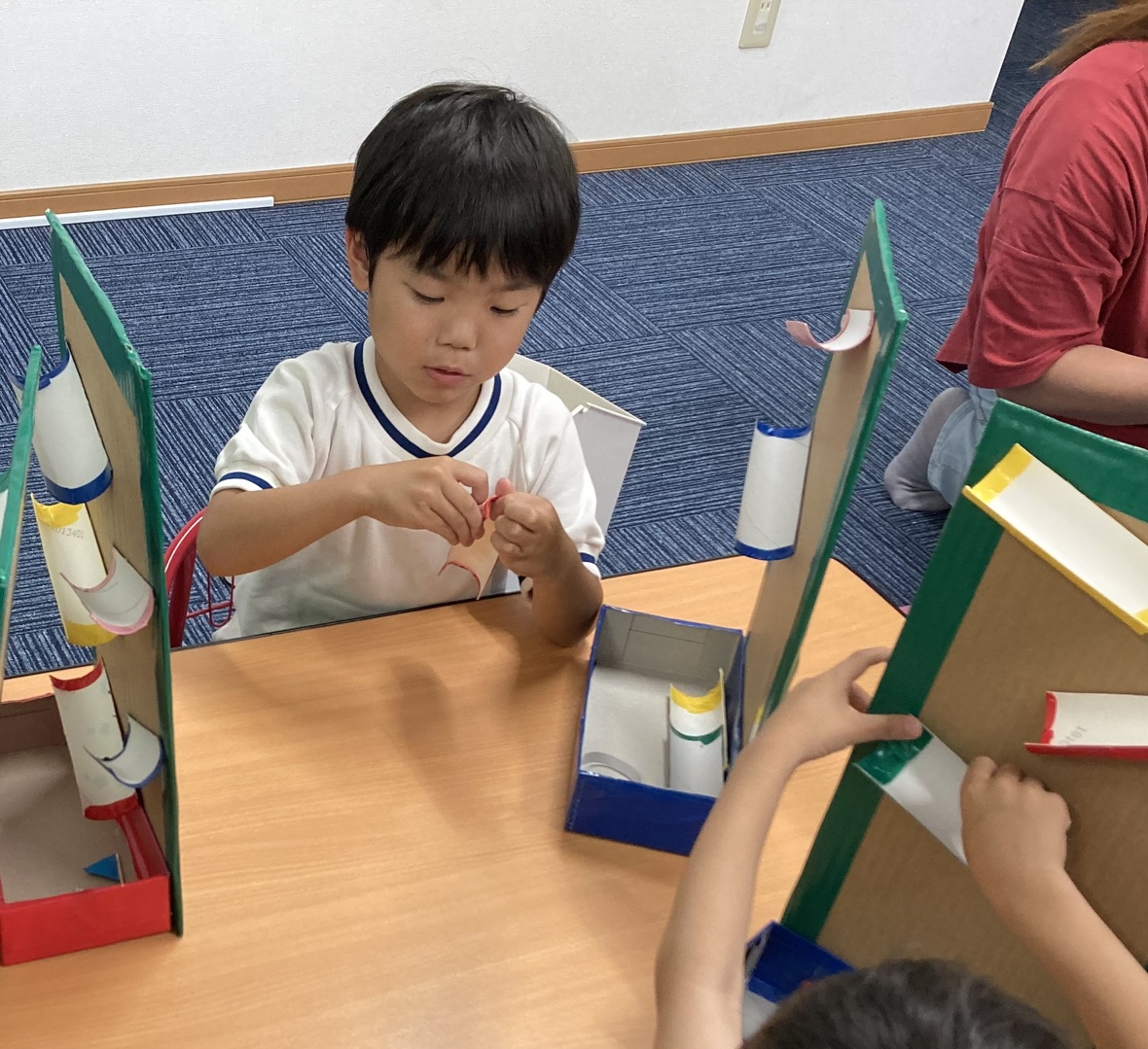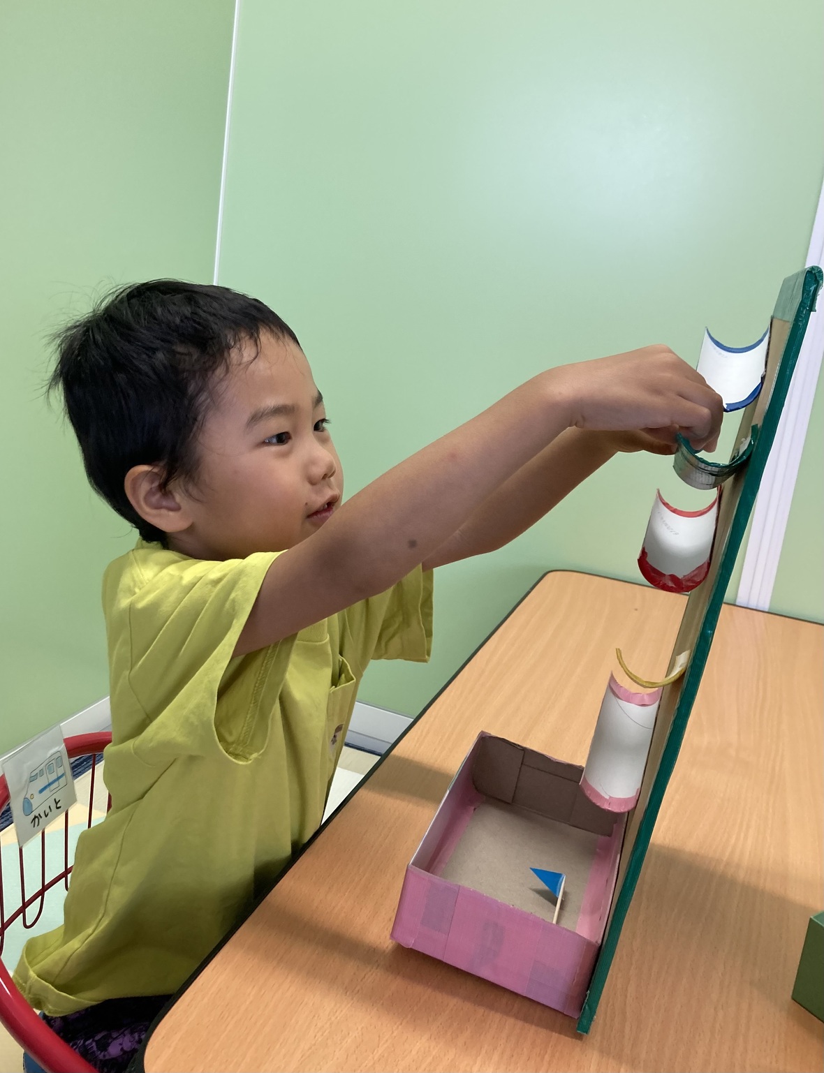 自分専用の土台に、ビー玉が通る道を付けていき、『できてるかな?』『ちゃんと通るかな?』と考えながら真剣に作り進めていきました。