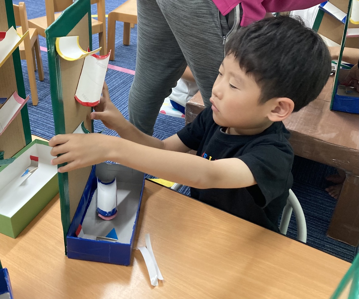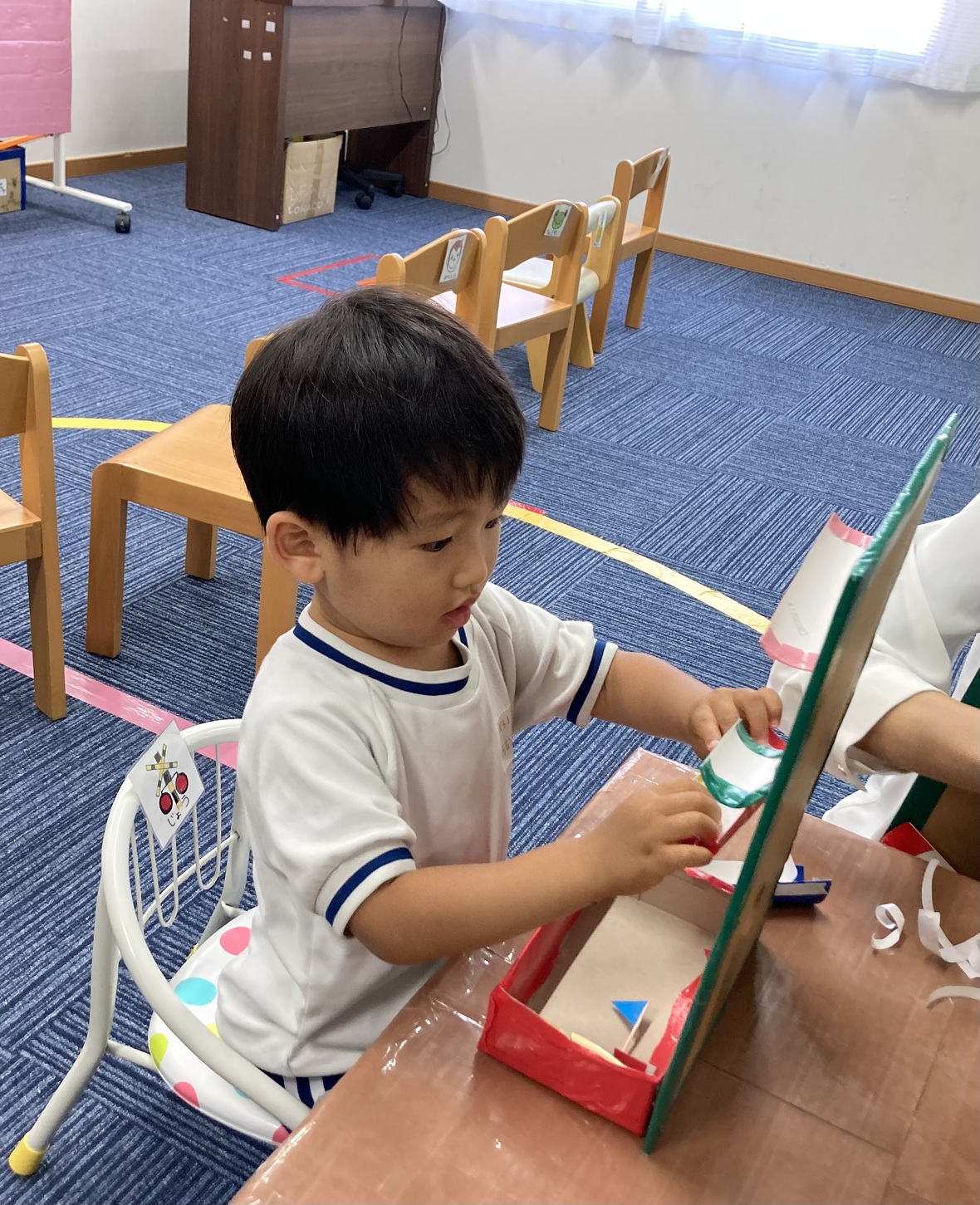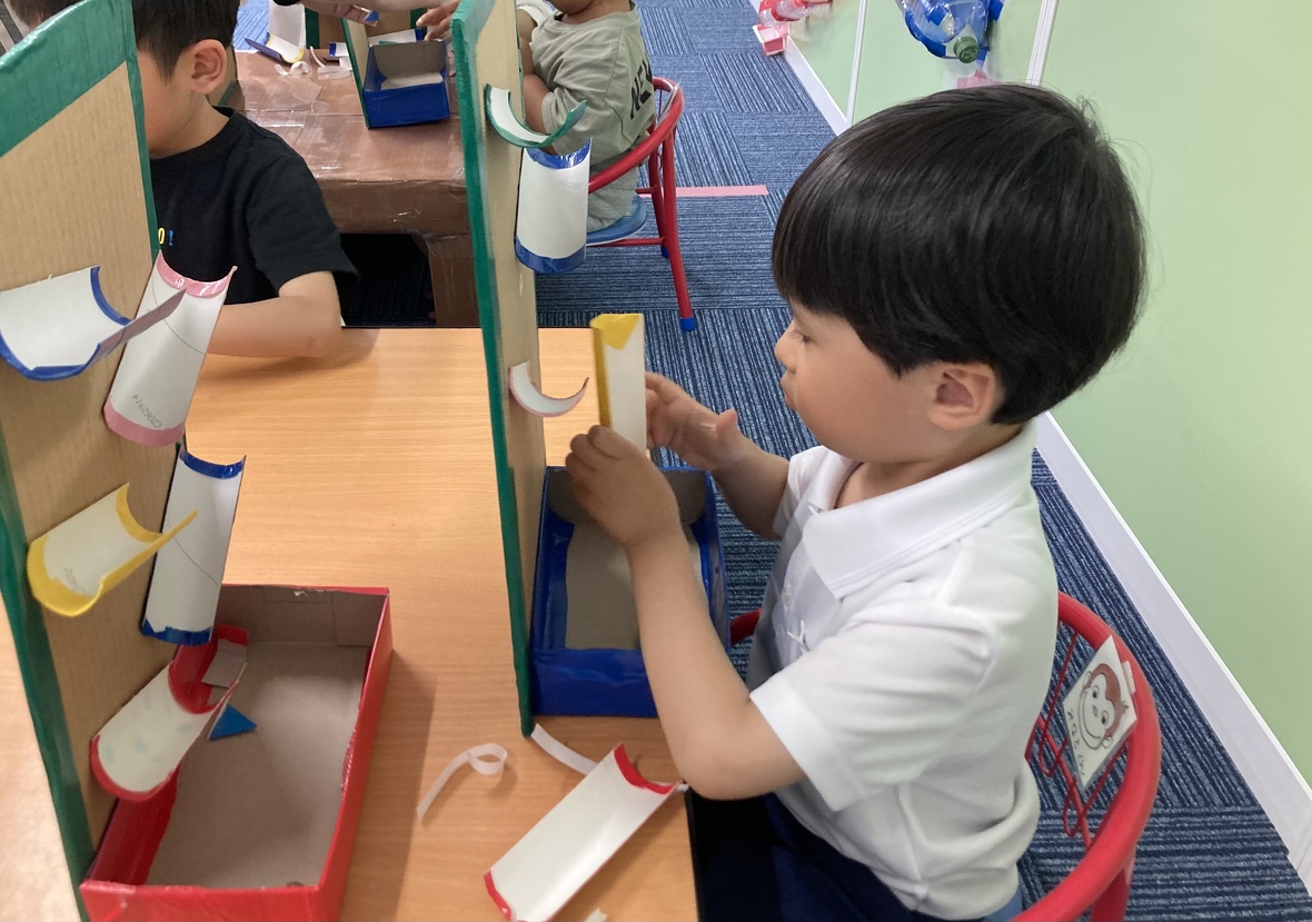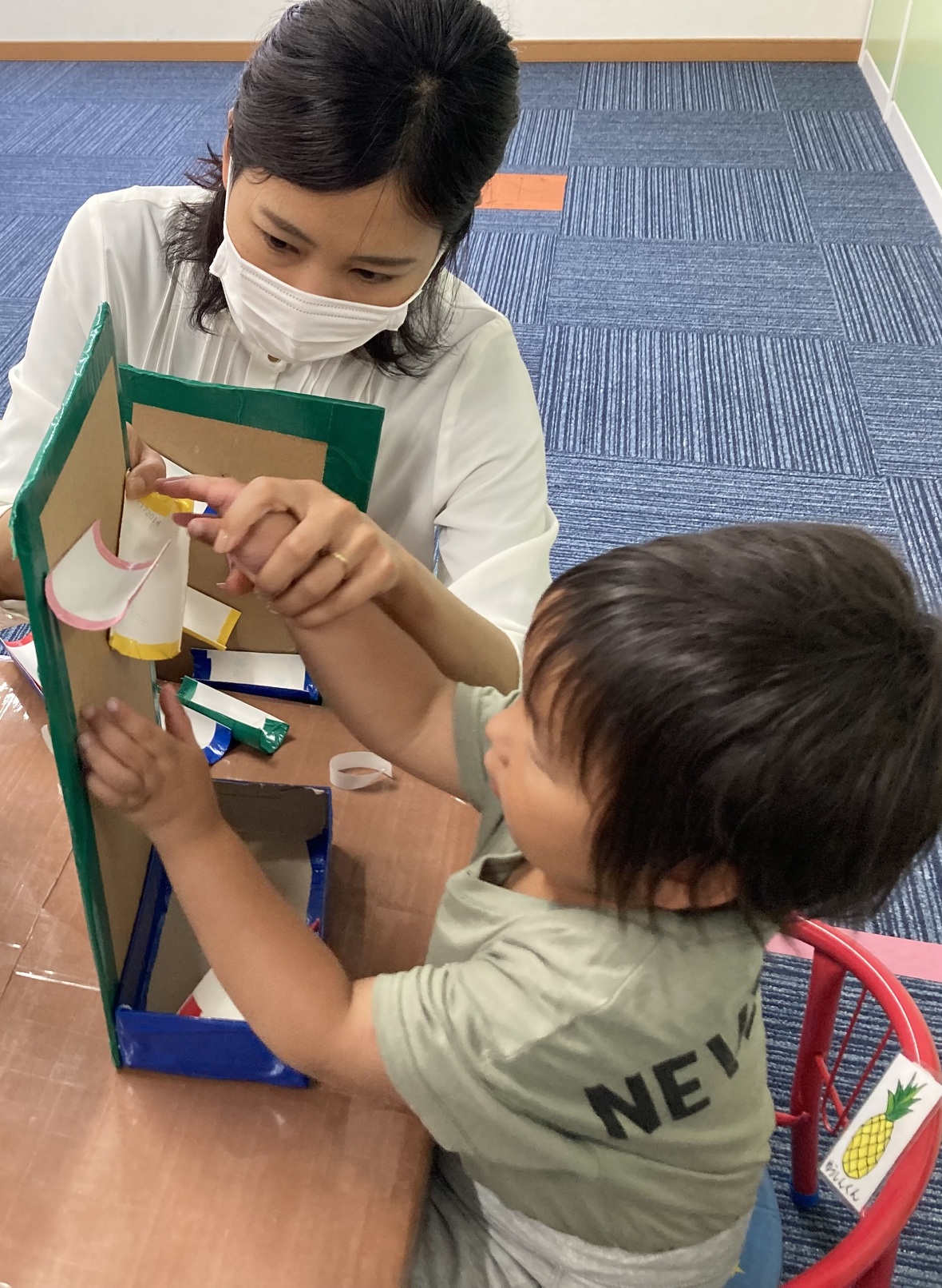 自分専用の土台に、ビー玉が通る道を付けていき、『できてるかな?』『ちゃんと通るかな?』と考えながら真剣に作り進めていきました。