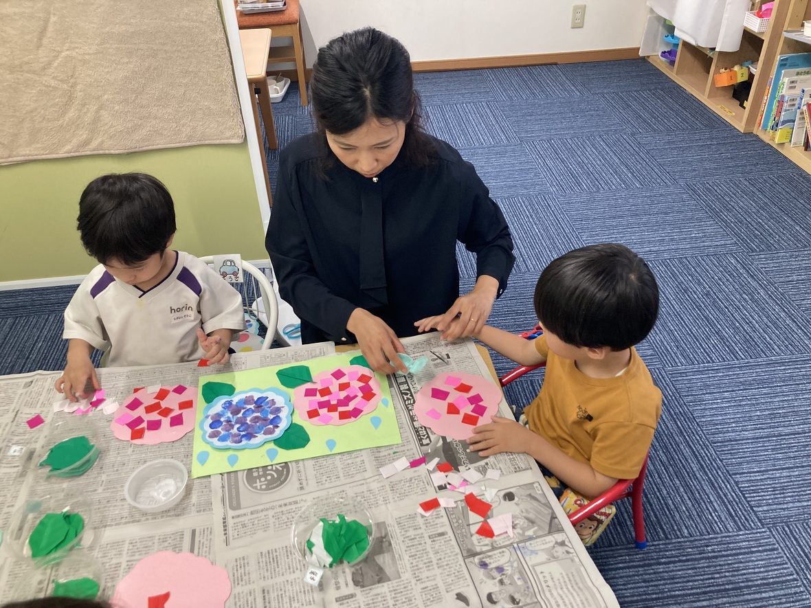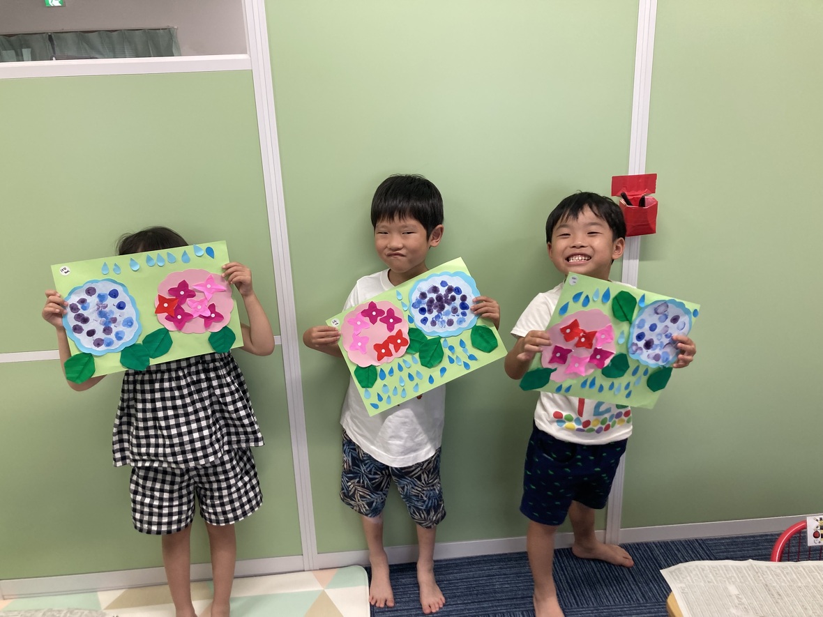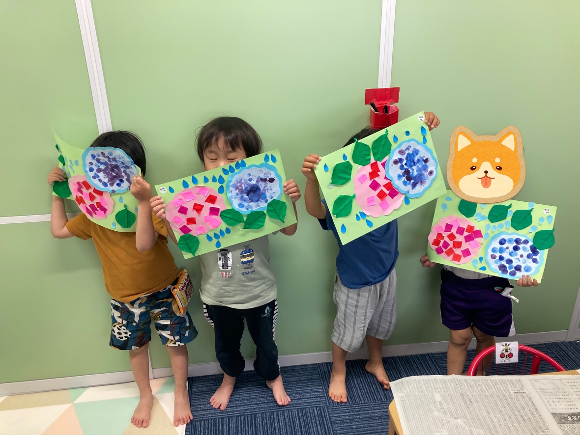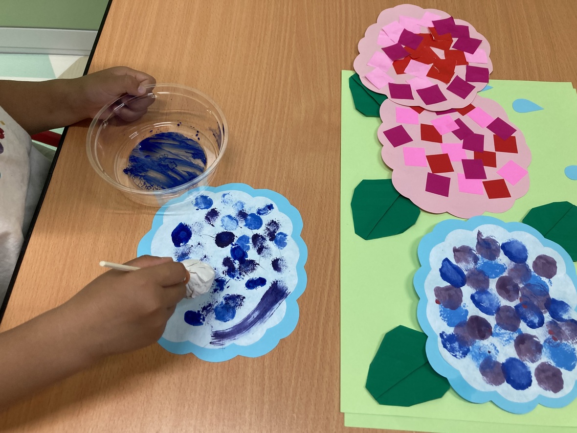 今日は、梅雨の制作として、紫陽花をモチーフにしたもの作っていきました☆ 様々な技法を使い最後まで集中して取り組むことができました♬