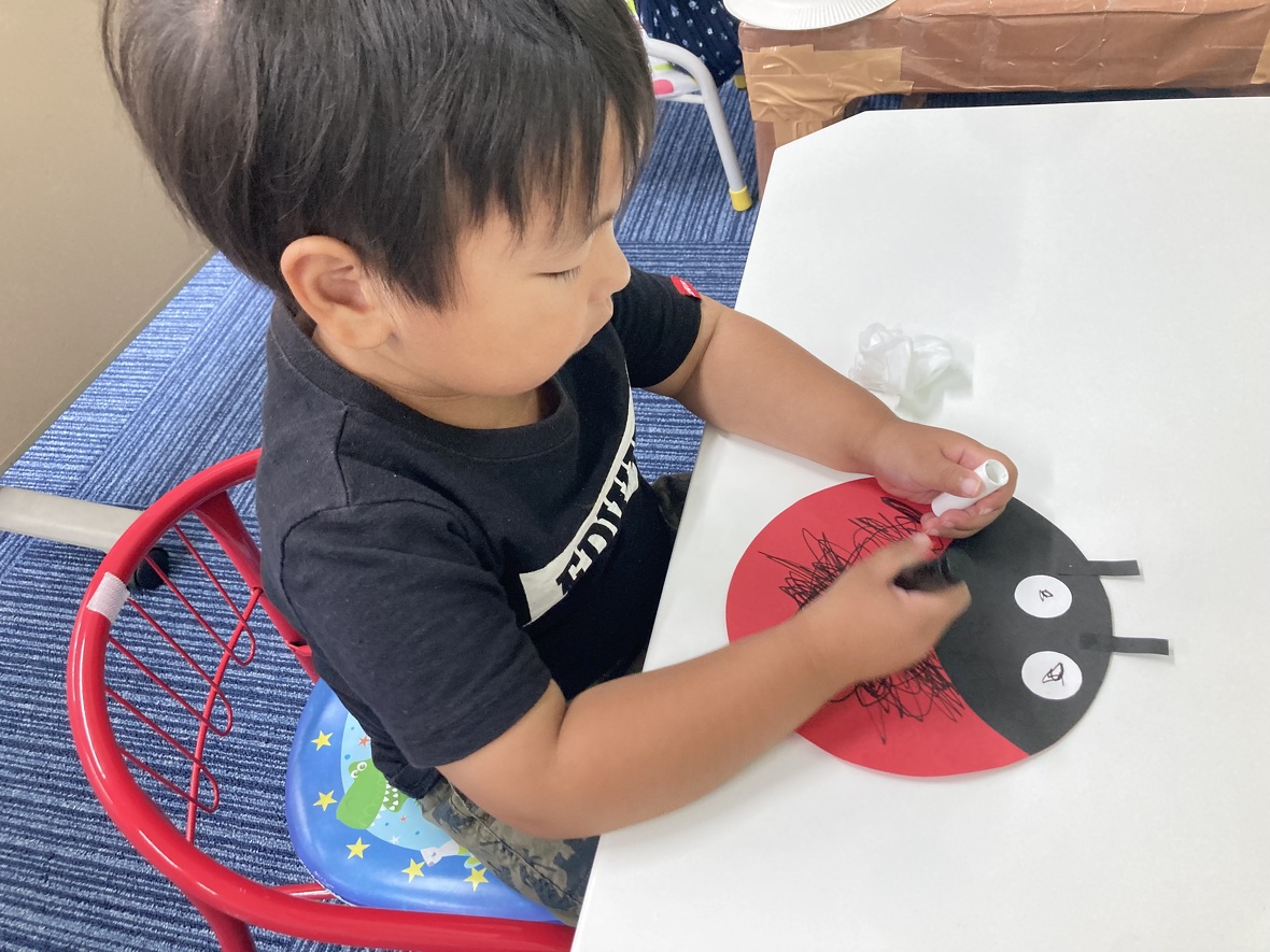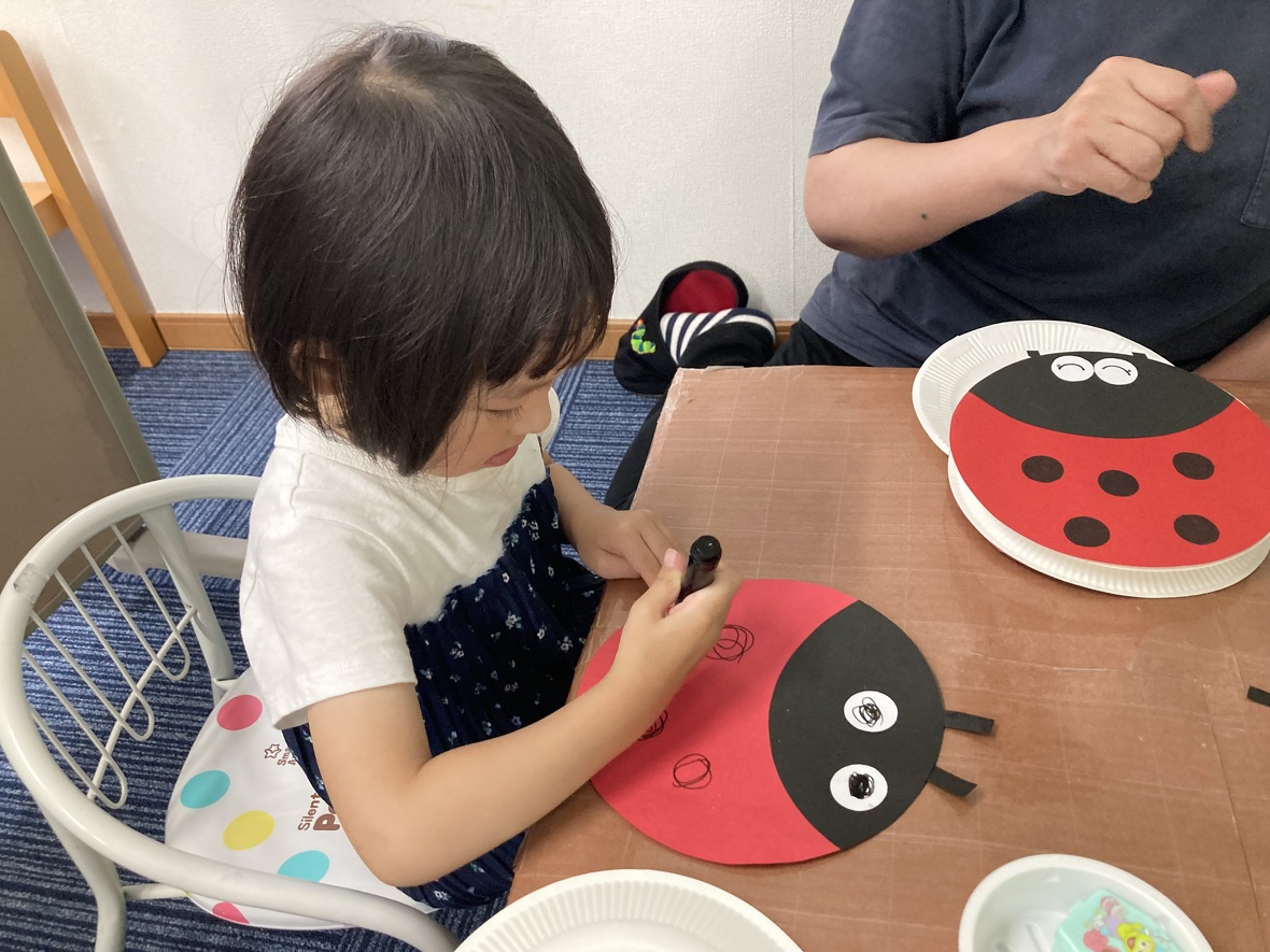 2023年06月27日(火) スタッフブログ てんとう虫を作ったよ! 今日はみんで『コロコロてんとう虫』を作りました! 話を真剣に聞き、製作開始! 目を付け、斑紋も自分で考えて描き、最後は紙皿に貼り付けて出来上がり。 転がし方のコツを教えてもらい、いざ、転がしチャレンジ! 思い通りに転がらない場面もありましたが、足の下を通したり、お友だちと競争のように転がしあい、 自分で作ったもので遊ぶ楽しさを味わいました。 保護者がお迎えに来られたら、すぐに製作したことを報告していた子ども達でした☆