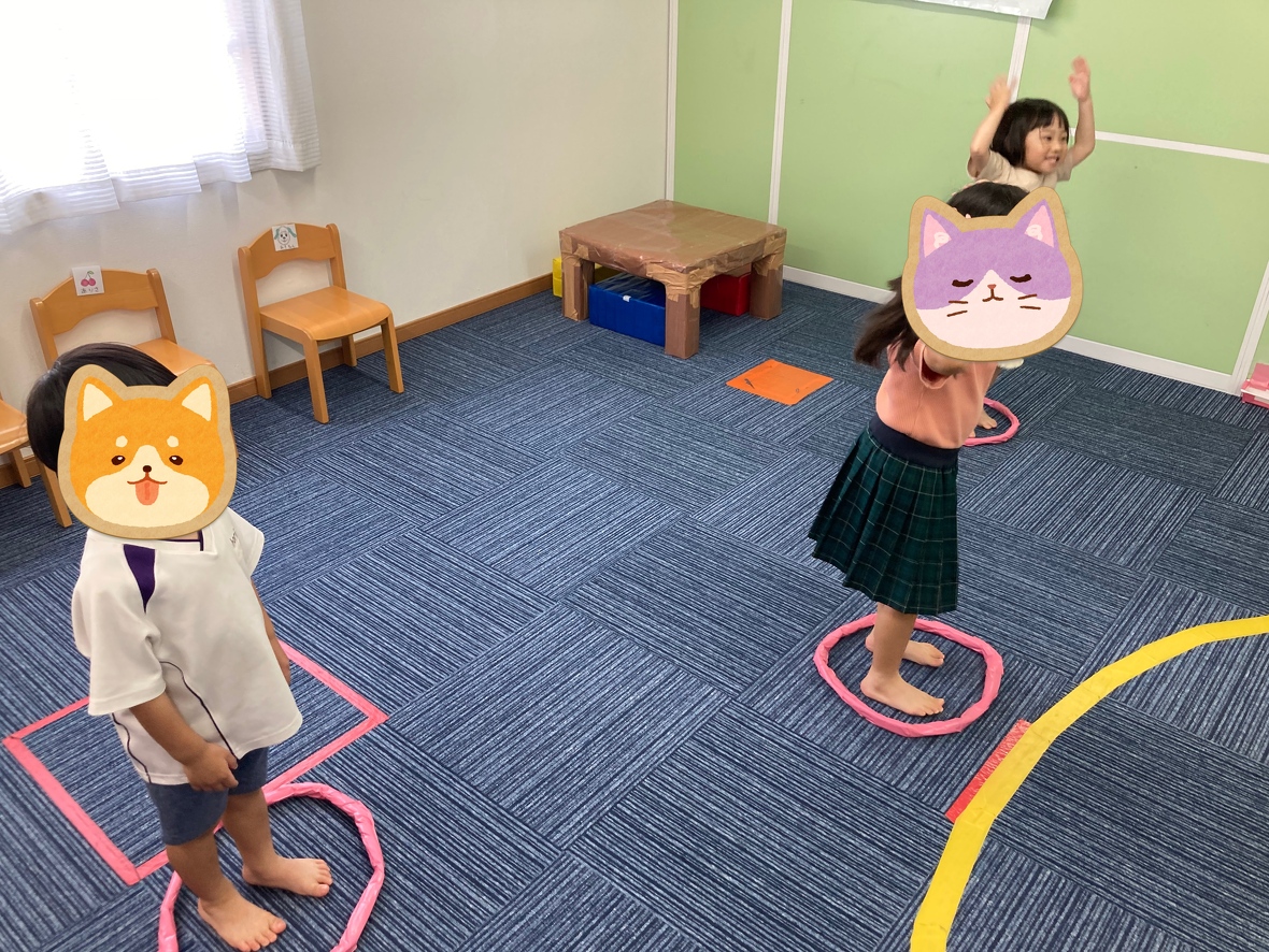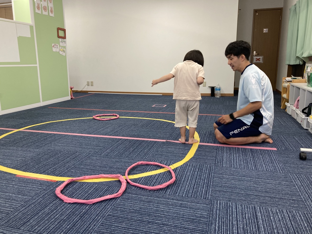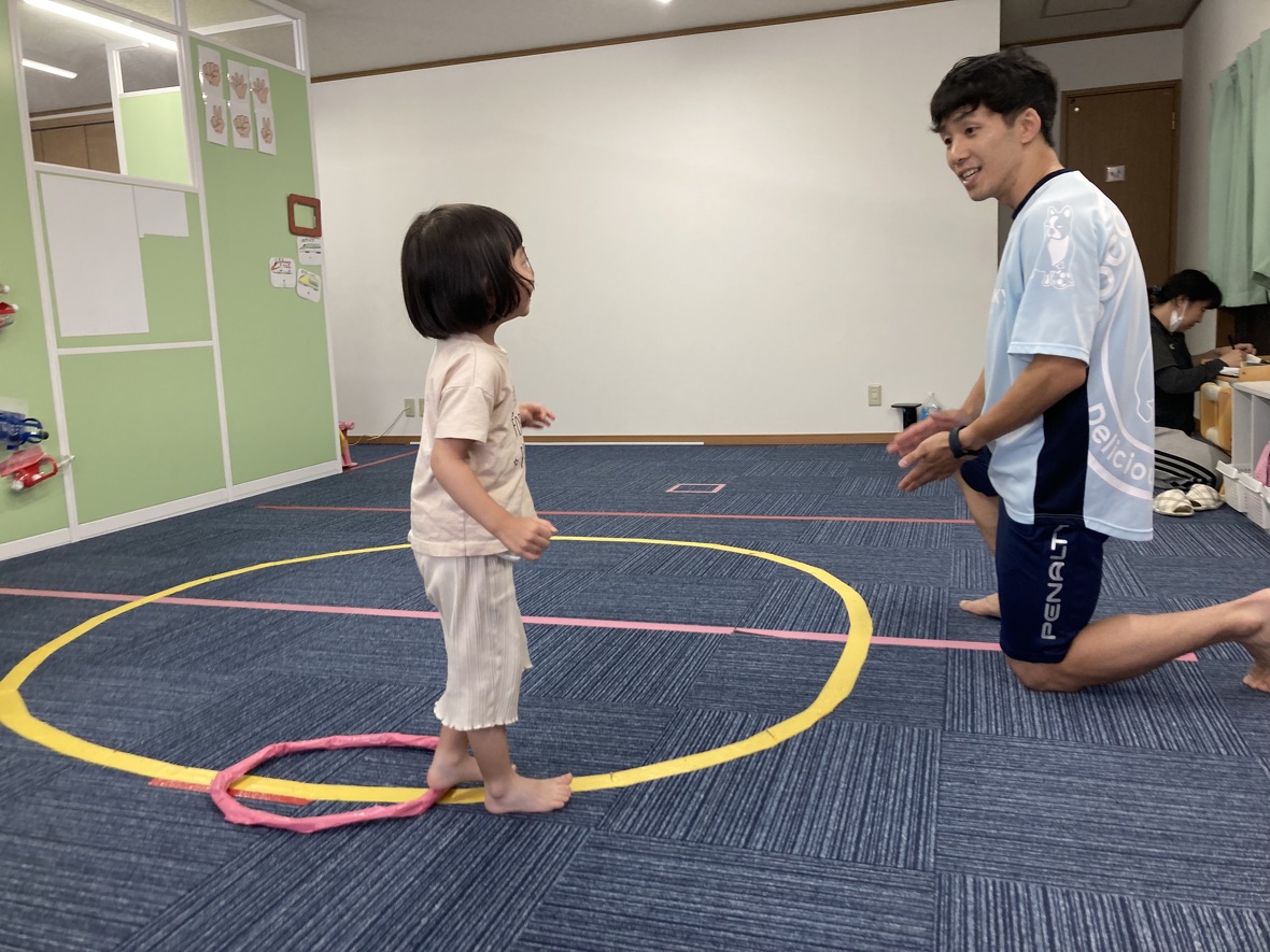 2023年07月04日(火) スタッフブログ 運動療育を楽しむ♪ 今日は、タカ先生と一緒にジャンプに特化した、体操を教えてもらいました♬ 音楽に合わせて跳ぶ、両足ジャンプ、頭やお腹などの身体を触りながらのジャンプなど体操をしていきました♪ 他にも、輪っかをくぐる・ハードルをまたぐなど、身体全体を使い運動を楽しみました☆
