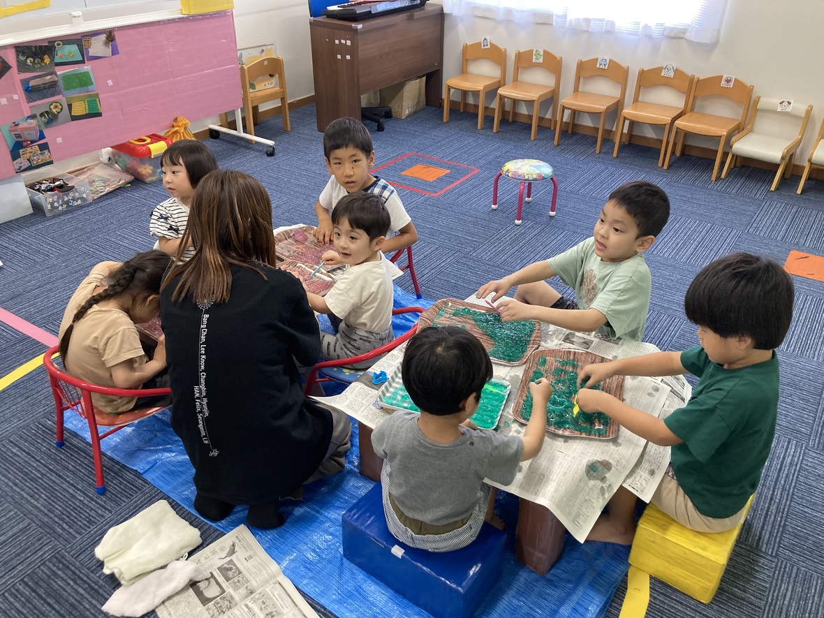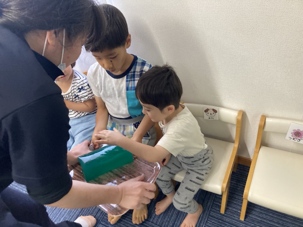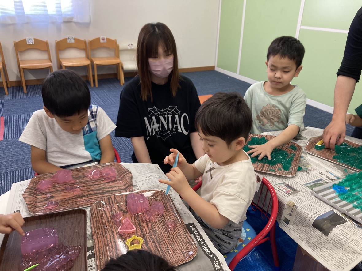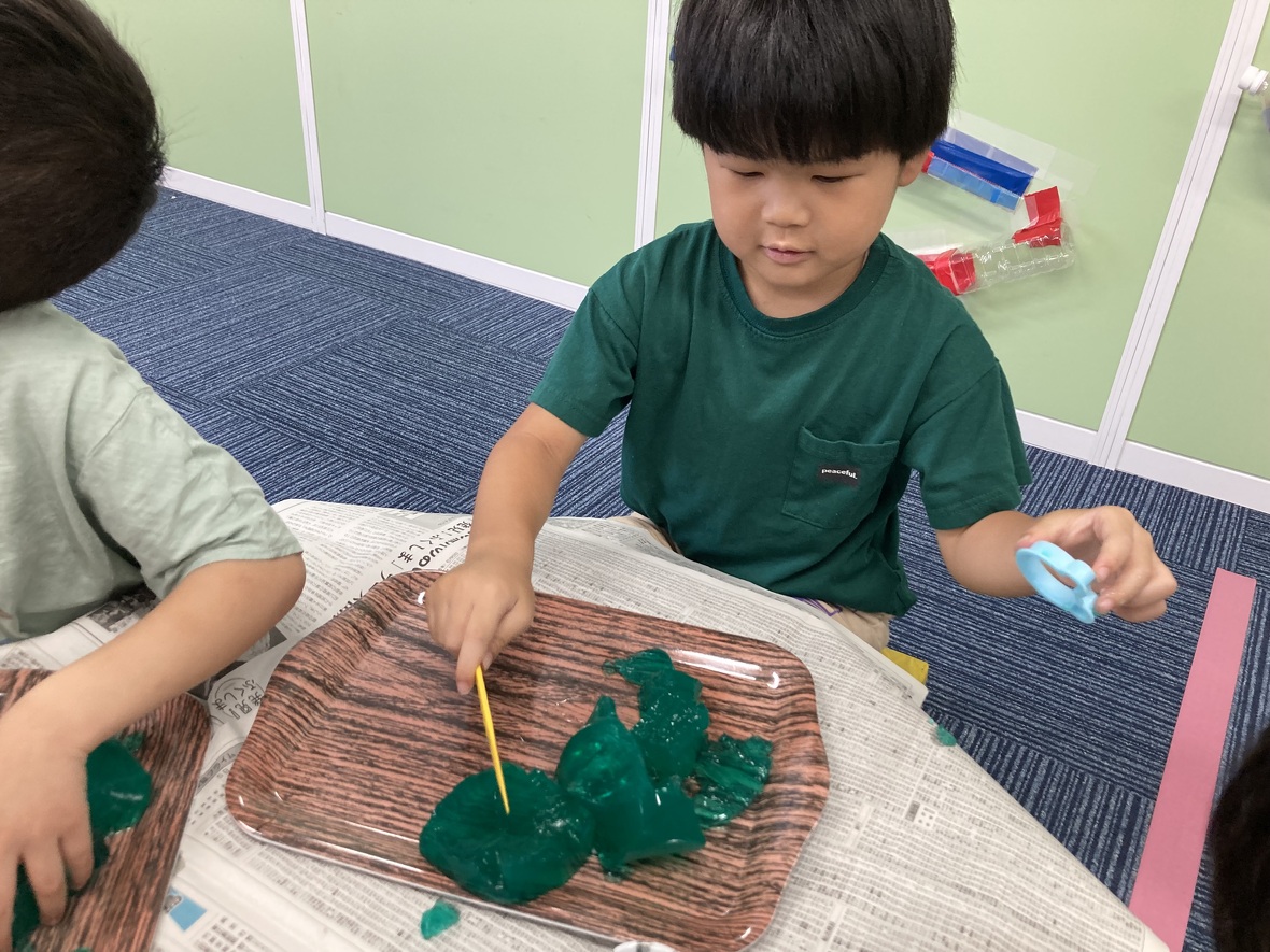 2023年07月17日(月) スタッフブログ 寒天のさわりごごちは? 食紅で色をつけた冷た~い寒天を使ったプログラム★最初はおそるおそるプラスティックのへらや型抜きを使って寒天のカタマリをカット!!少し慣れると思い切り素手で感触を楽しみました。