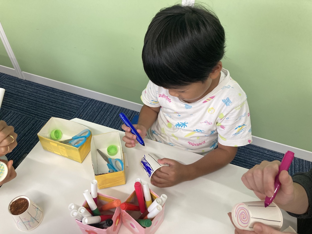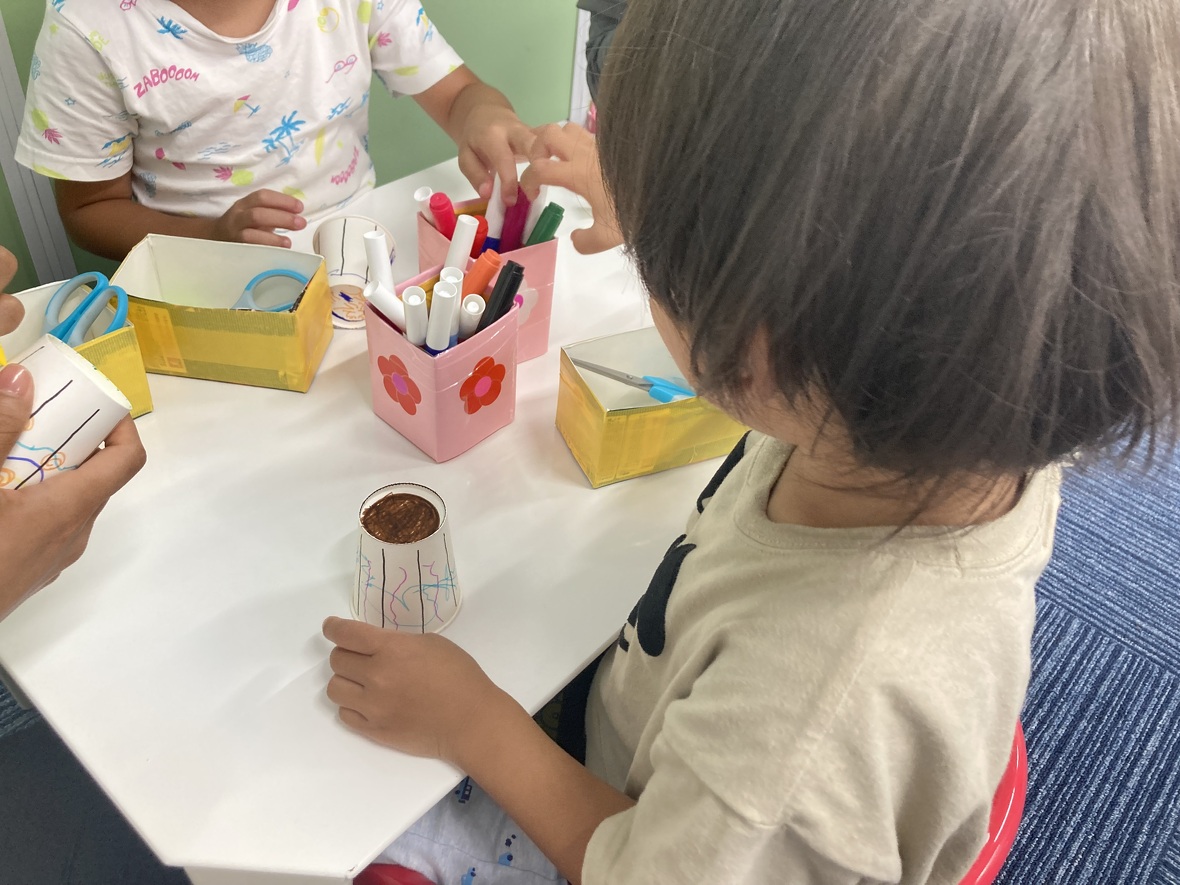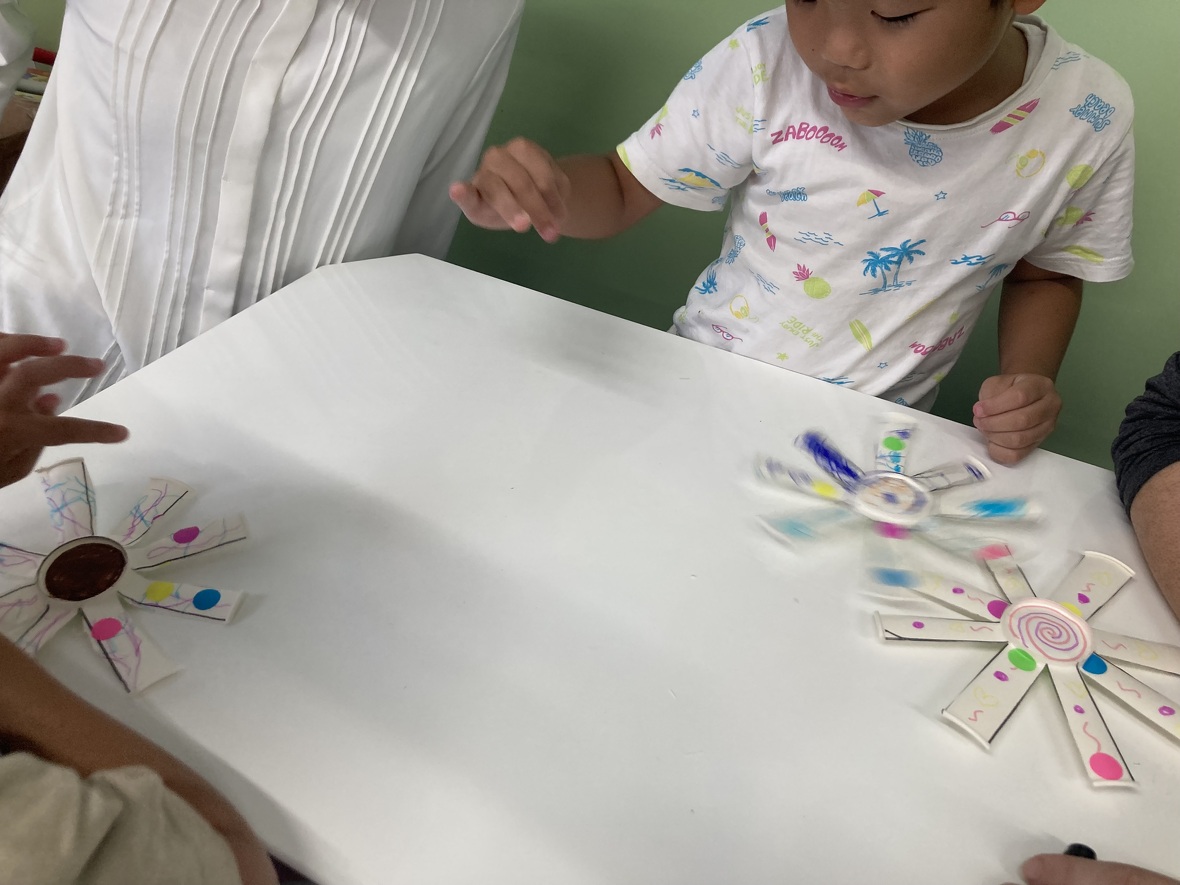 2023年08月02日(水) スタッフブログ 制作「コマを作ろう」紙コップで??? 今日は”制作”の日。なんと紙コップを使ってコマを作りました。まずは紙コップに好きな模様を描きましょう☆次はハサミでチョキチョキ切って♬出来上がったコマは、とてもよく回りましたよ!!