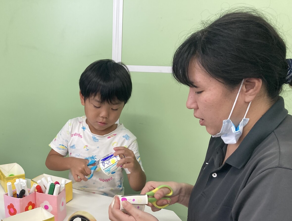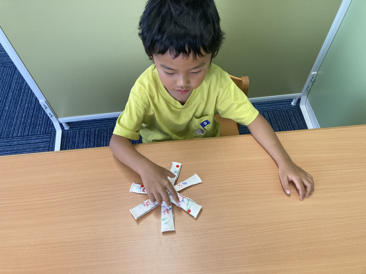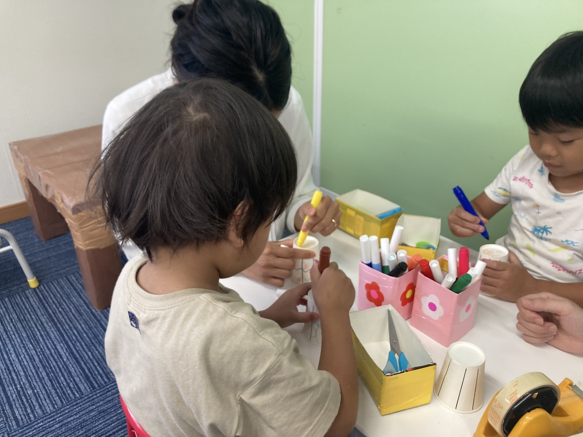 2023年08月02日(水) スタッフブログ 制作「コマを作ろう」紙コップで??? 今日は”制作”の日。なんと紙コップを使ってコマを作りました。まずは紙コップに好きな模様を描きましょう☆次はハサミでチョキチョキ切って♬出来上がったコマは、とてもよく回りましたよ!!