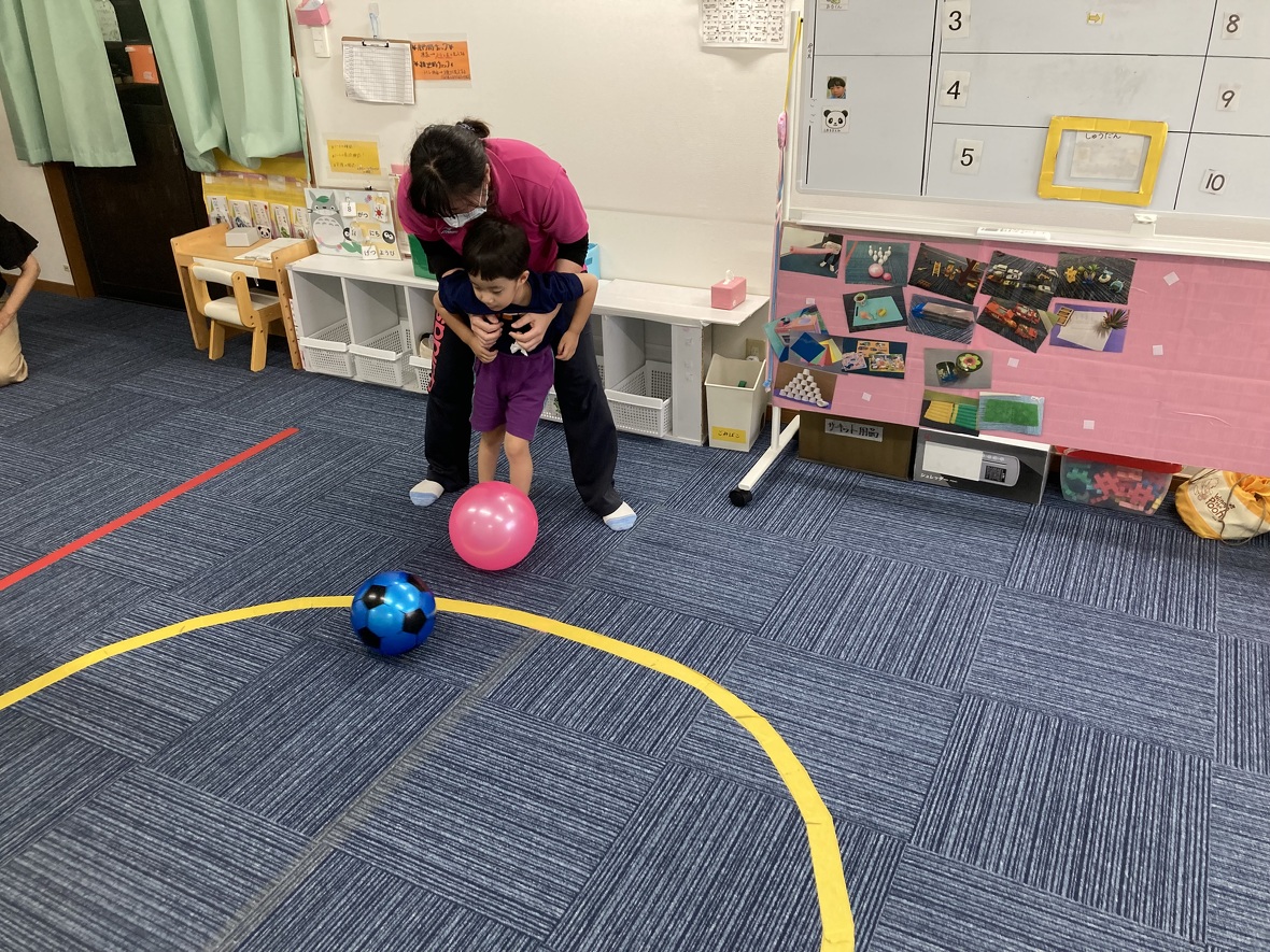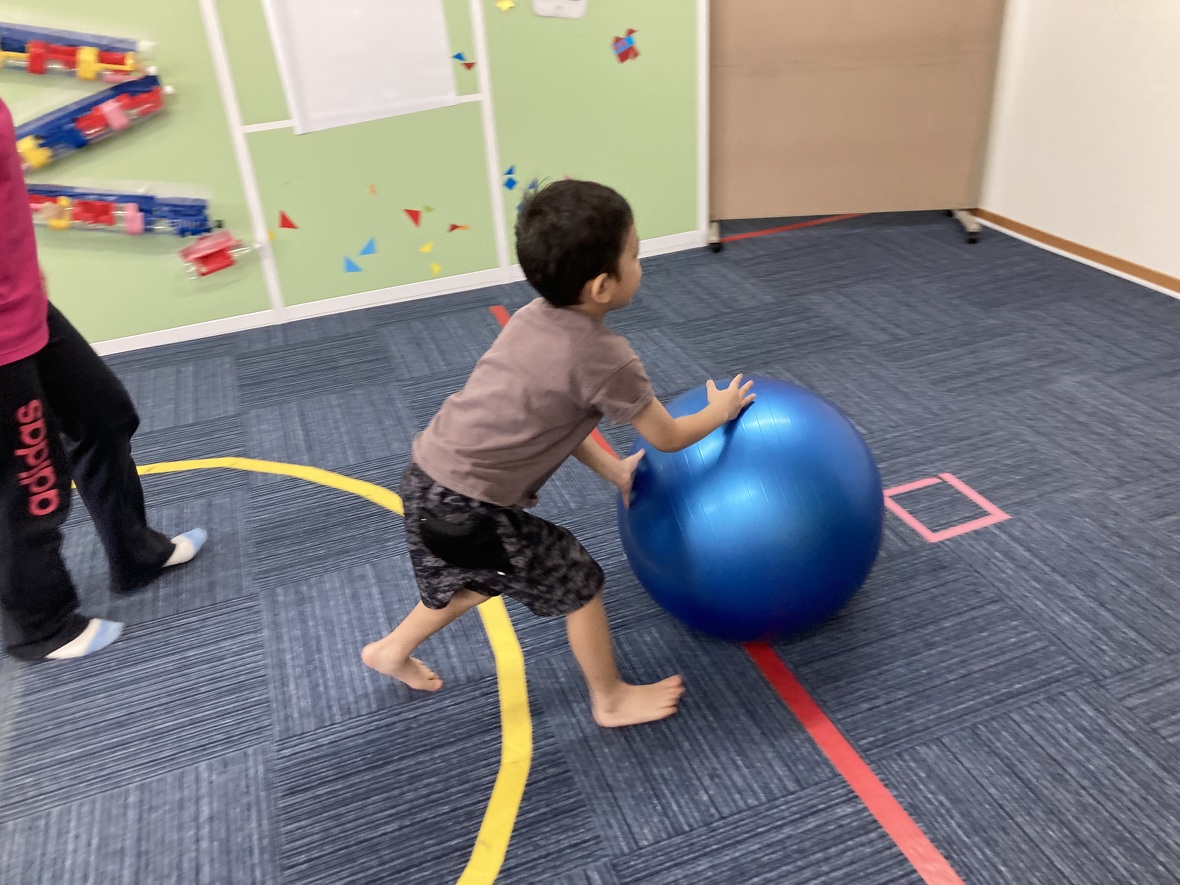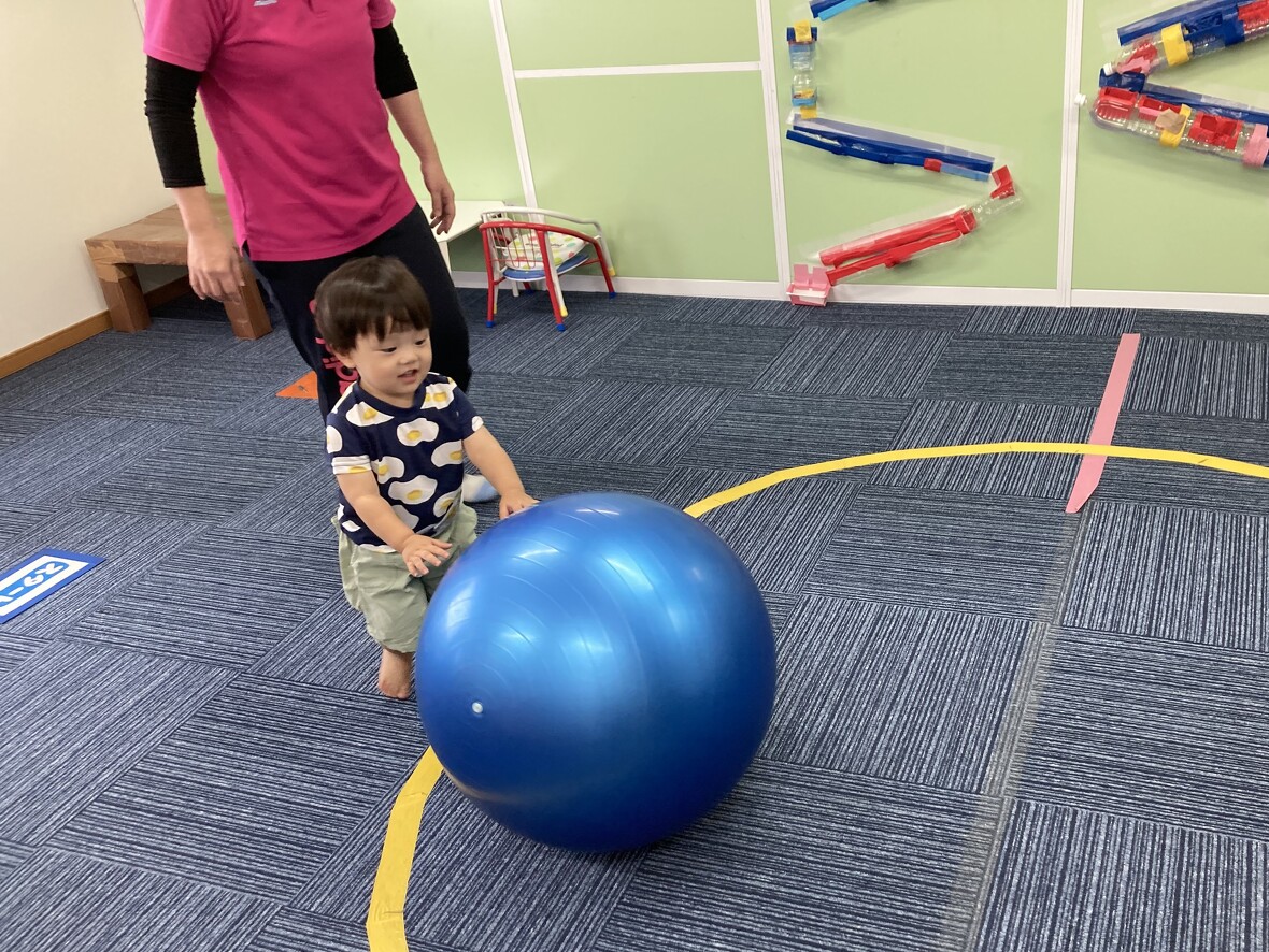 2023年08月14日(月) スタッフブログ ボールを使ってバランス遊び!! 今日は大きなボールを使って、バランスの練習☆ちょっと難しかったけど、がんばってチャレンジしました。 大きなバランスボールをコロコロ 体よりも大きなボール!!! ボールに乗って”おっとっと”!