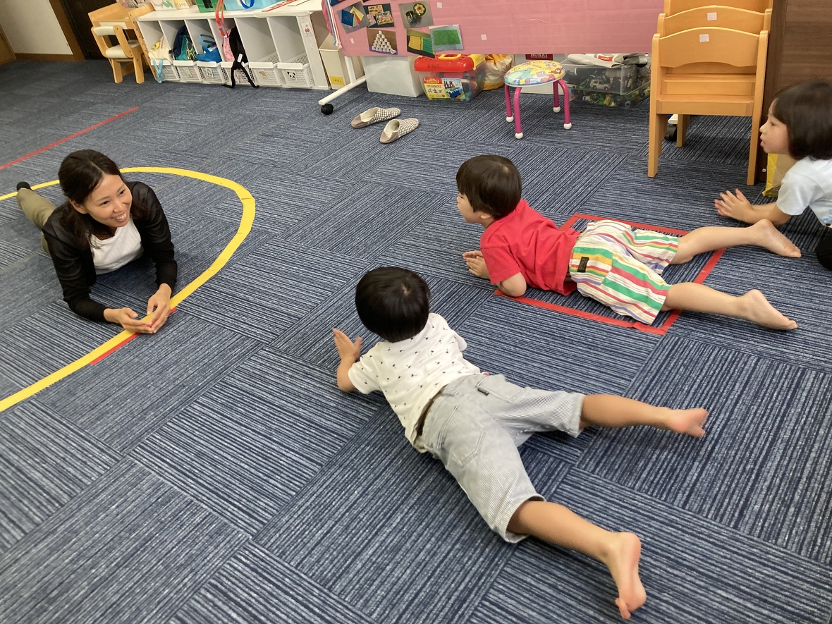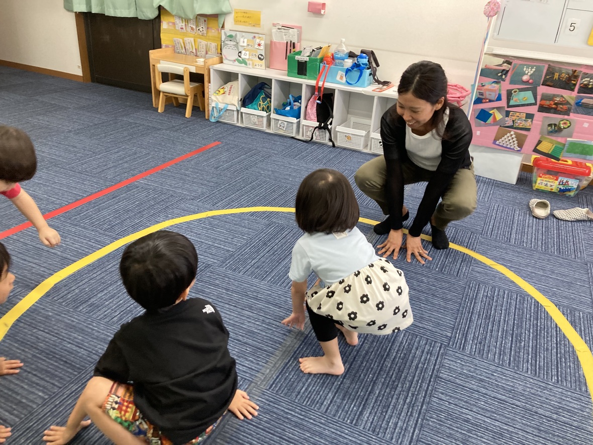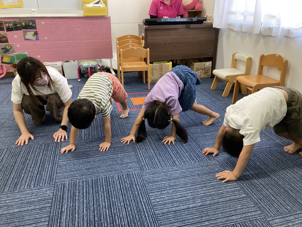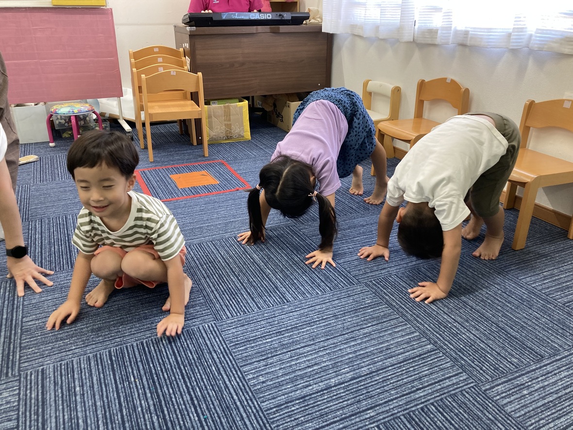 2023年08月22日(火) スタッフブログ リトミックでいろいろな動物になってみよう♬♬ リトミックは、子どもの運動能力や自由な表現力を培う活動で、音楽に合わせて動物の物まねをしたり、テンポを変化させながら体を動かしていきます。最初は先生の見本の動きを真似することからはじめますが、少しずつ自由に動きを表現することで感性を養うことにつながります。 ド♬レ♬ミ♬ カエルかな? ワニさん? こんなにしっかり踵が上がっています ネコの背伸び~