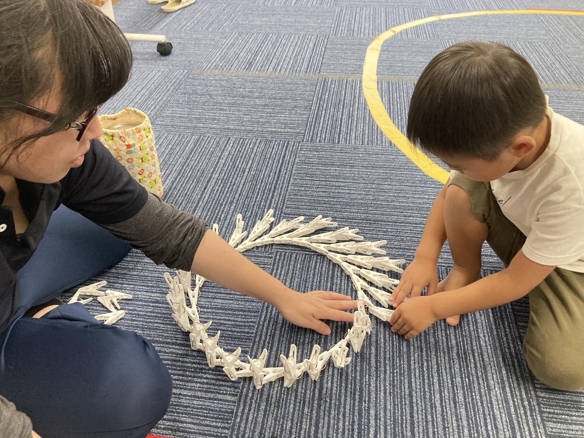 洗濯ばさみは、指の運動の練習に最適です!きれいな丸い円ができました。その後は近くの公園の木陰で過ごしました。