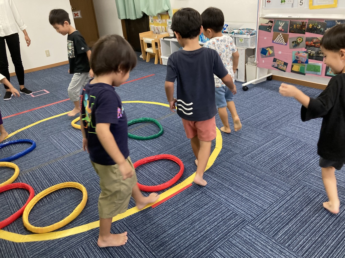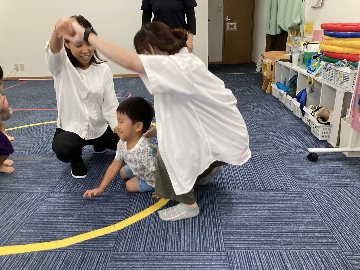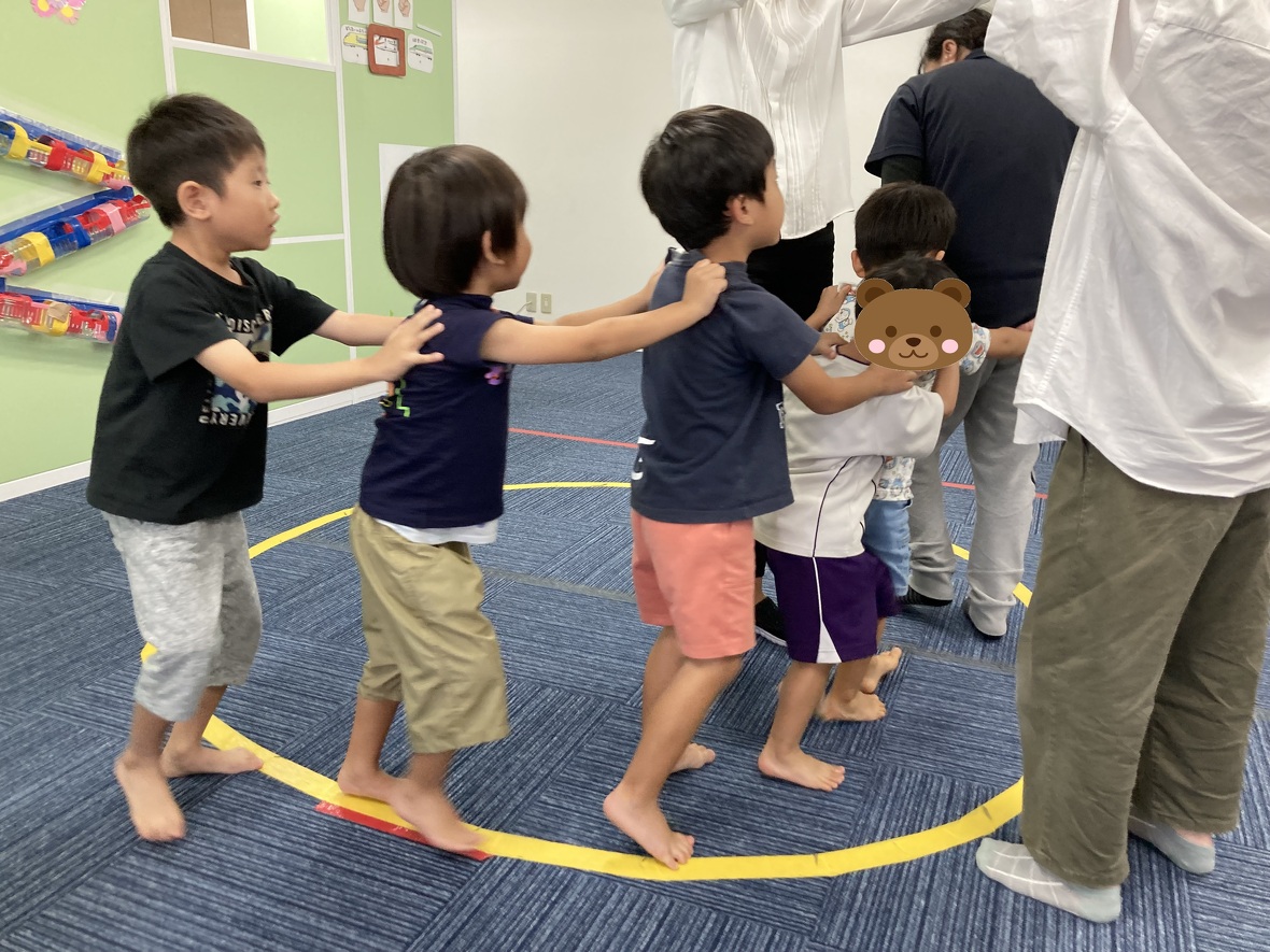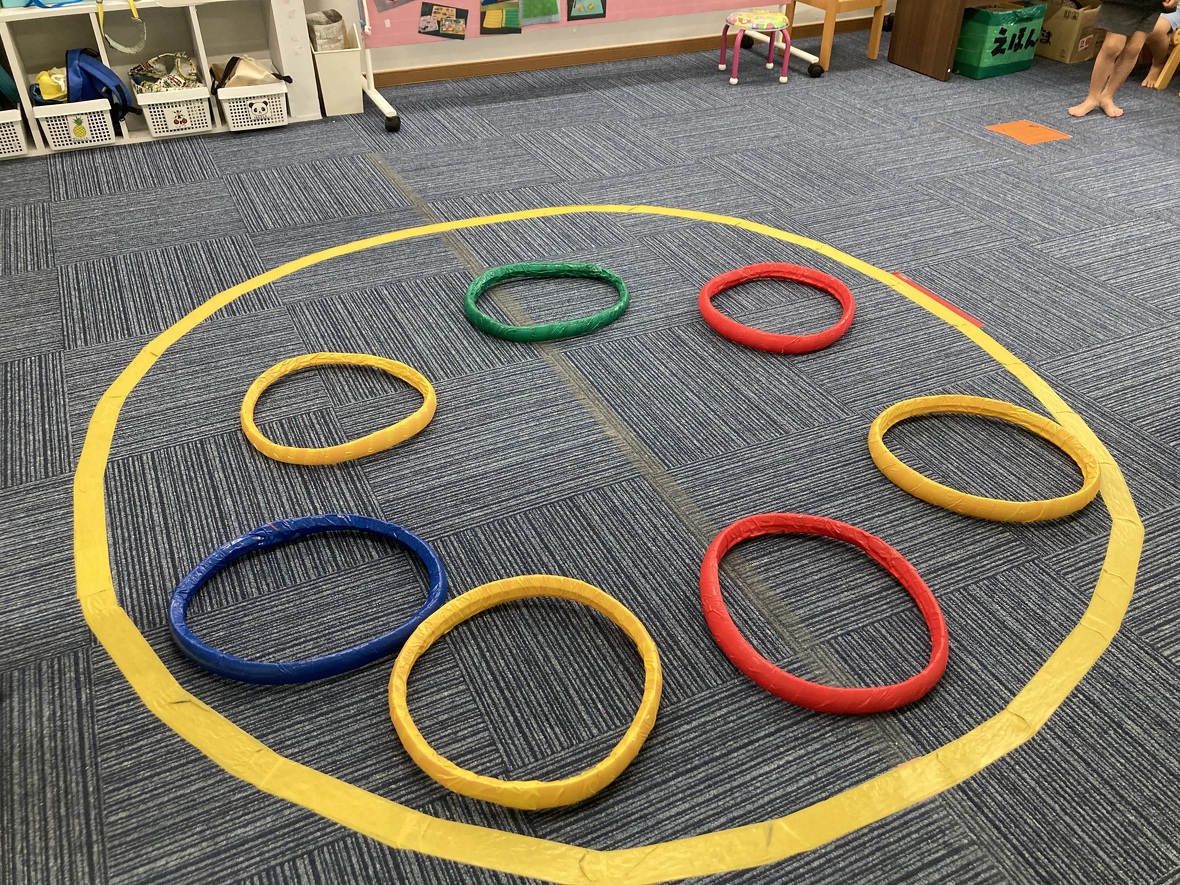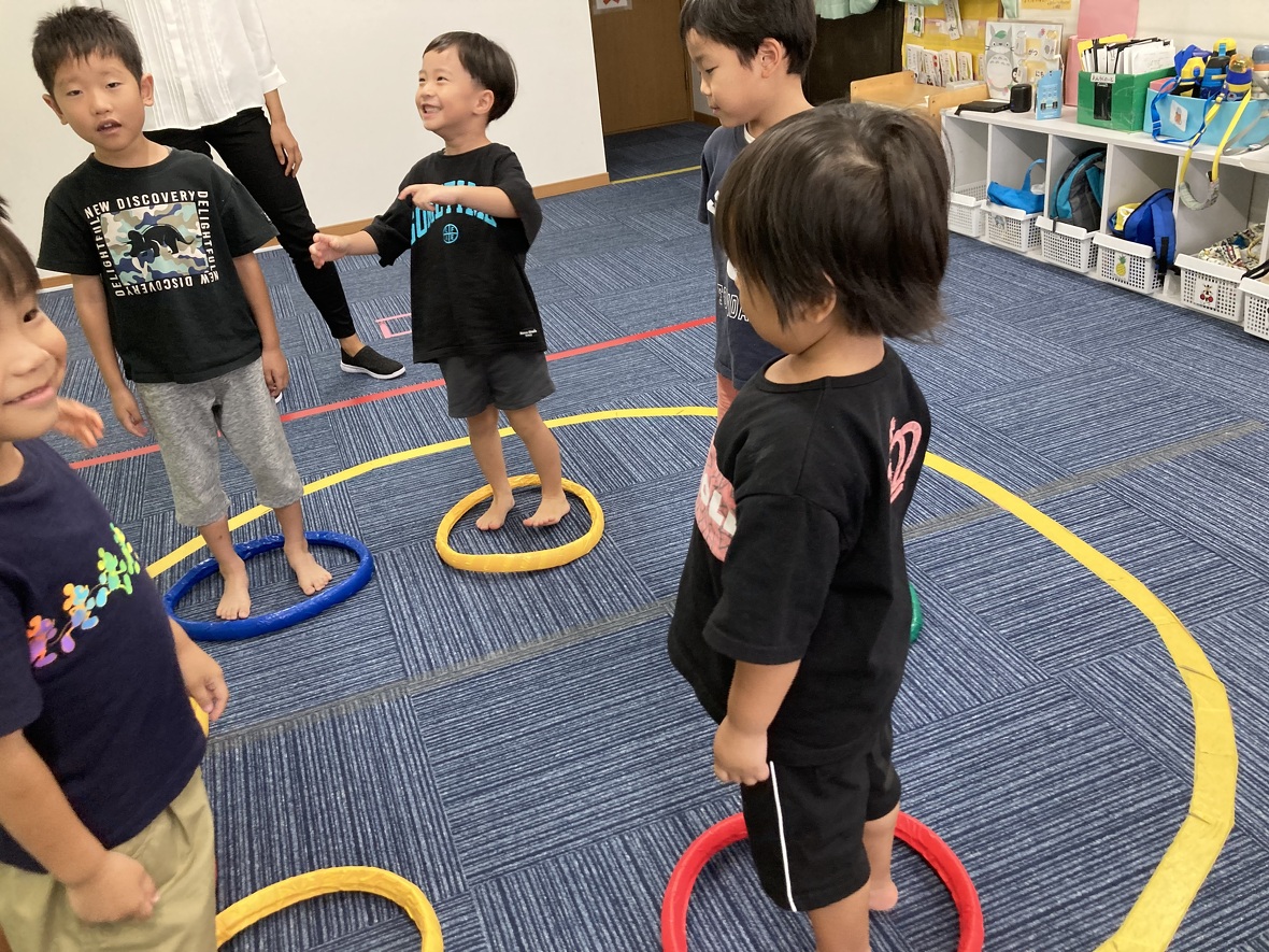 2023年09月20日(水) スタッフブログ みんなでルールのある遊びを楽しもう!! イス取りゲームならぬ”フープ取りゲーム!”音楽が止まったらフープの中に入ります。フープの数はどんどん少なくなって・・・。 ”ロンドン橋”は二人の先生が作った”吊り橋”をくぐっていきます。「ロンドン橋落ちた~♬落ちた~♬落ちた~♬」歌が終わると、橋が落ちてきます!!!自分のゲームが終わっても、お友だちをしっかり応援していました。