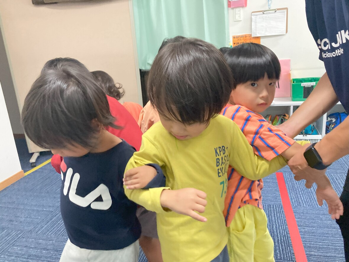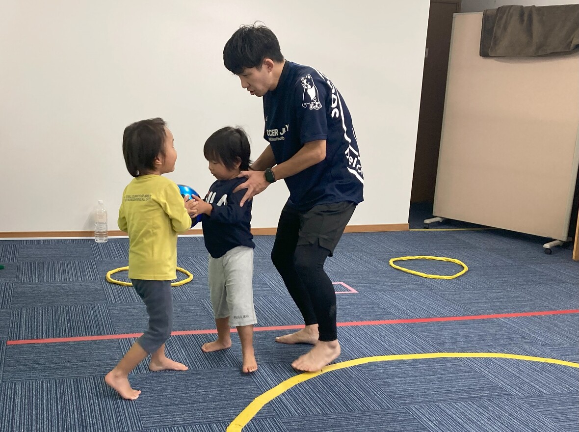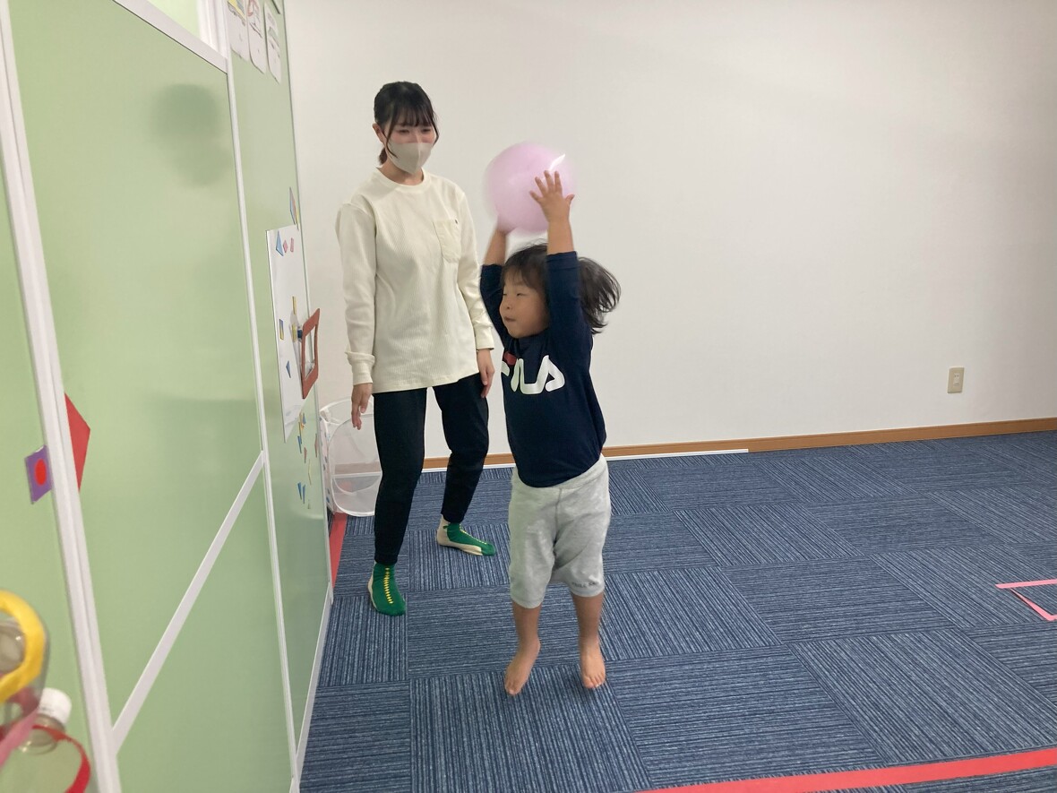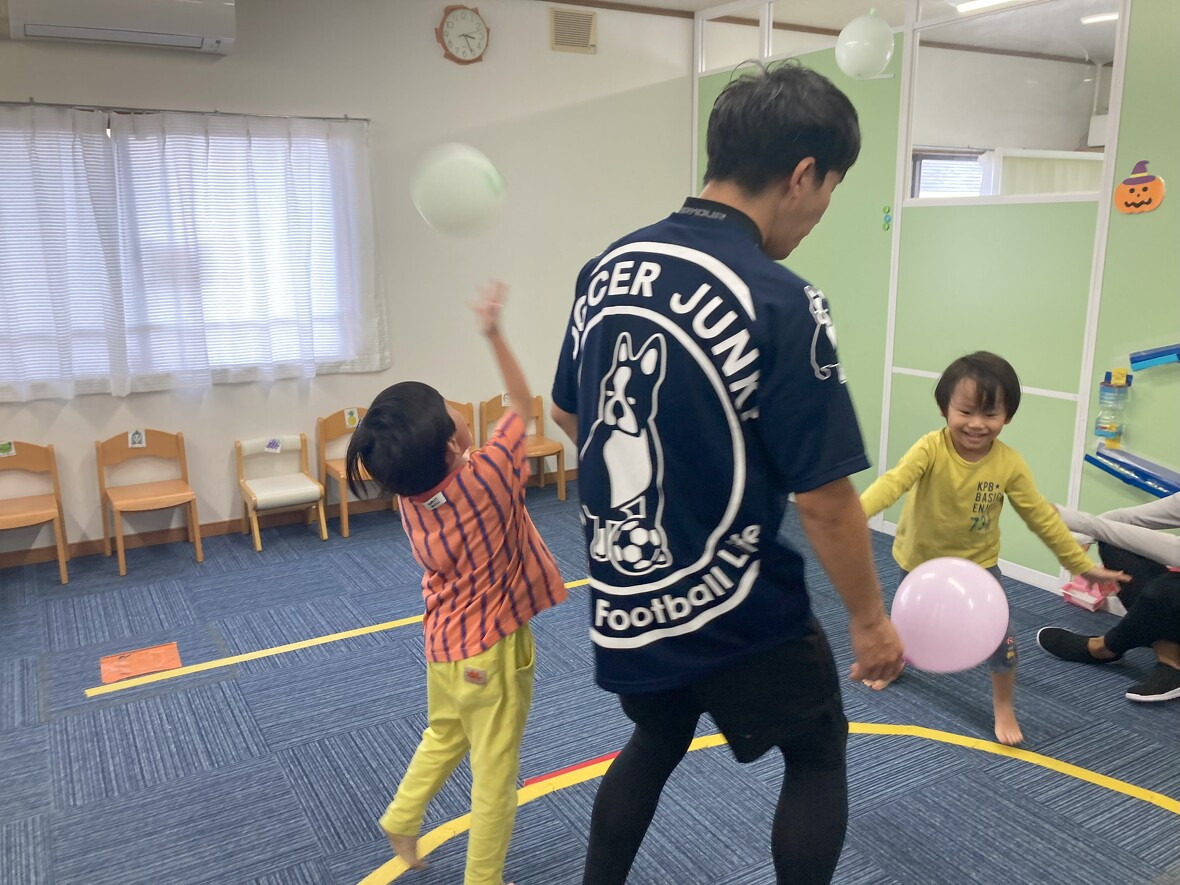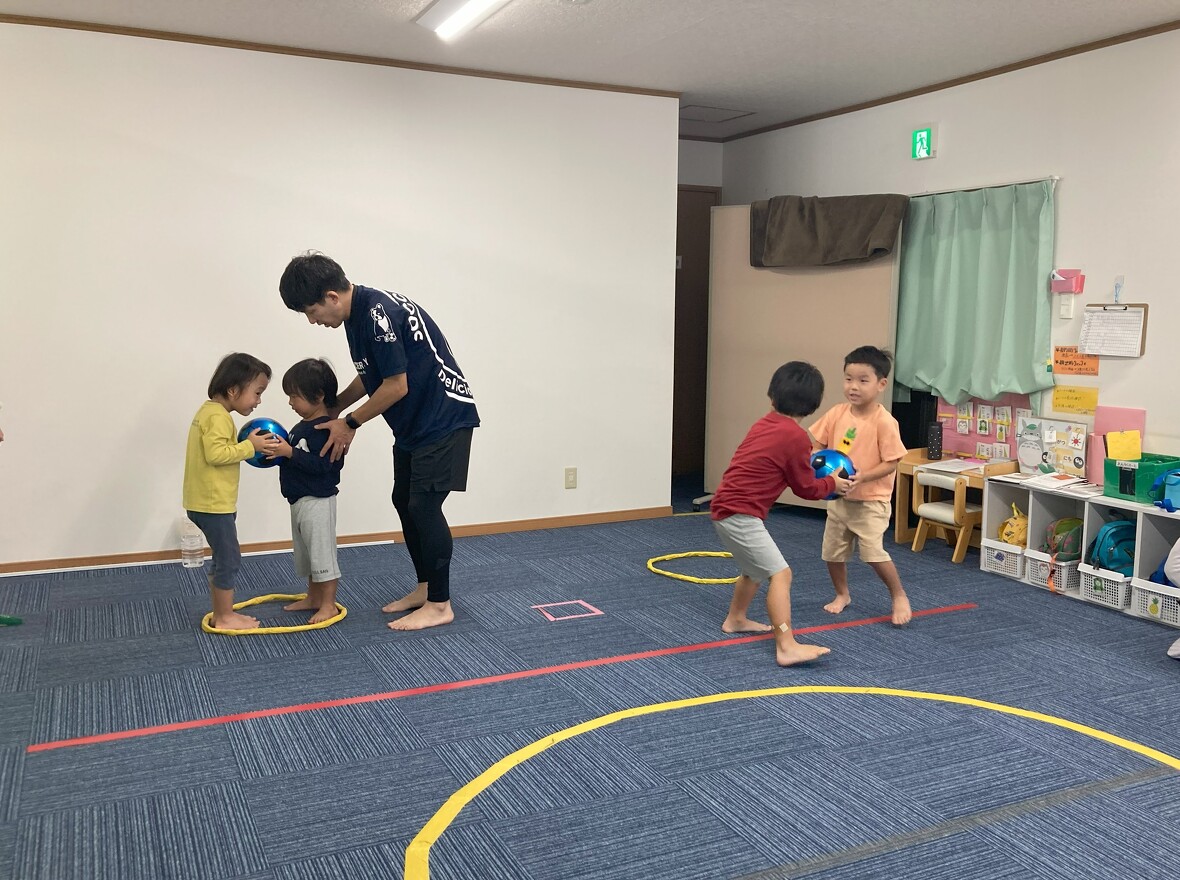 2023年10月13日(金) スタッフブログ タカ先生とボール遊びにチャレンジ!!! ボールを投げたり、蹴ったりするだけではなく、みんなで力を合わせて床に落とさないように運ぶなど、いろいろな遊びを行いました。