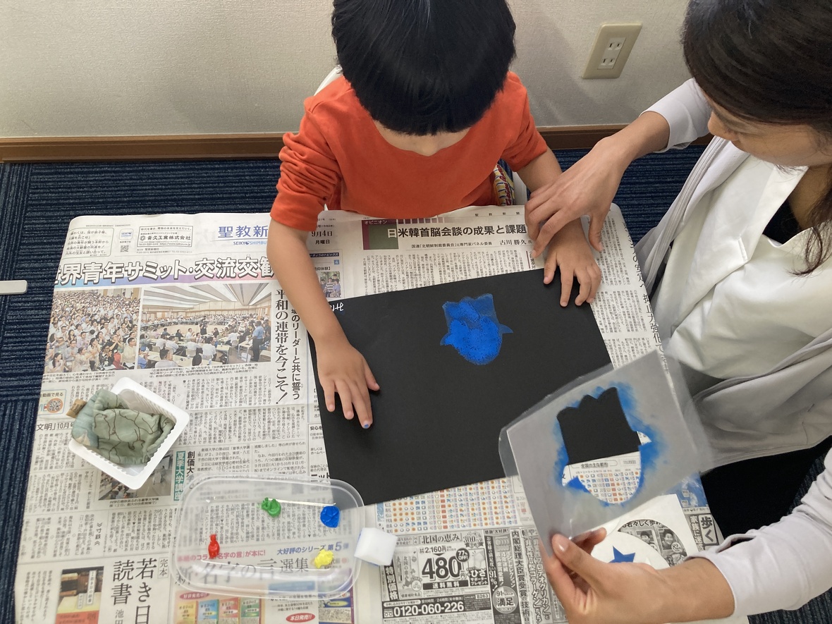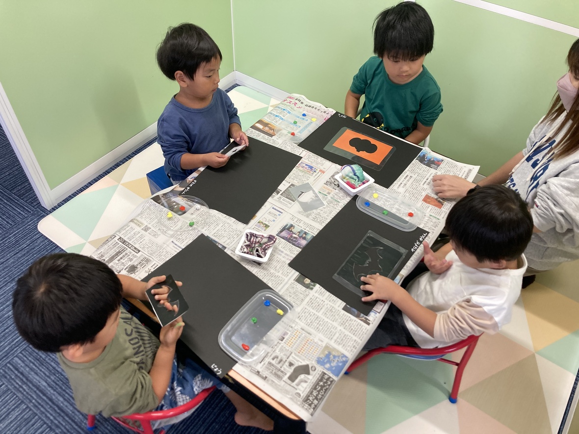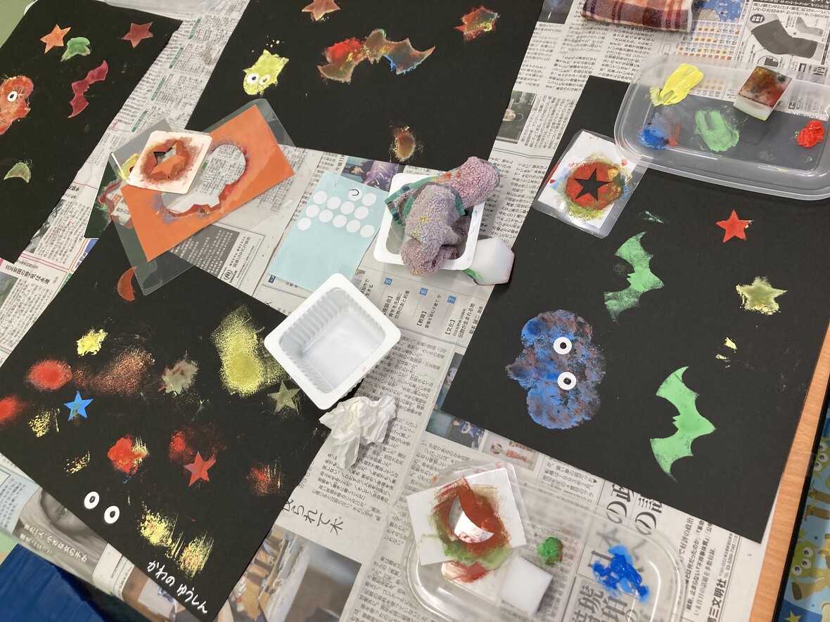 2023年10月20日(金) スタッフブログ ”ステンシル”で、ハロウィンの飾りを作りました!! ”かぼちゃ”や”コウモリ”、”おばけ”など、かわいいハロウィンのキャラクターを型紙を使って台紙にプリントしました。同じ型紙でも、色を工夫して、みんなステキな特色のあるできあがりとなりましたよ!!!